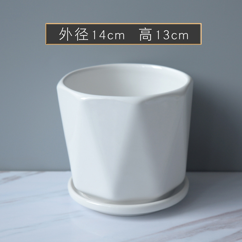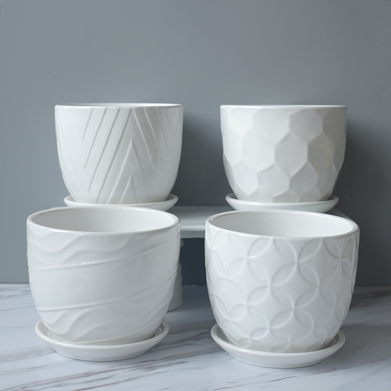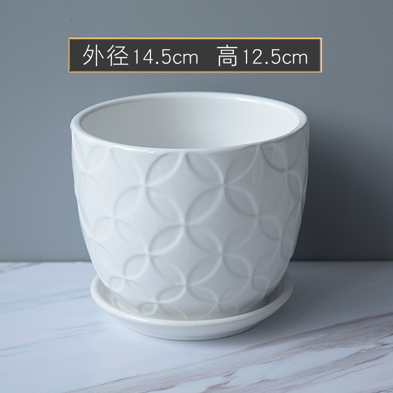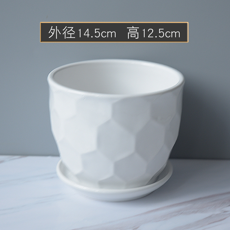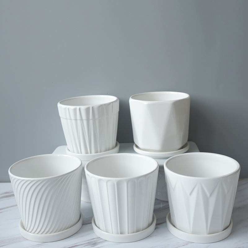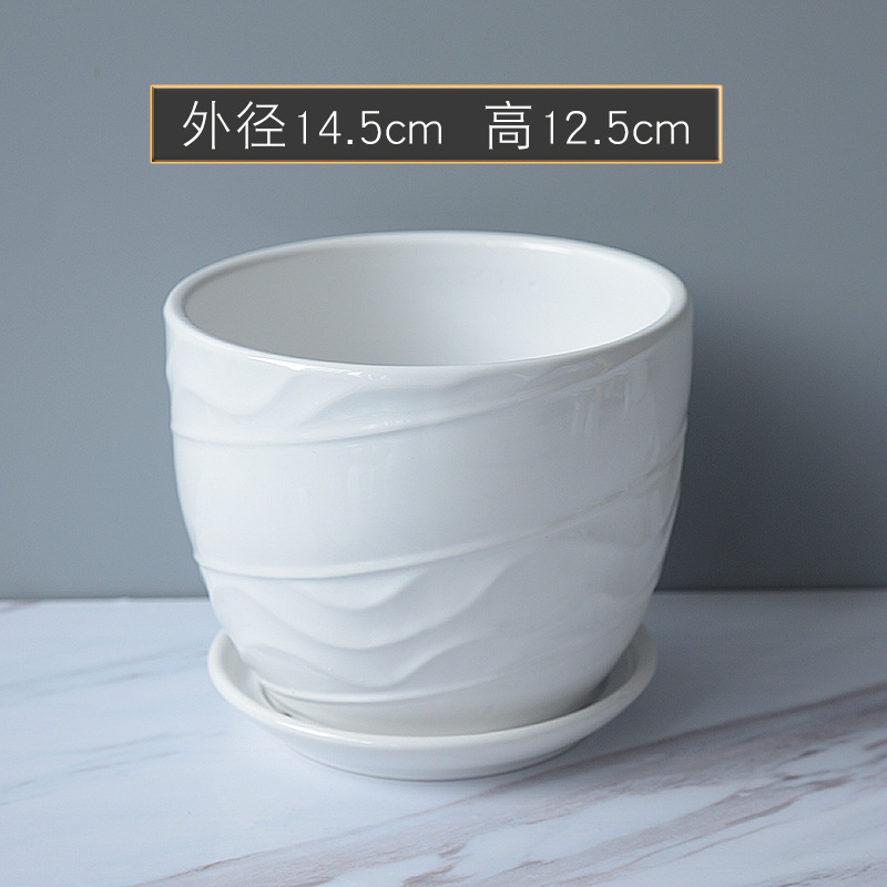 亚马逊陶瓷花盆带托盘办公室多肉花盆白色条纹阳台绿植盆花架批发