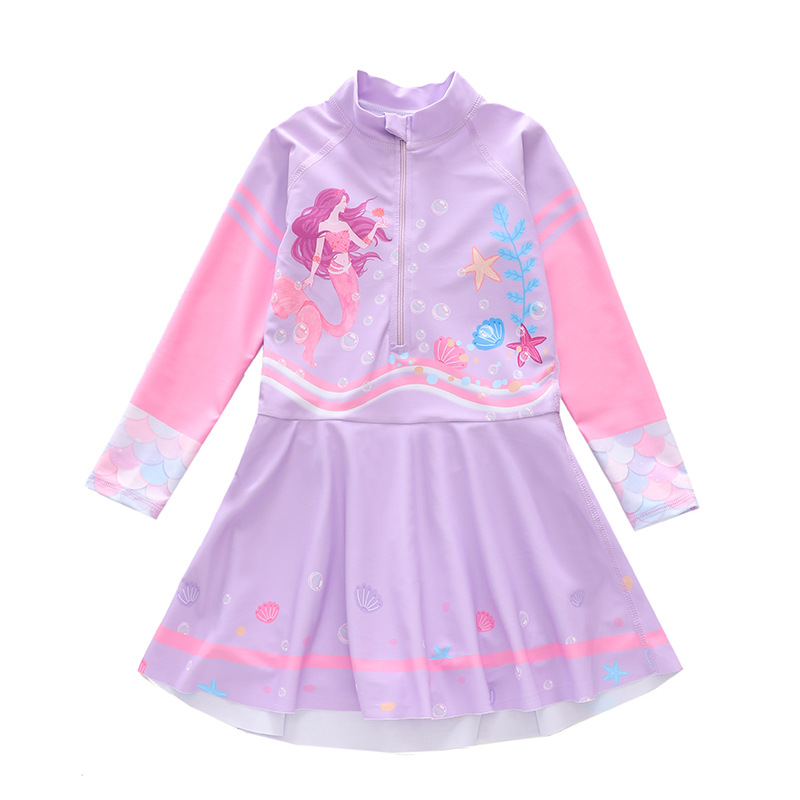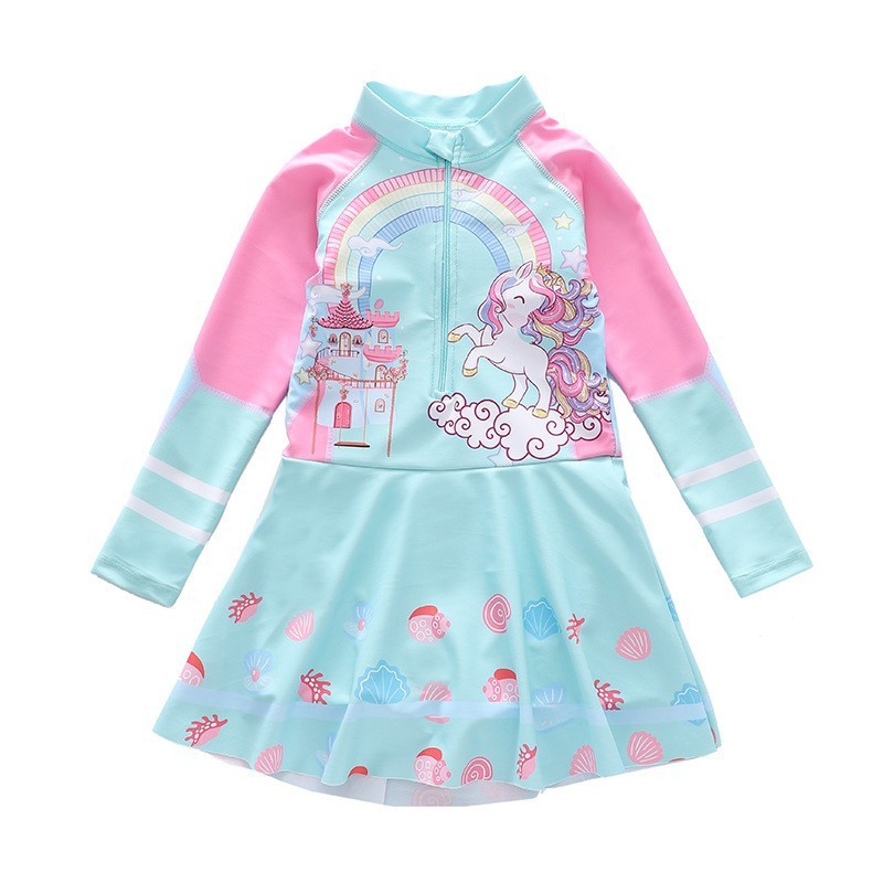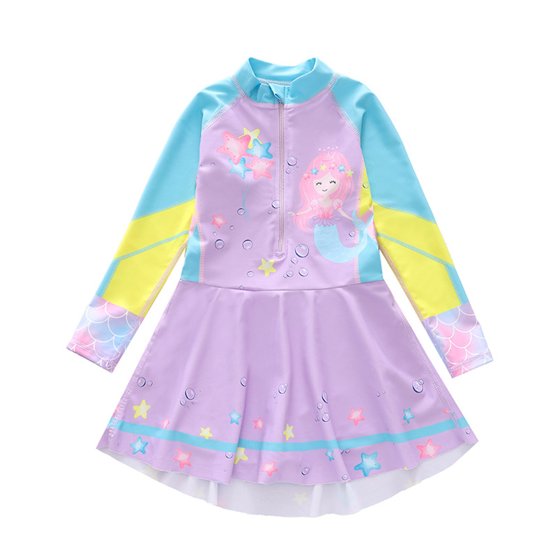 新儿童泳衣女连体裙式长袖泳装平角中大童防晒运动潜水女童游泳衣