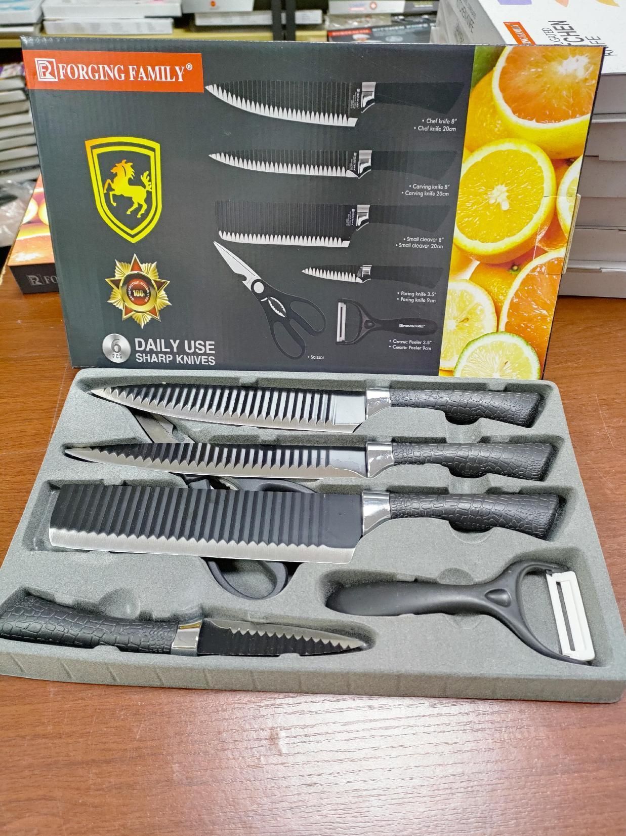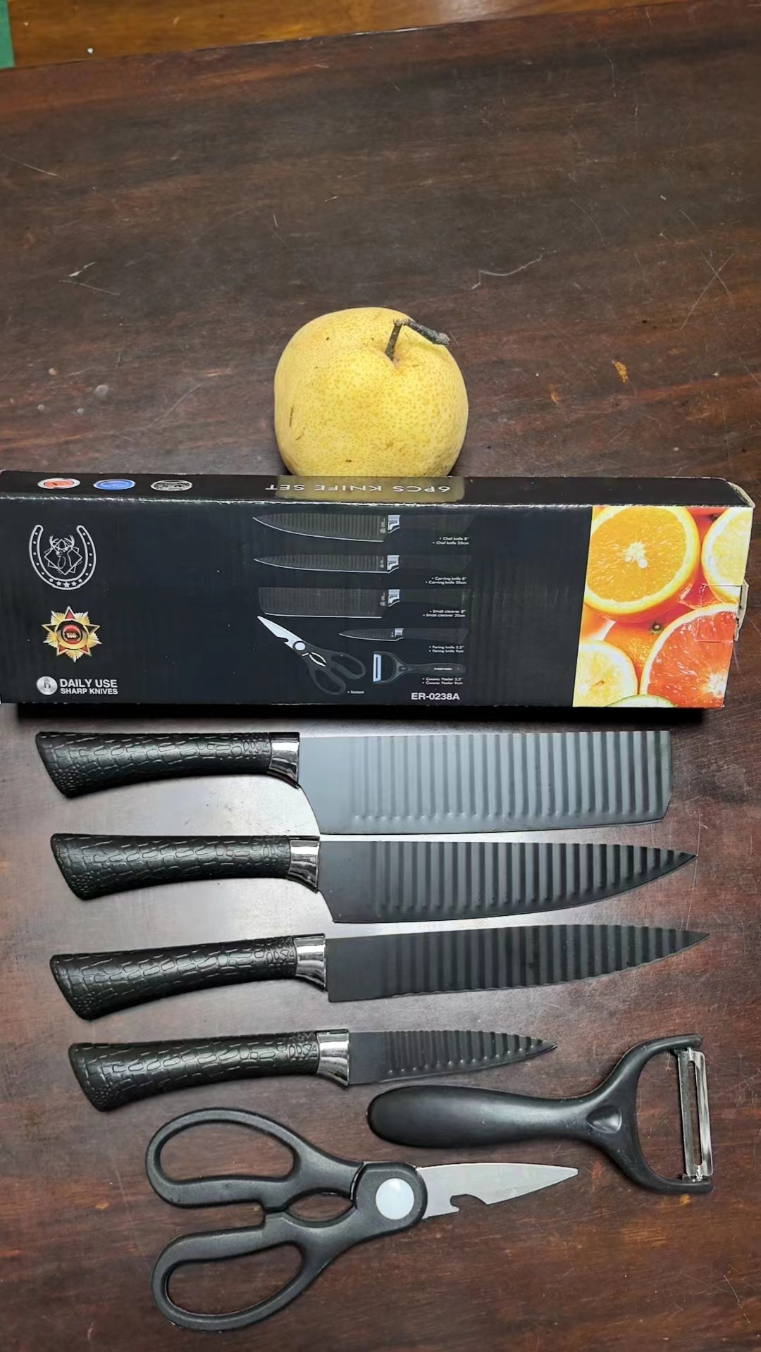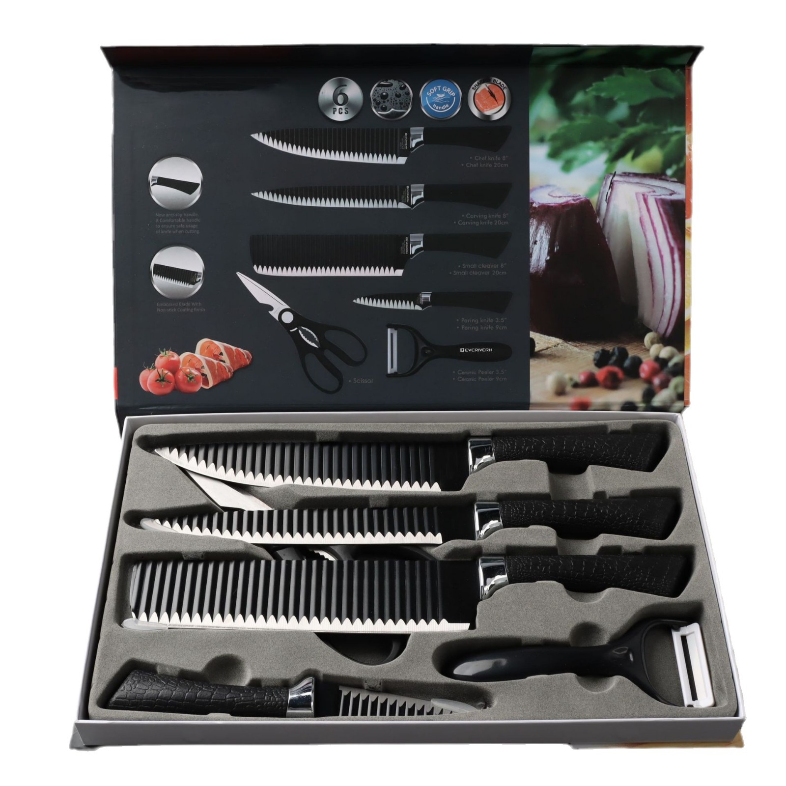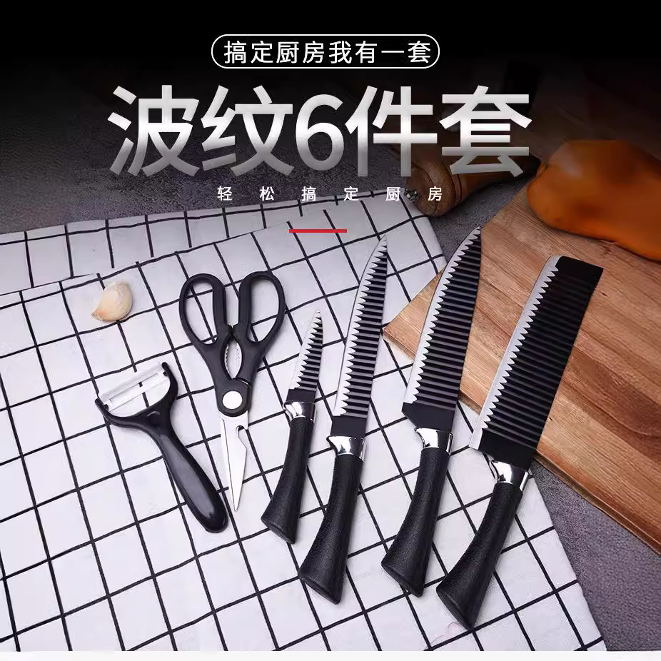 厨房刀具套装礼品套刀马蹄柄不粘漆扎纹菜刀黑色波浪纹六件套刀具