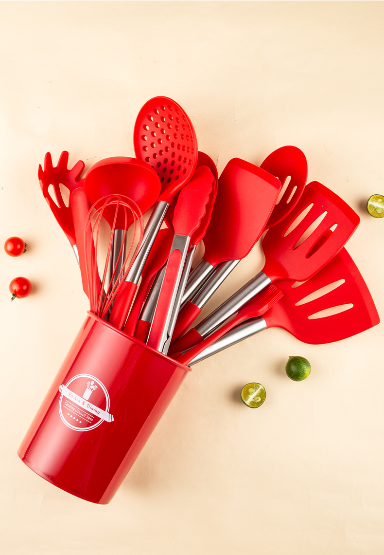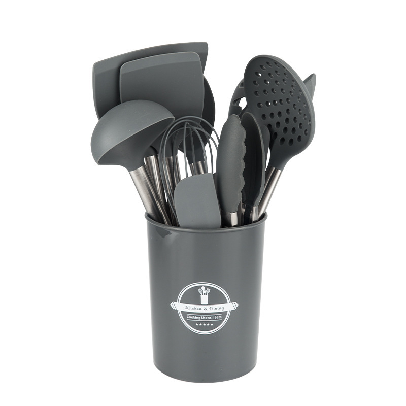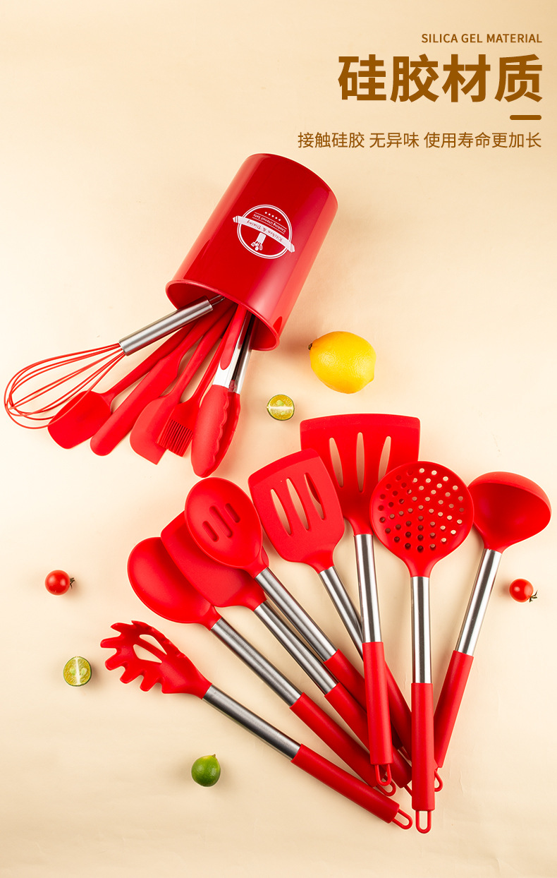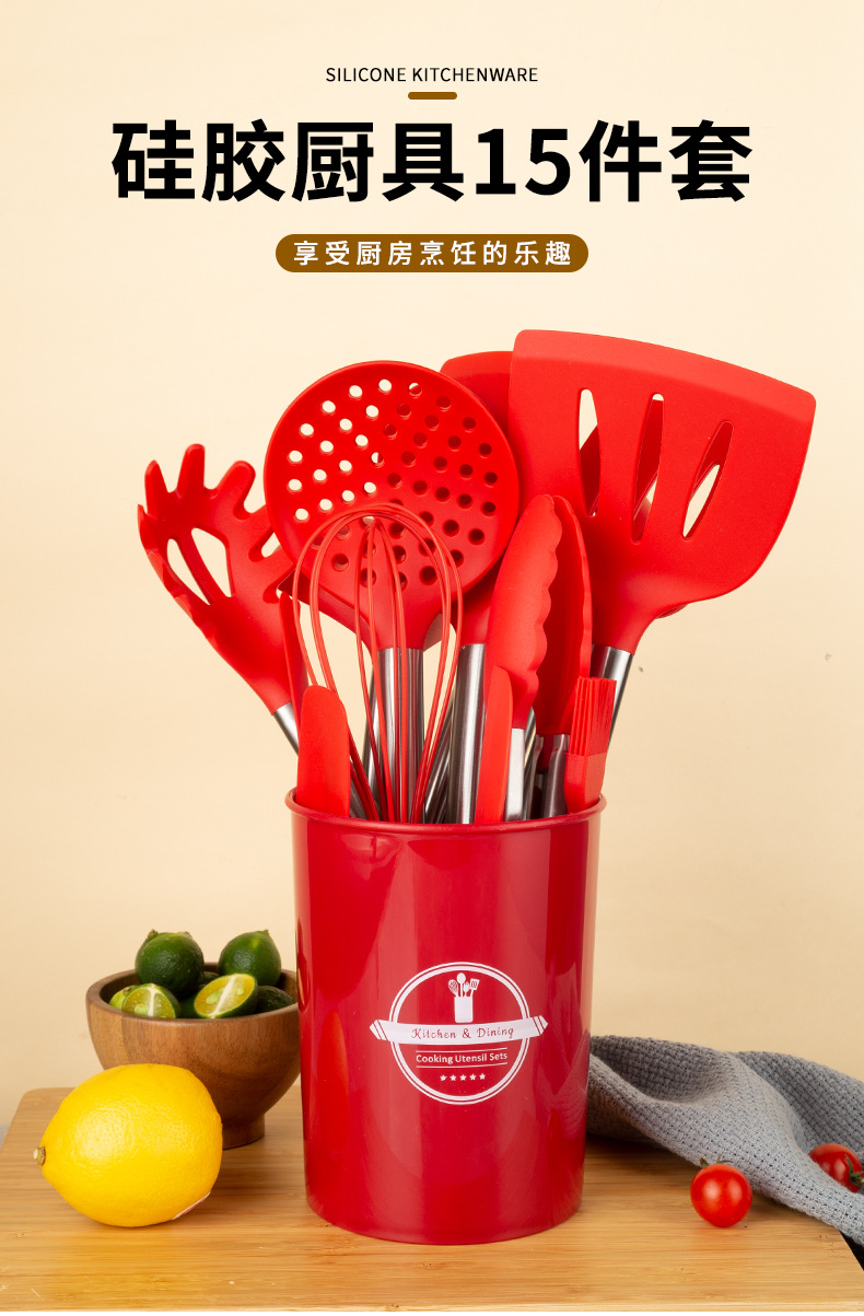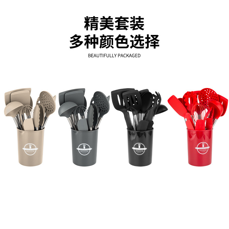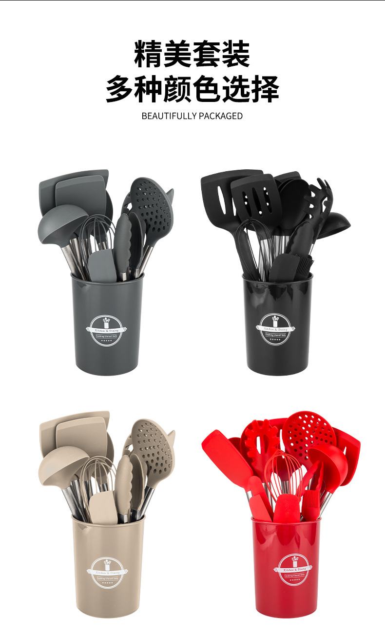 不锈钢管柄硅胶厨具厨房烹饪勺铲烘焙工具收纳桶厨房工具套装厂家