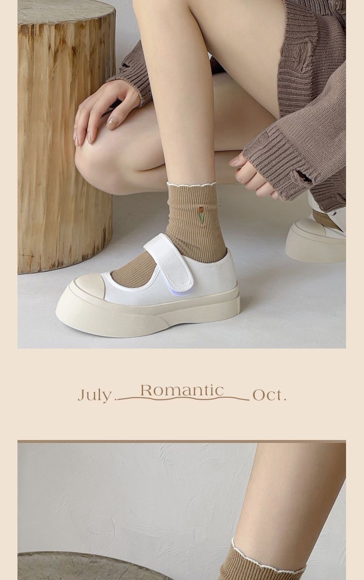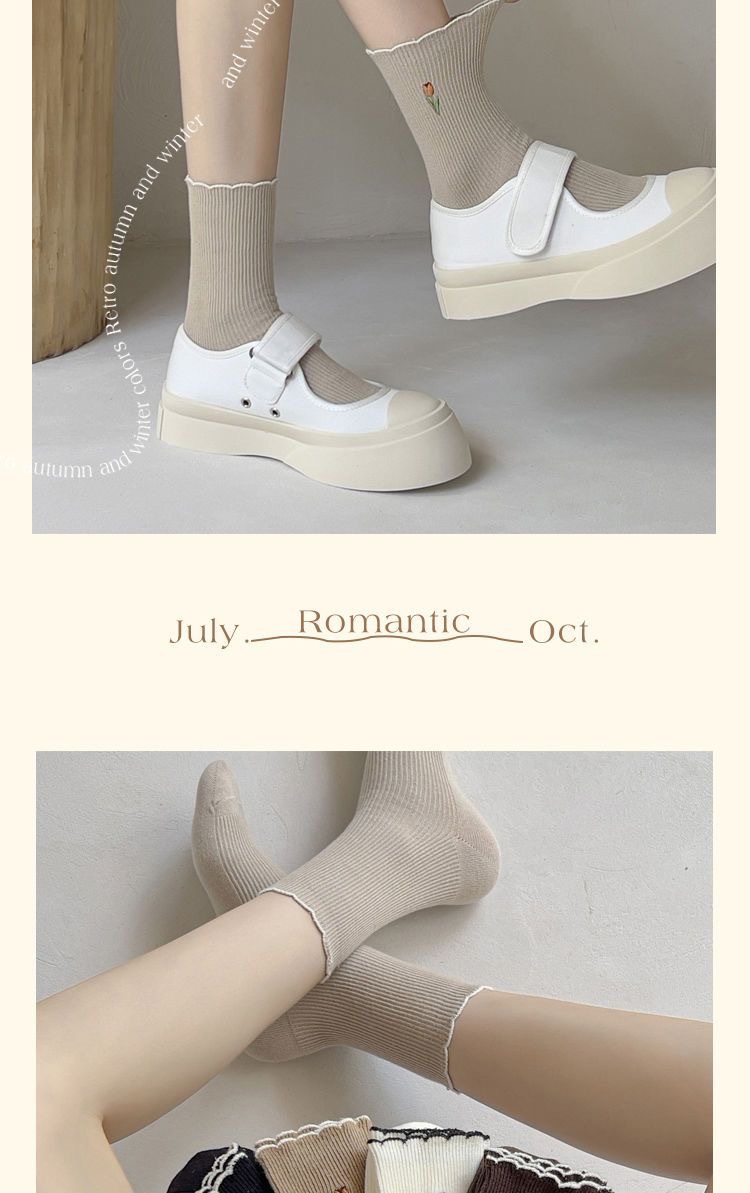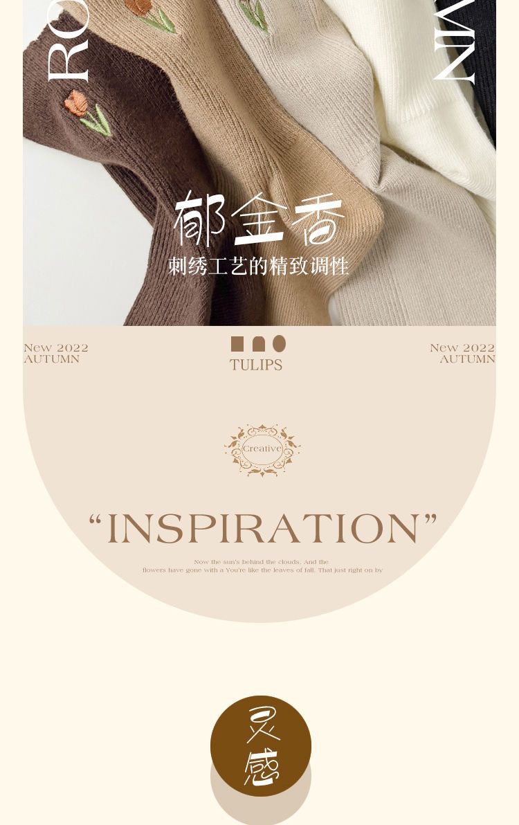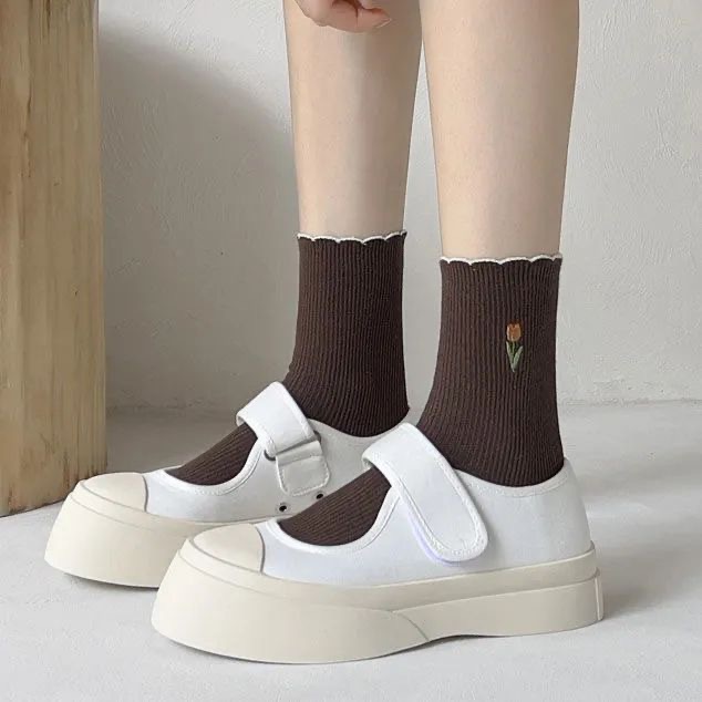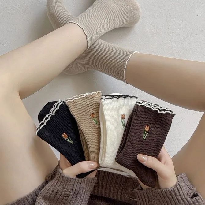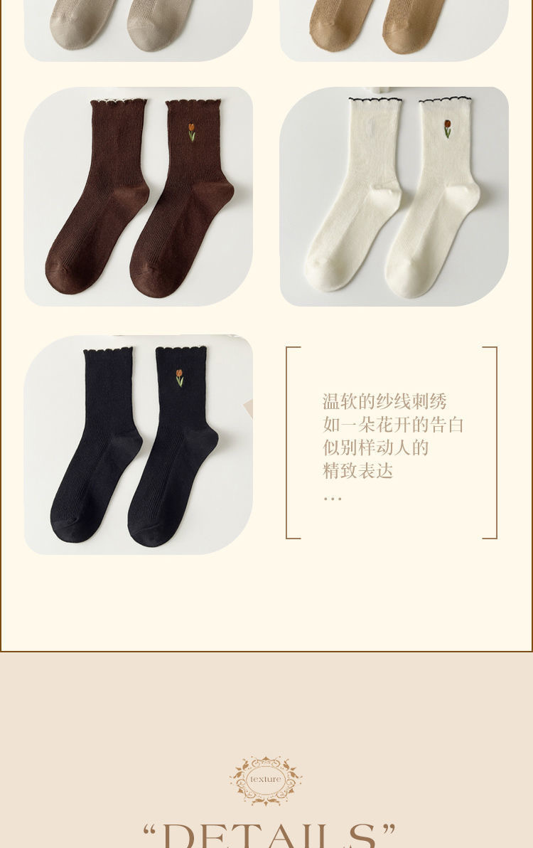 长袜子女款秋冬季可爱森系中筒堆堆袜咖色郁金香花朵诸暨袜子批发
