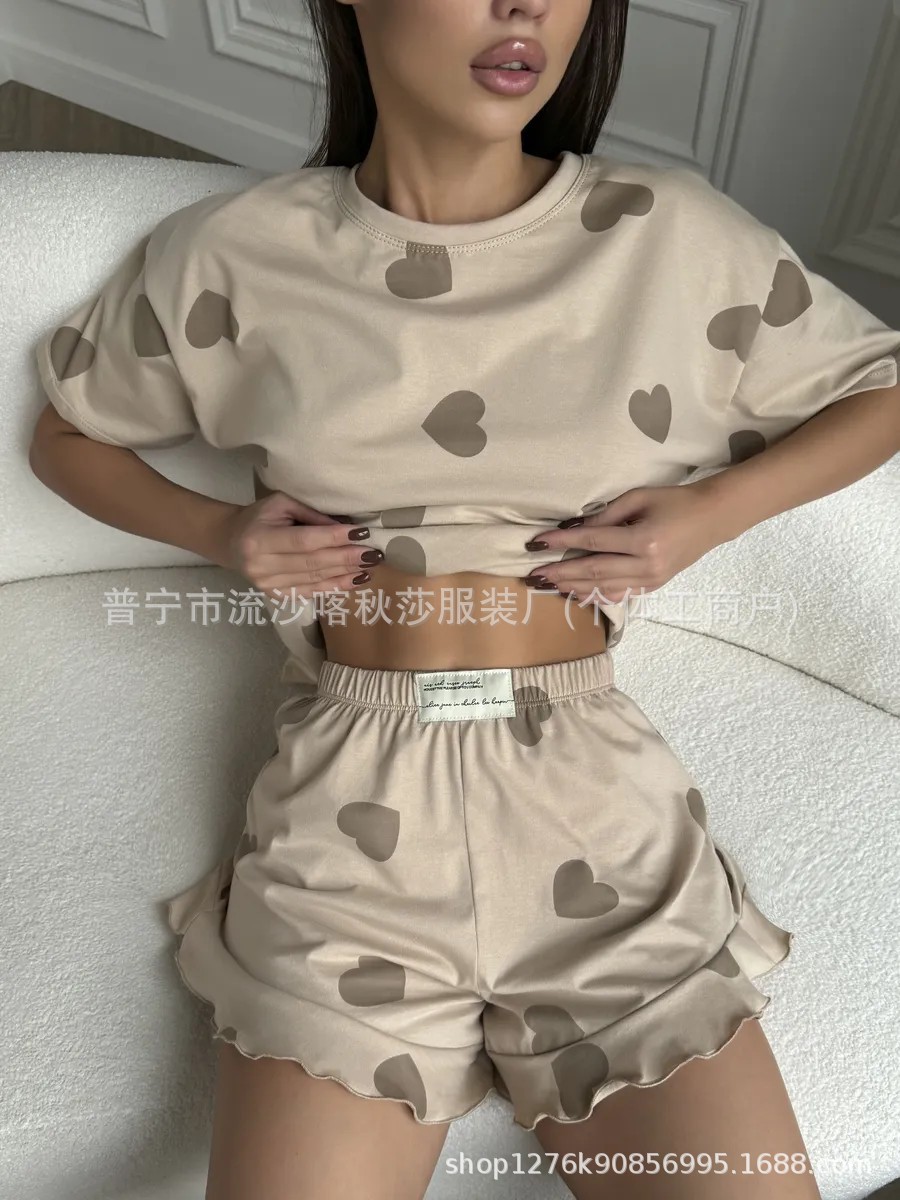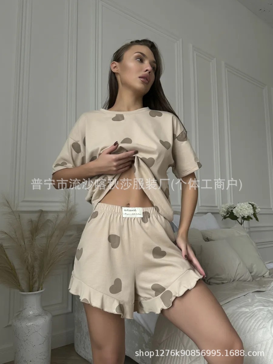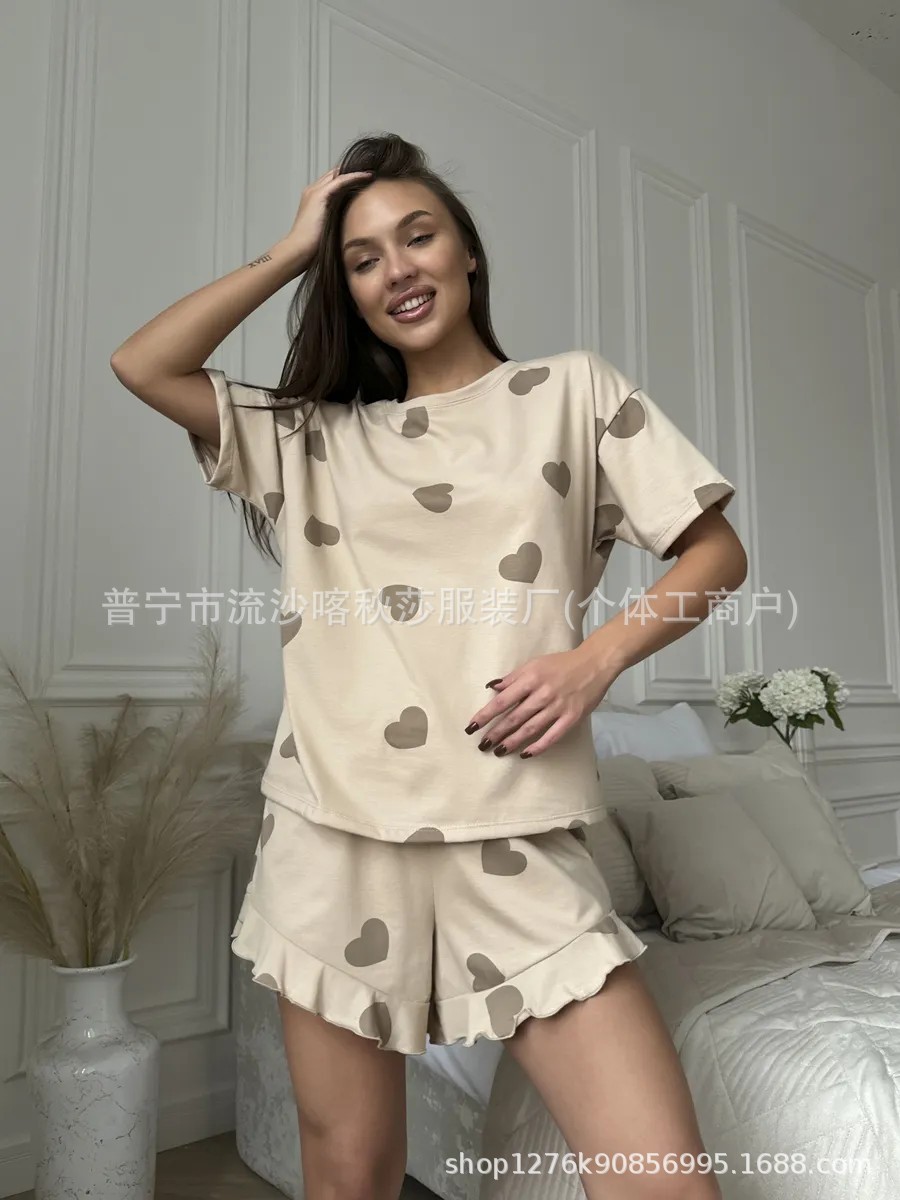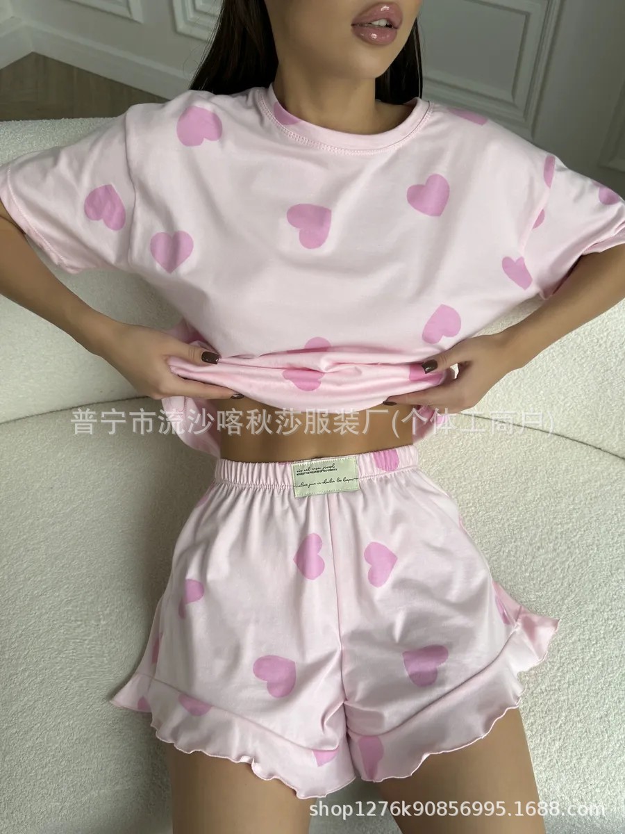 欧美wildberries跨境睡衣爱心短袖短裤可外穿女士家居服两件套装