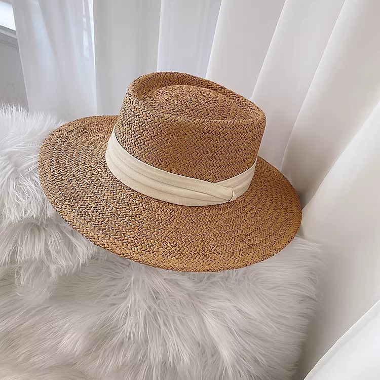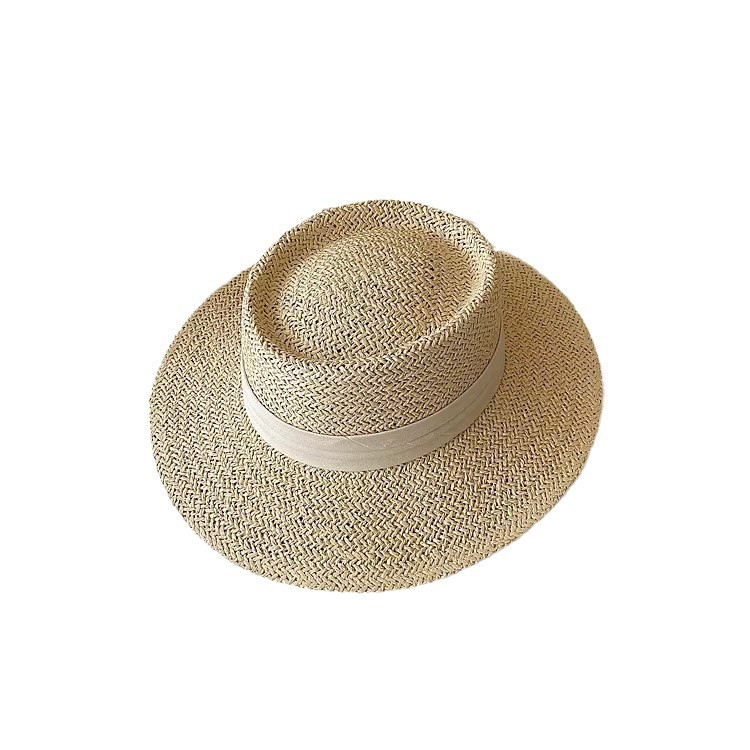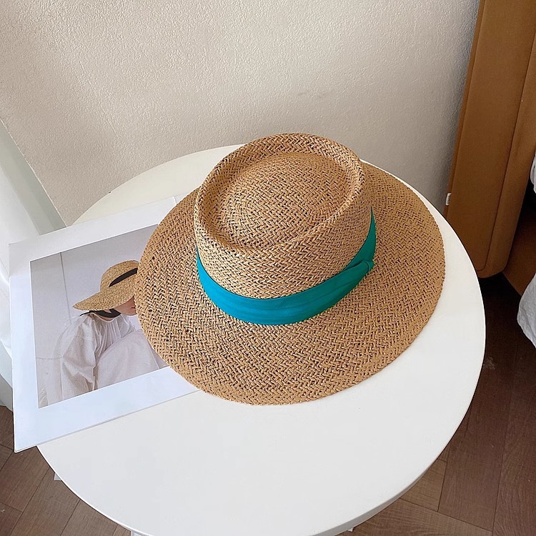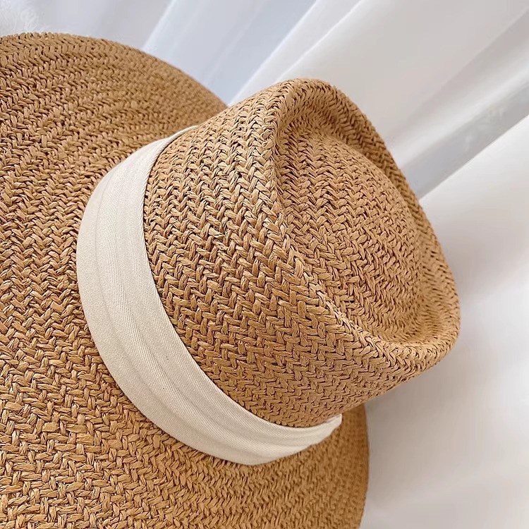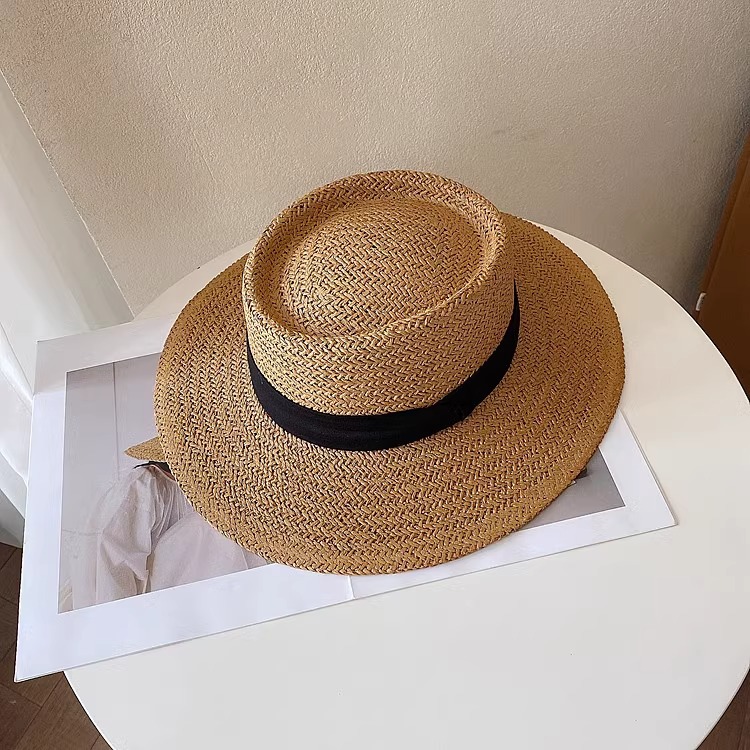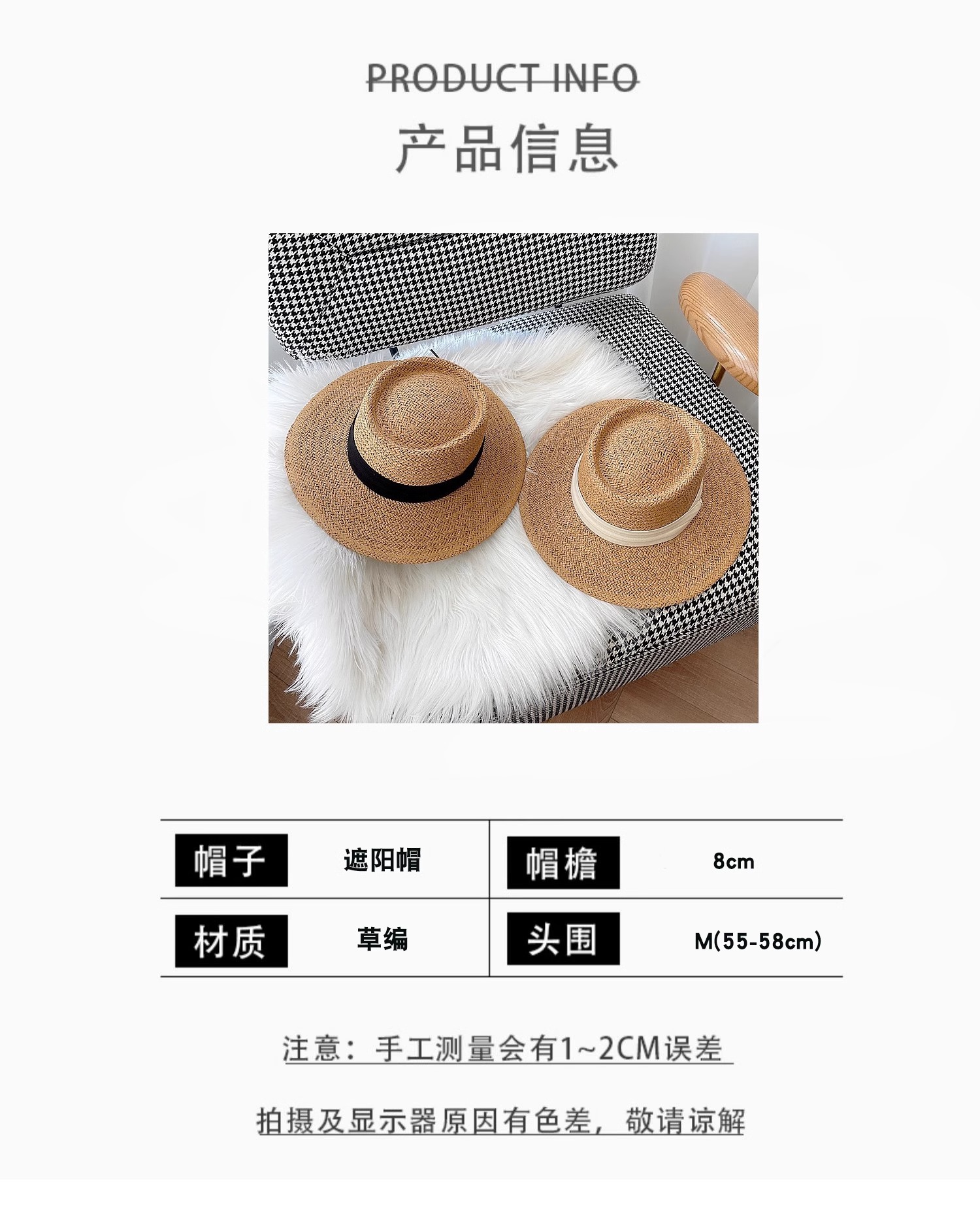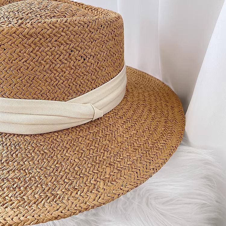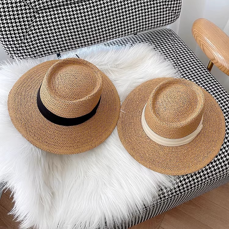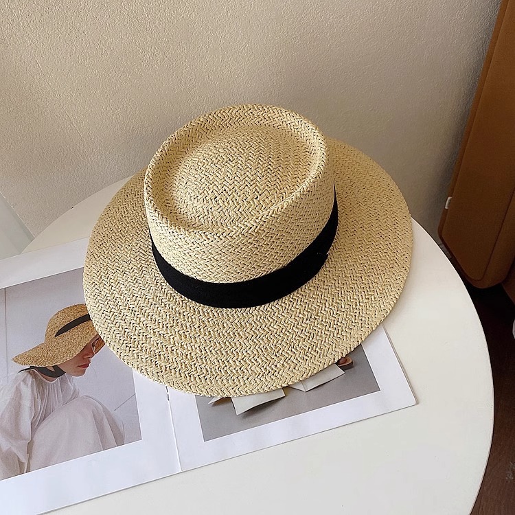 网红三折带法式草帽女夏季海边度假平顶礼帽韩版编织帽子沙滩防晒