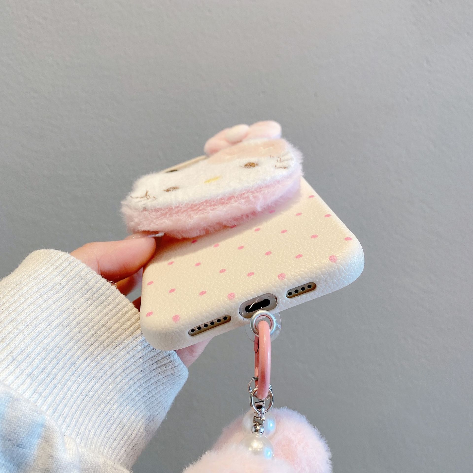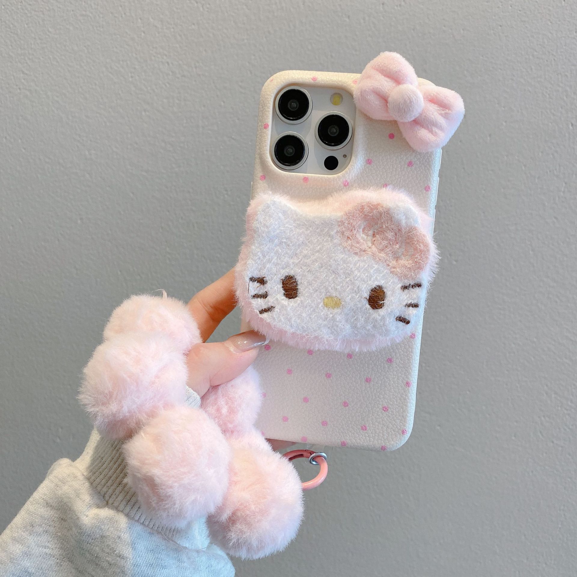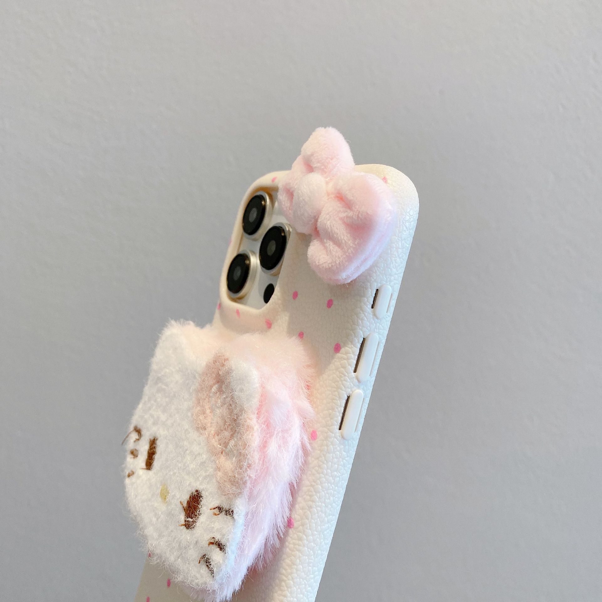 毛绒KT蝴蝶结波点苹果16promax/15pro防摔全包13PRO皮革纹手机壳