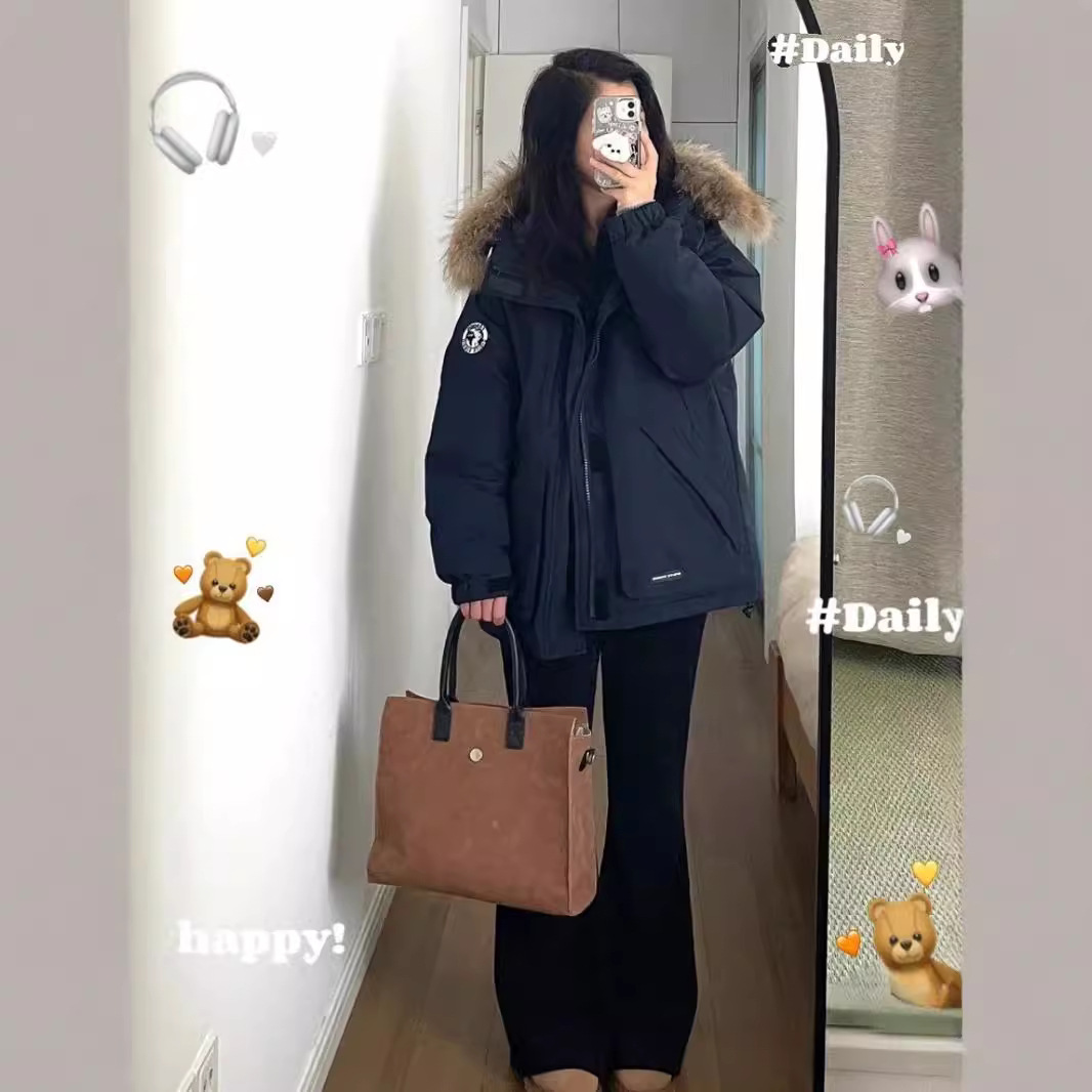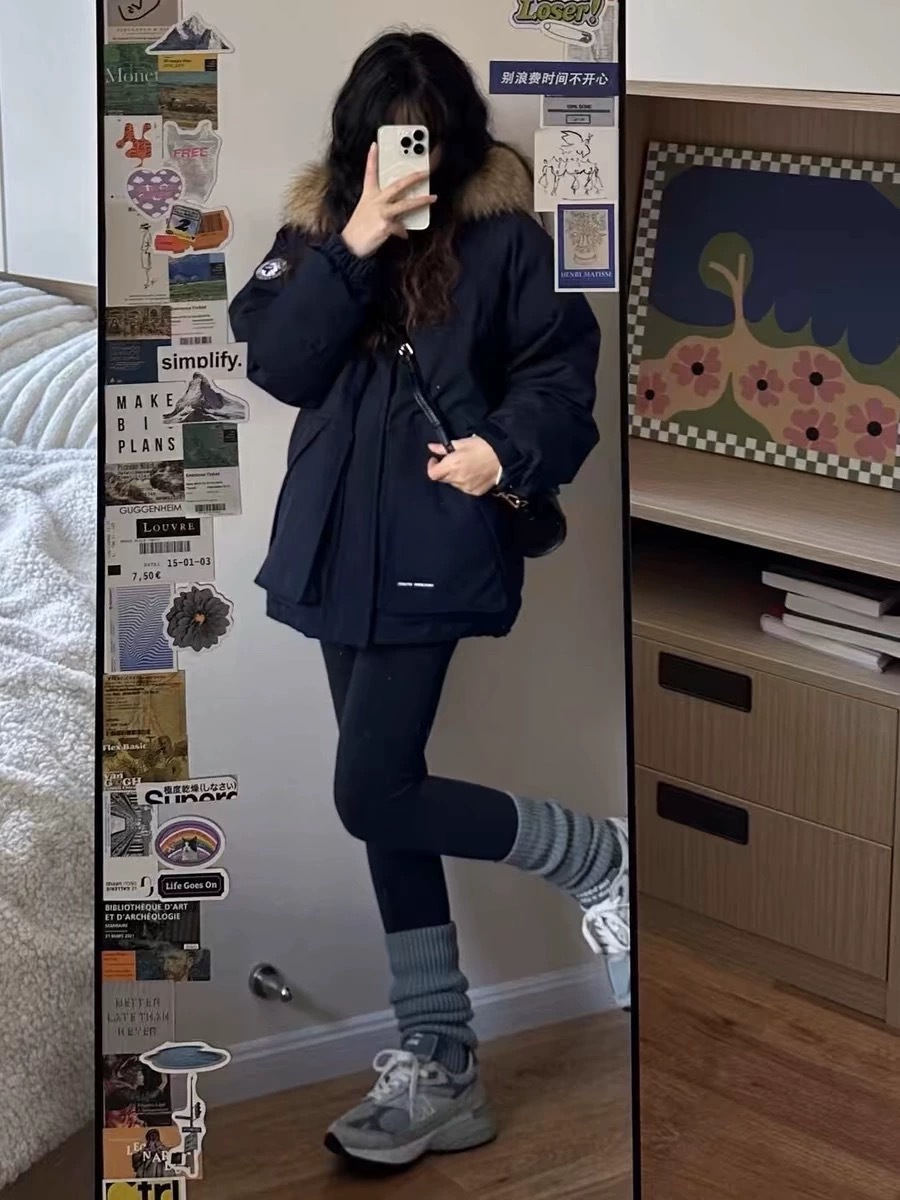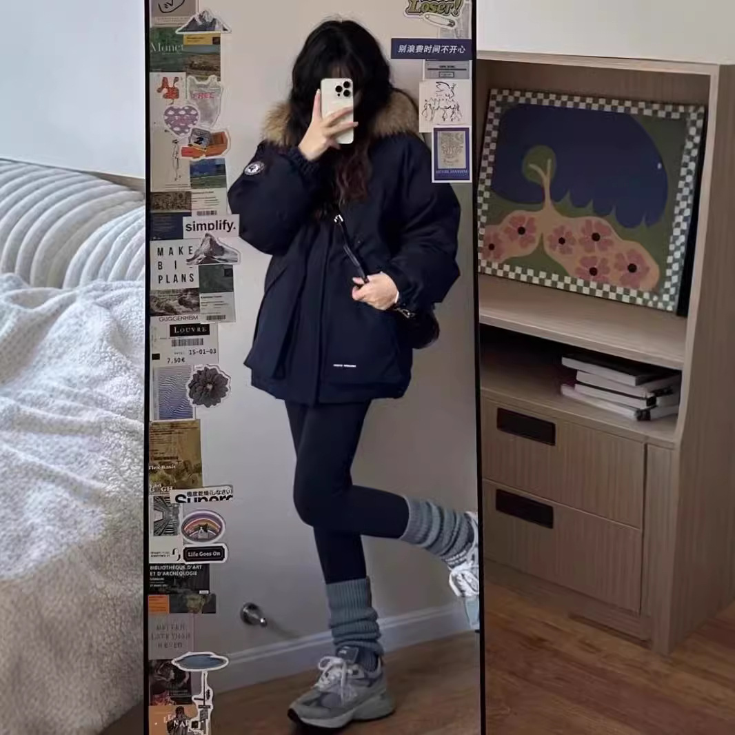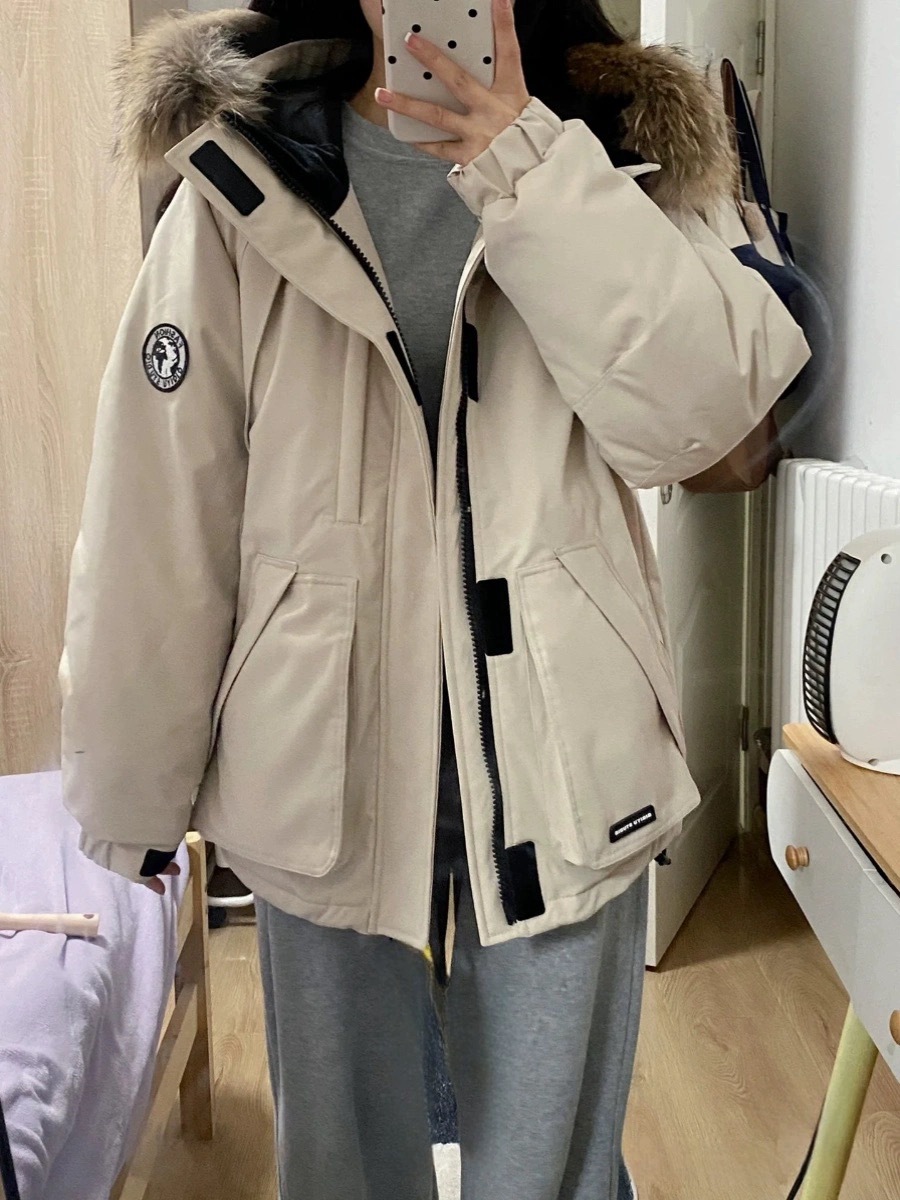 2024羽绒服女中长款工装派克学生冲锋衣大毛领连帽白鸭绒冬装外套