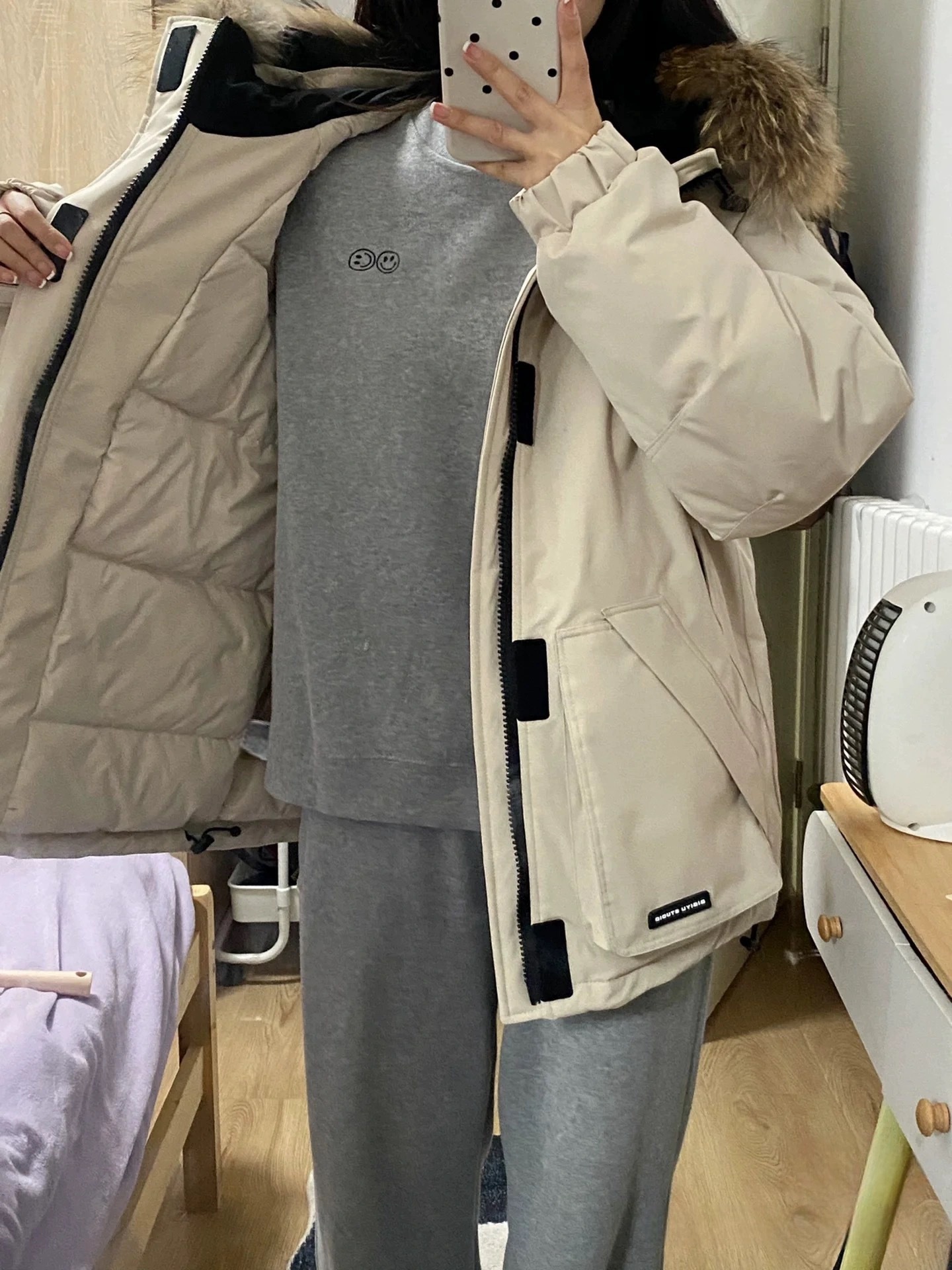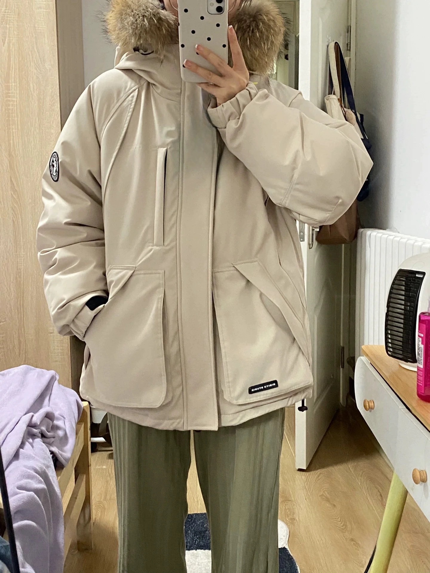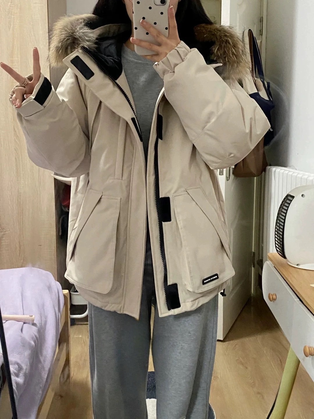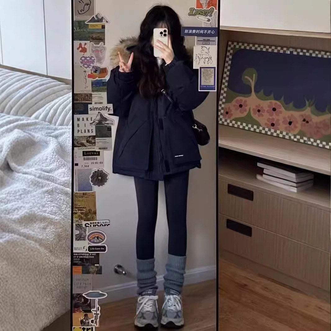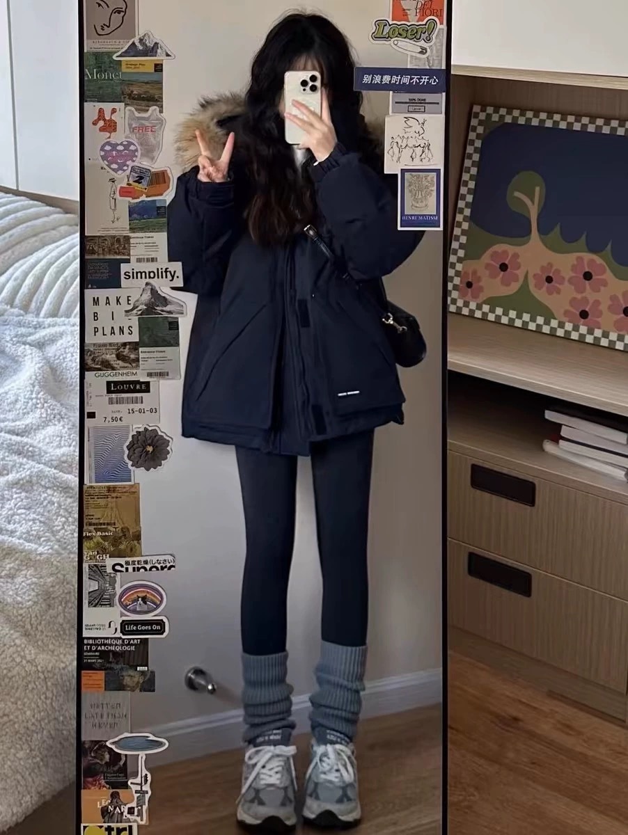 2024羽绒服女中长款工装派克学生冲锋衣大毛领连帽白鸭绒冬装外套