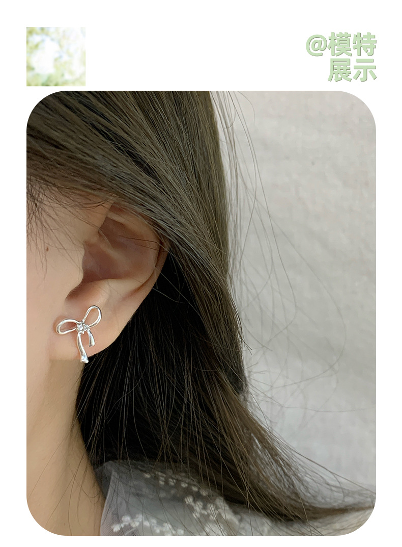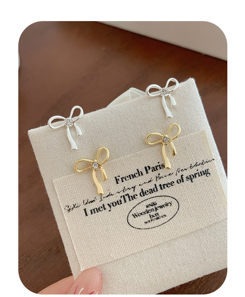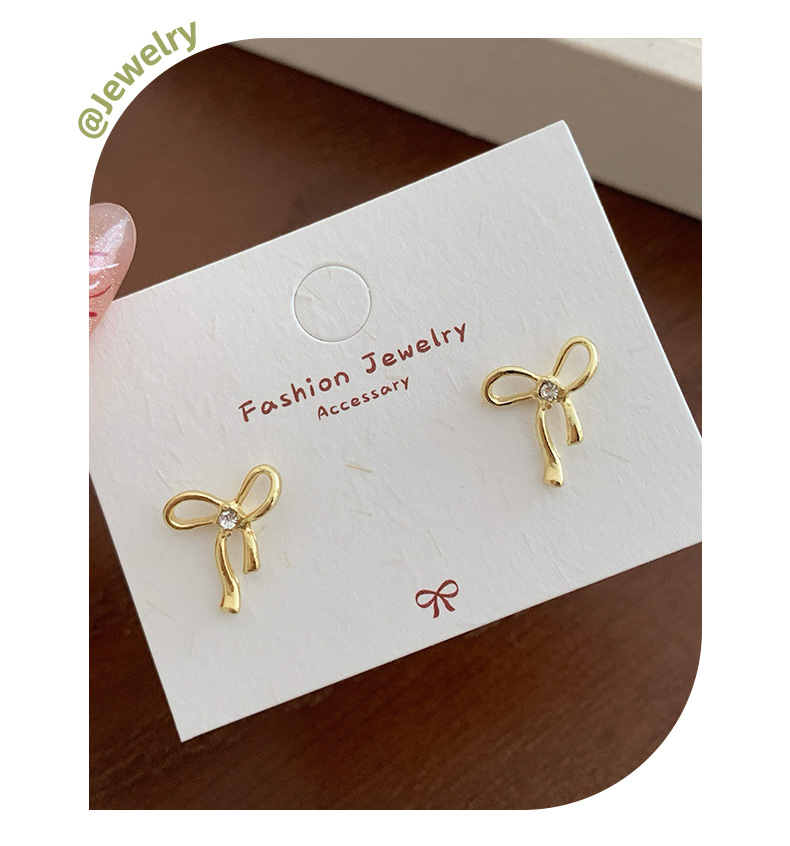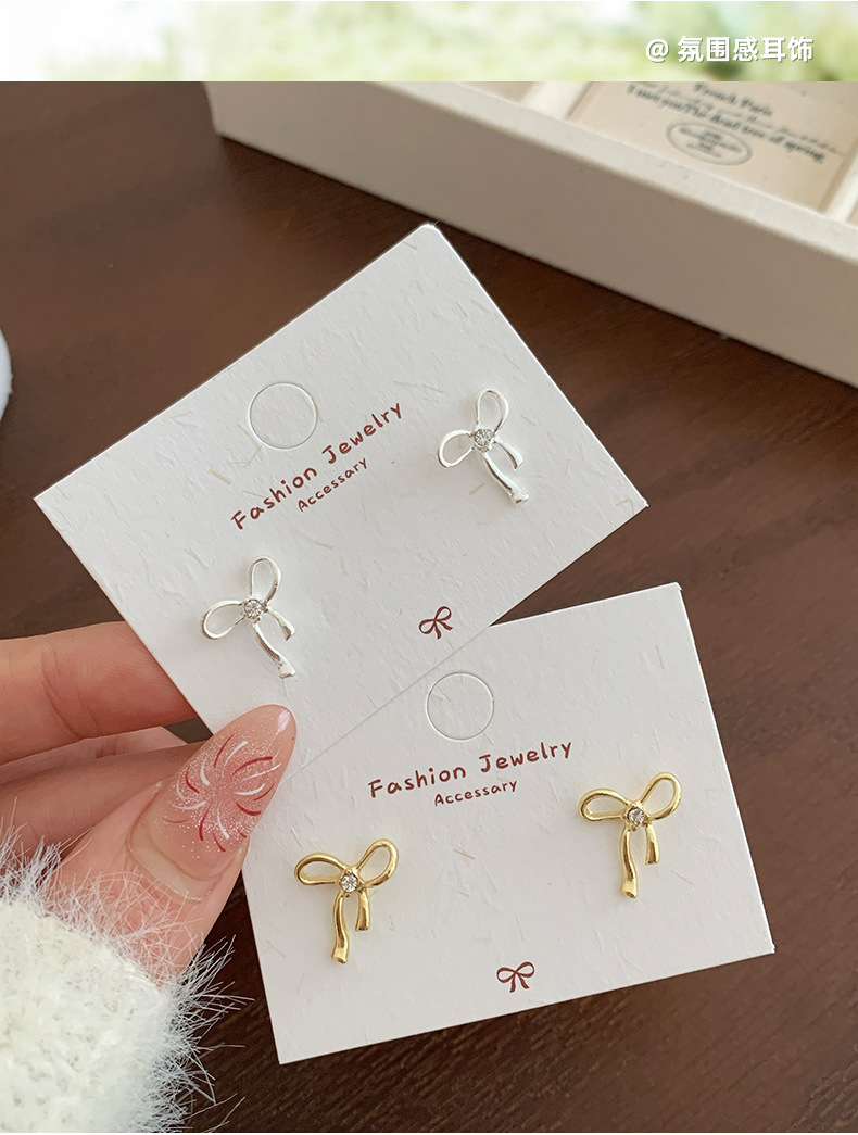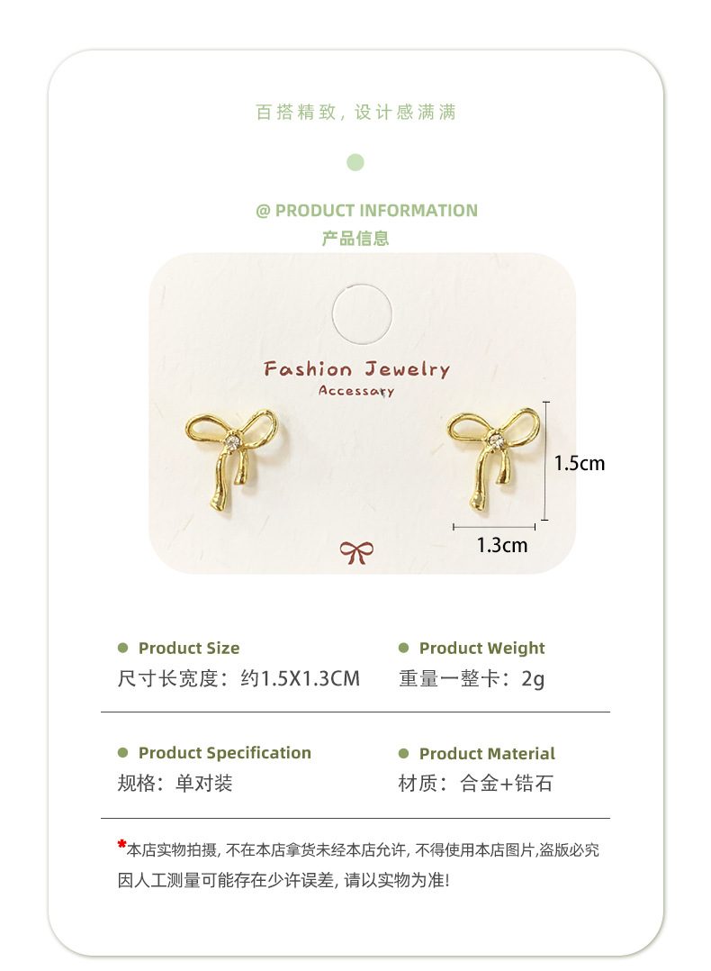 韩版简约精致镶钻蝴蝶结耳钉女银针时尚镂空金色气质小巧百搭耳饰