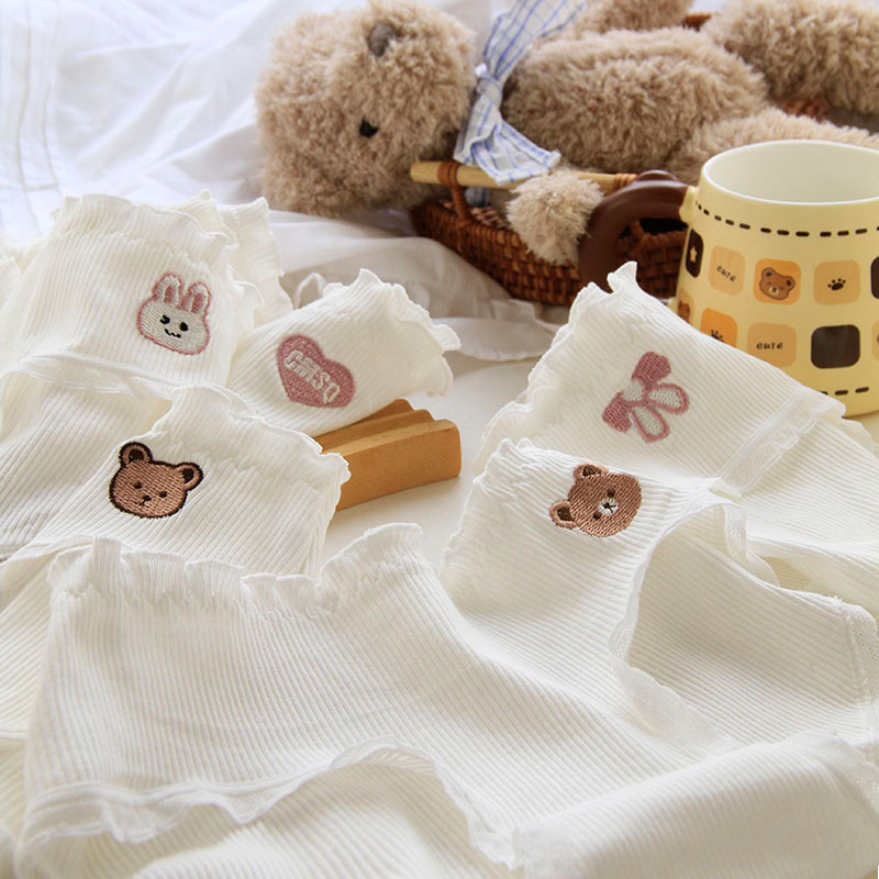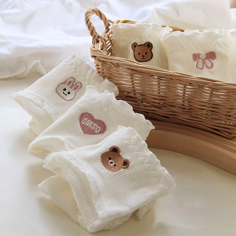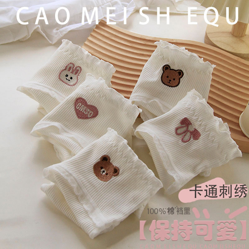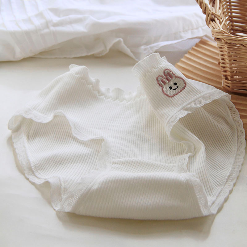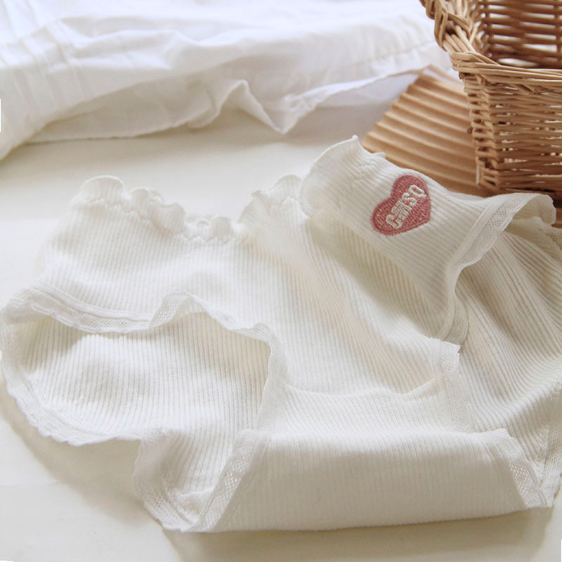 可爱刺绣木耳边ins潮白色中腰女内裤螺纹棉荷叶边纯棉裆短裤 510