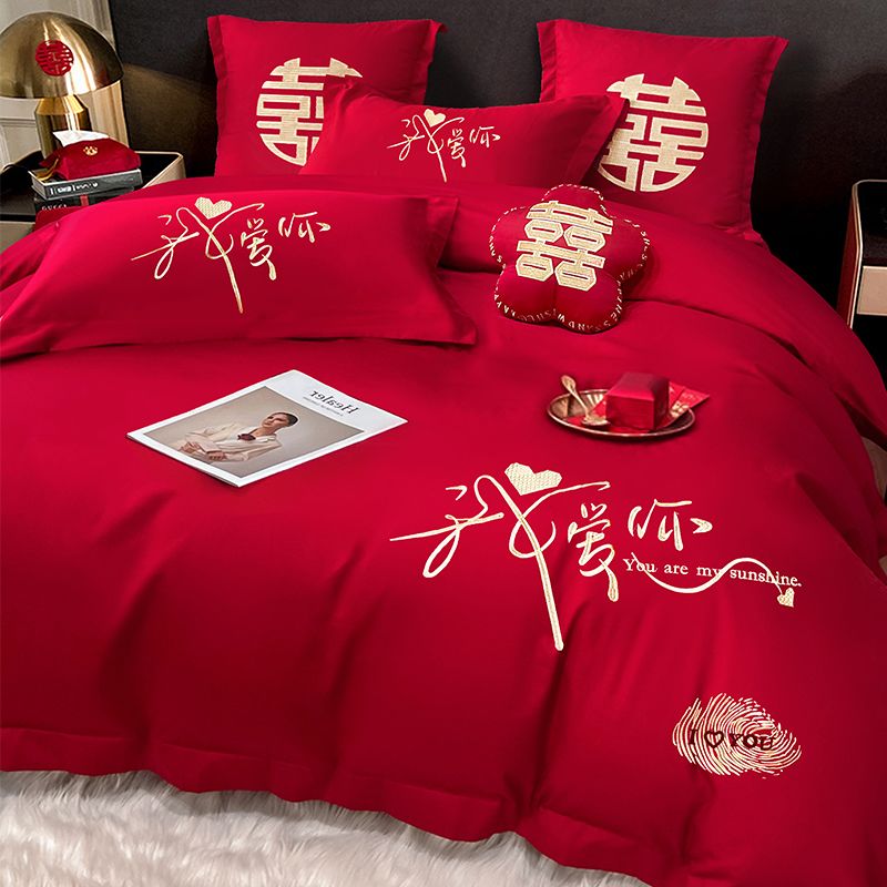 中式婚庆四件套大红色新婚刺绣被套结婚陪嫁喜庆喜被套件床上用品