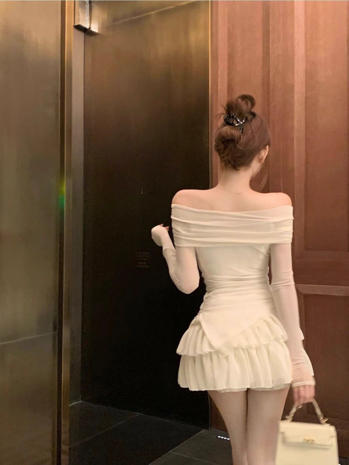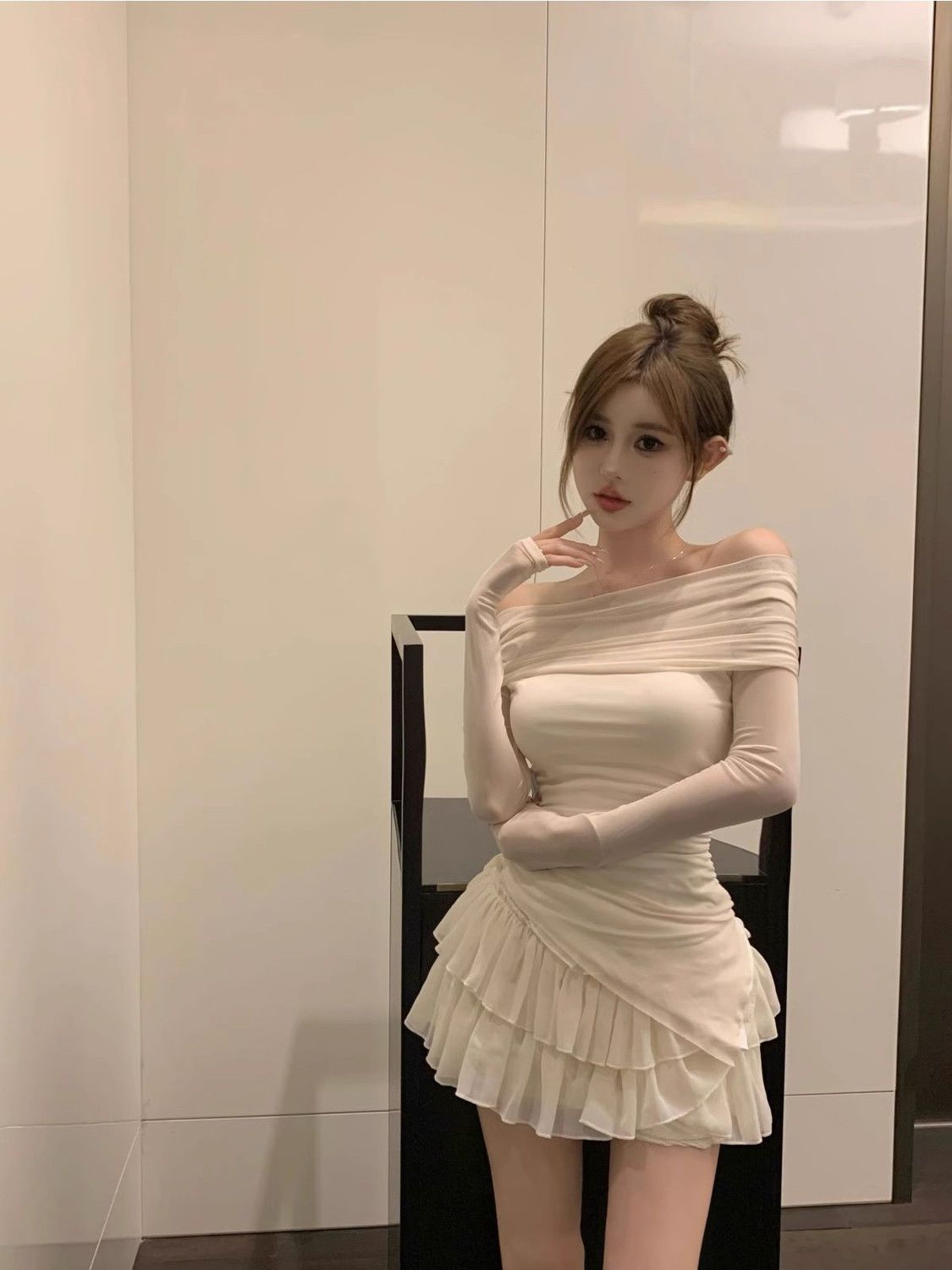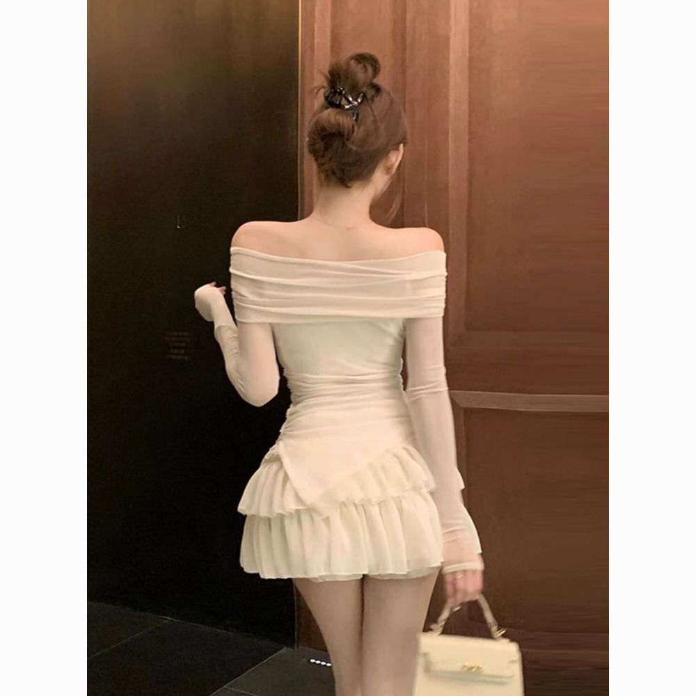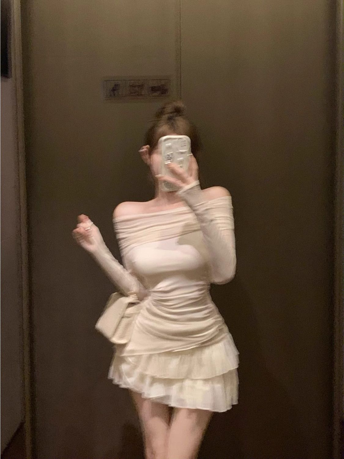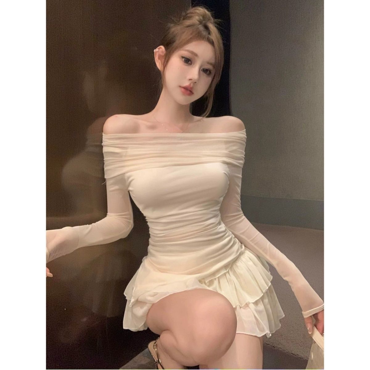 纯欲甜辣套装裙女修身超仙显瘦长袖一字肩上衣高腰蛋糕短裙两件套