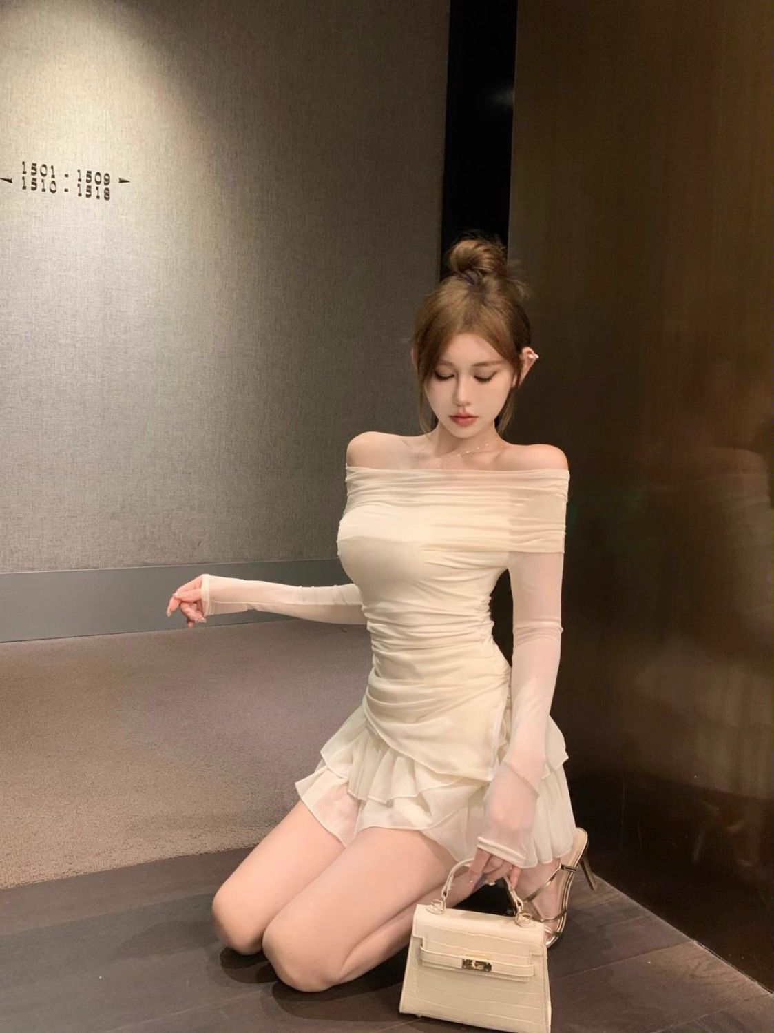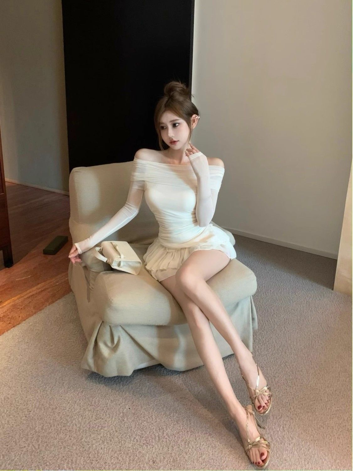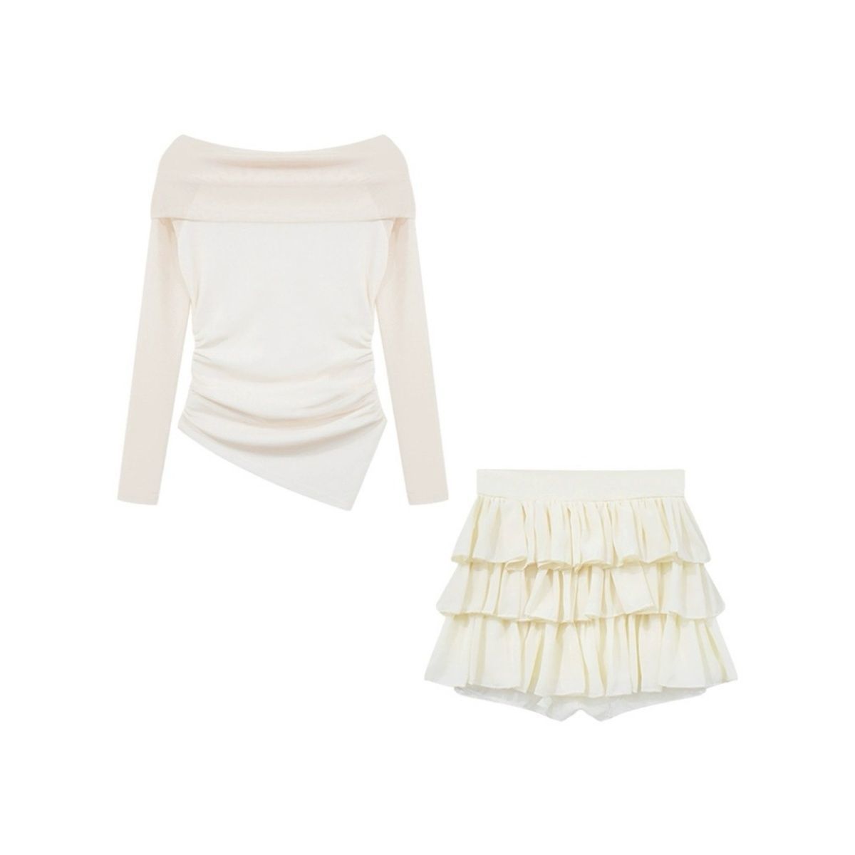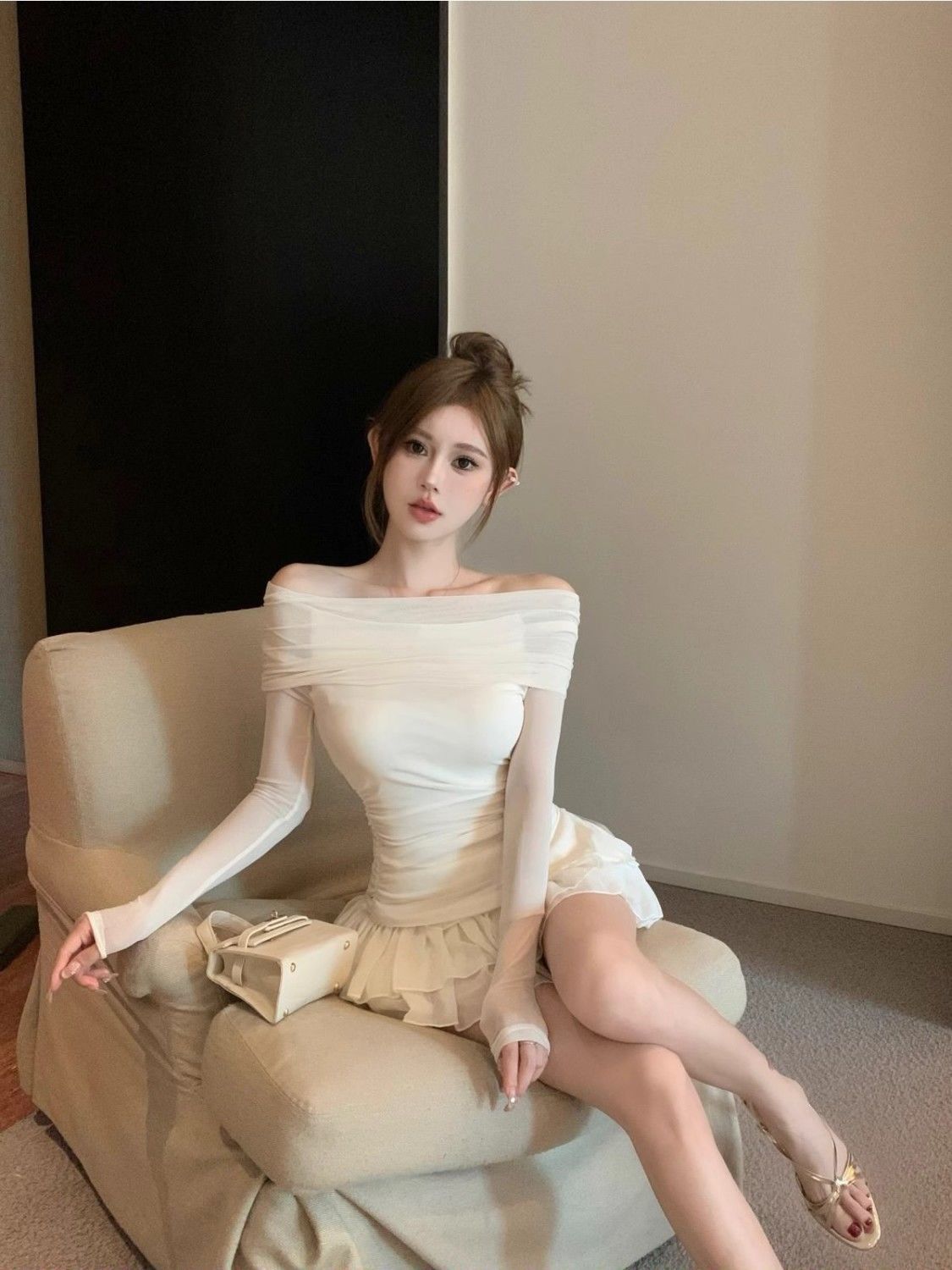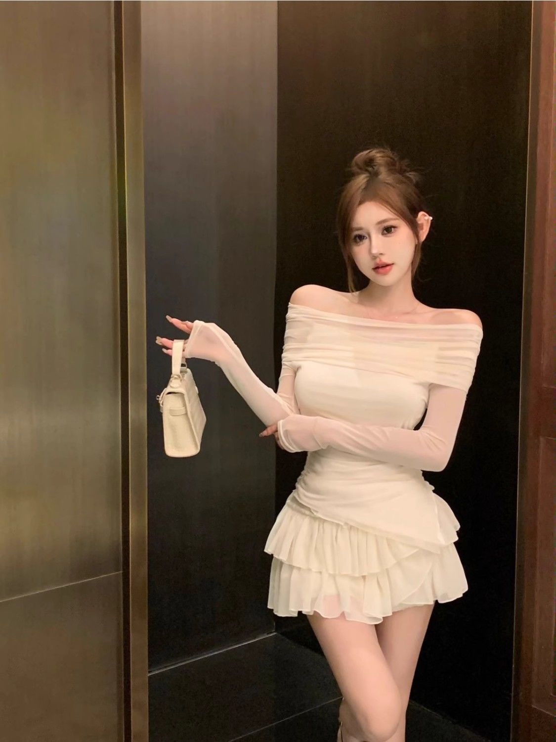 纯欲甜辣套装裙女修身超仙显瘦长袖一字肩上衣高腰蛋糕短裙两件套