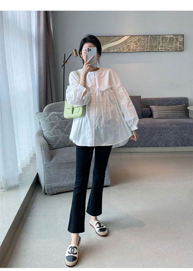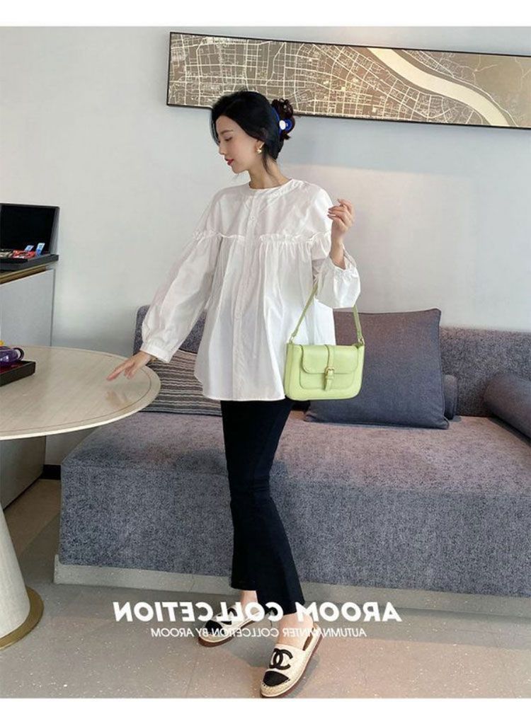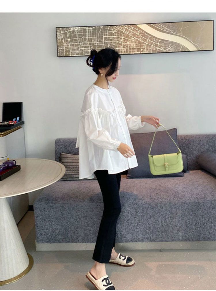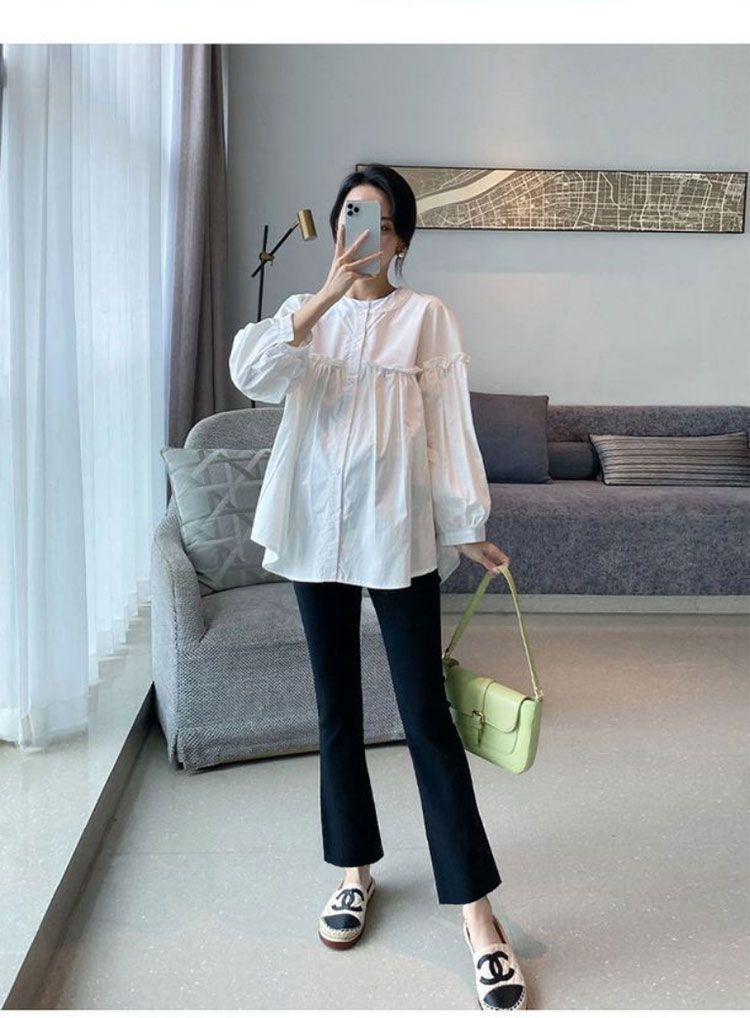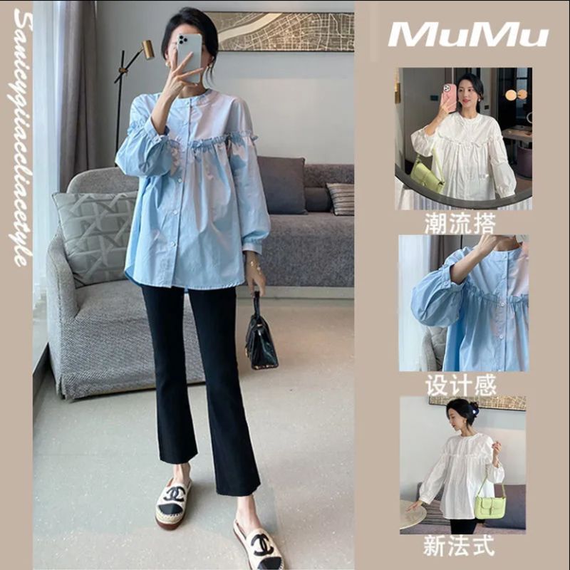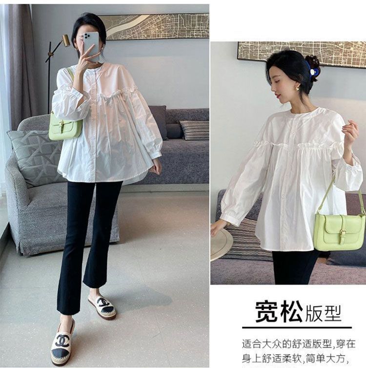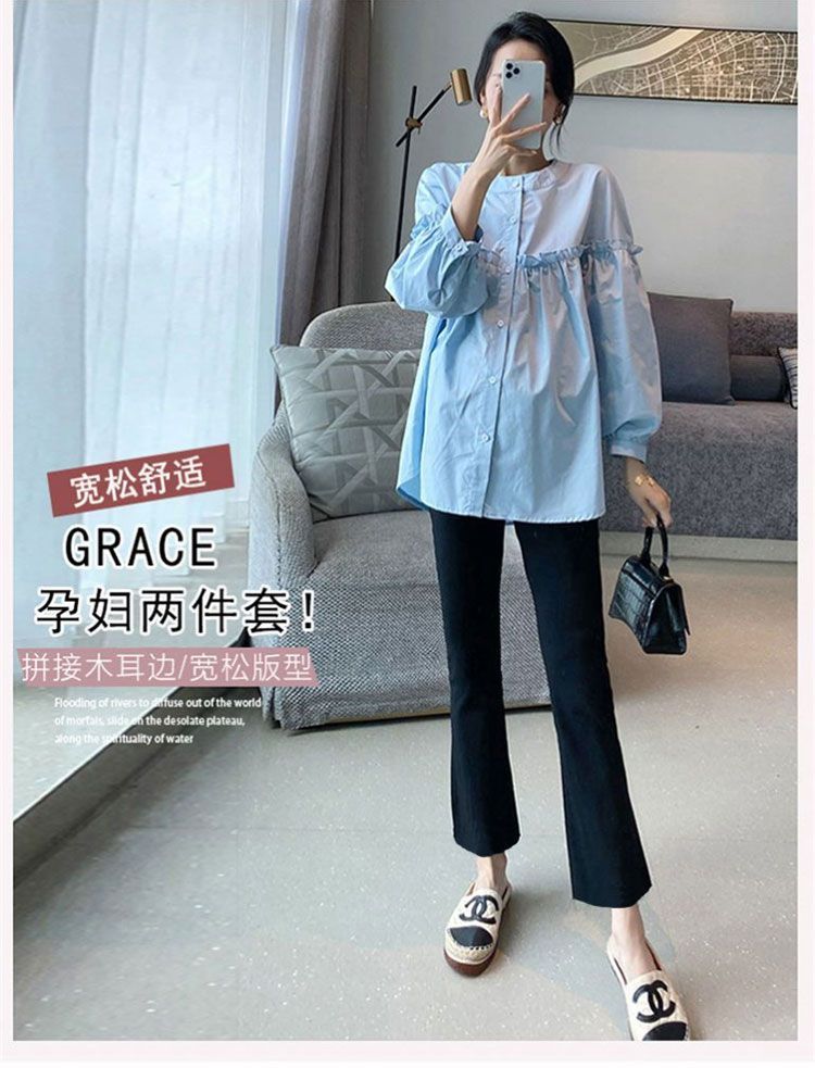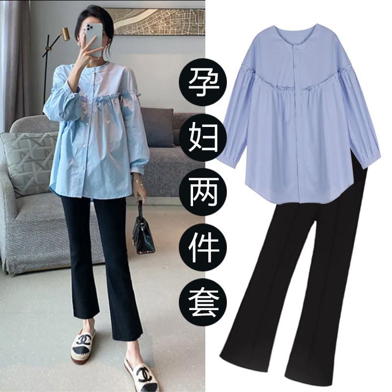 孕妇套装纯棉春装外出时尚洋气衬衫淑女春秋季娃娃衫托腹裤两件套