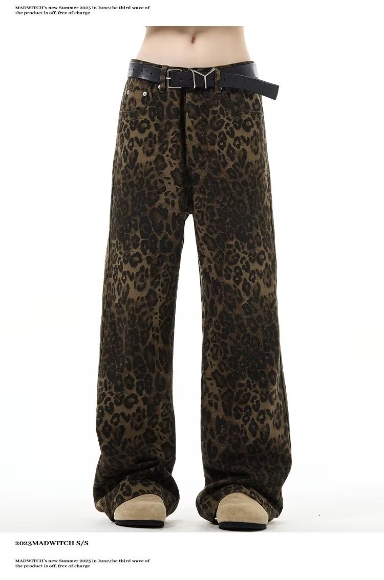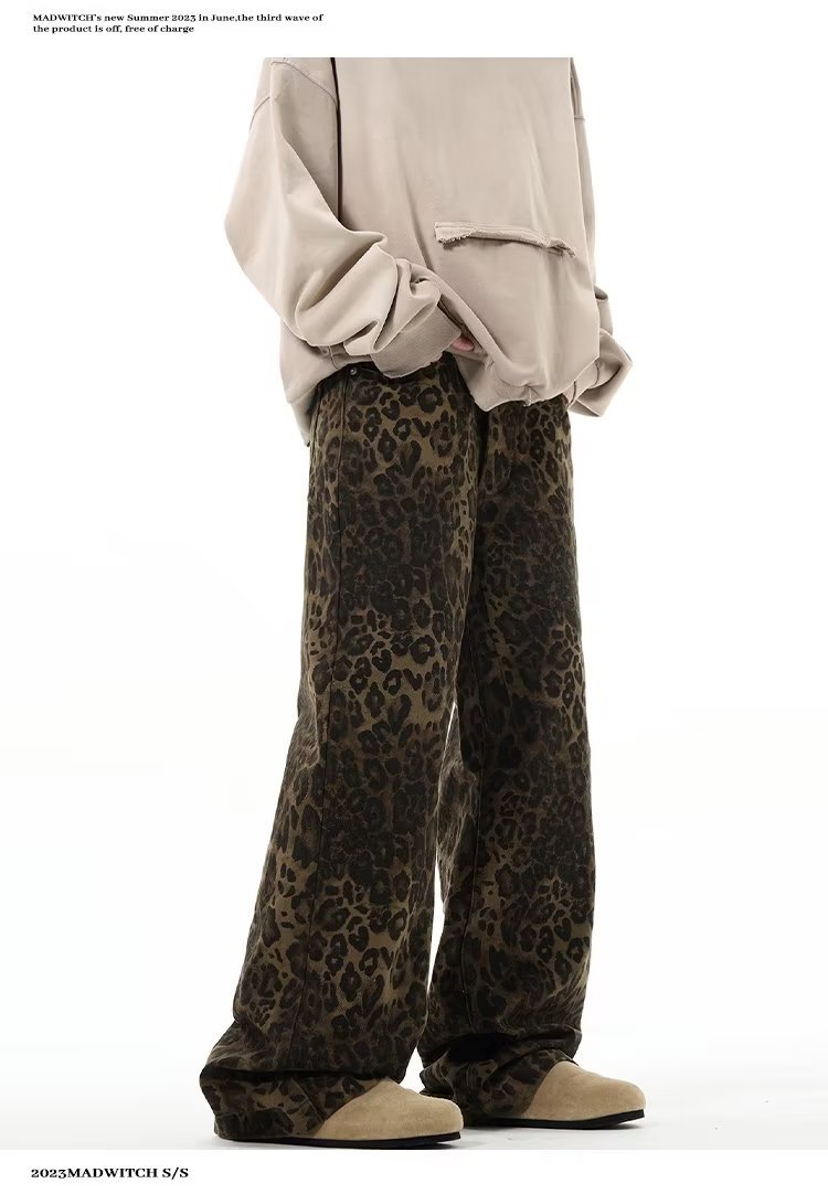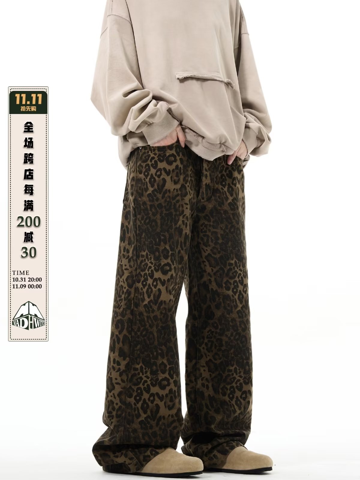 美式高街原创新款复古豹纹牛仔裤男女直筒宽松欧美休闲拖地长裤男
