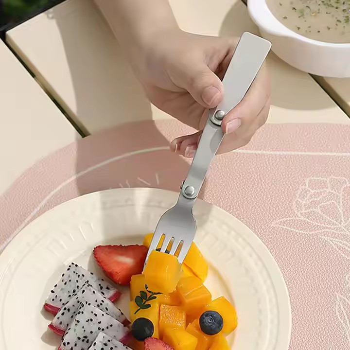 跨境户外便携式餐具 304不锈钢钛银色可折叠吃饭勺子叉勺叉子套装