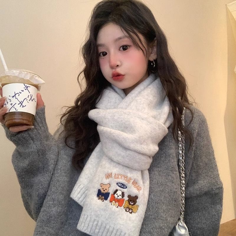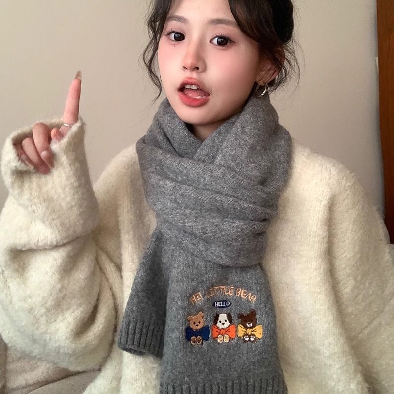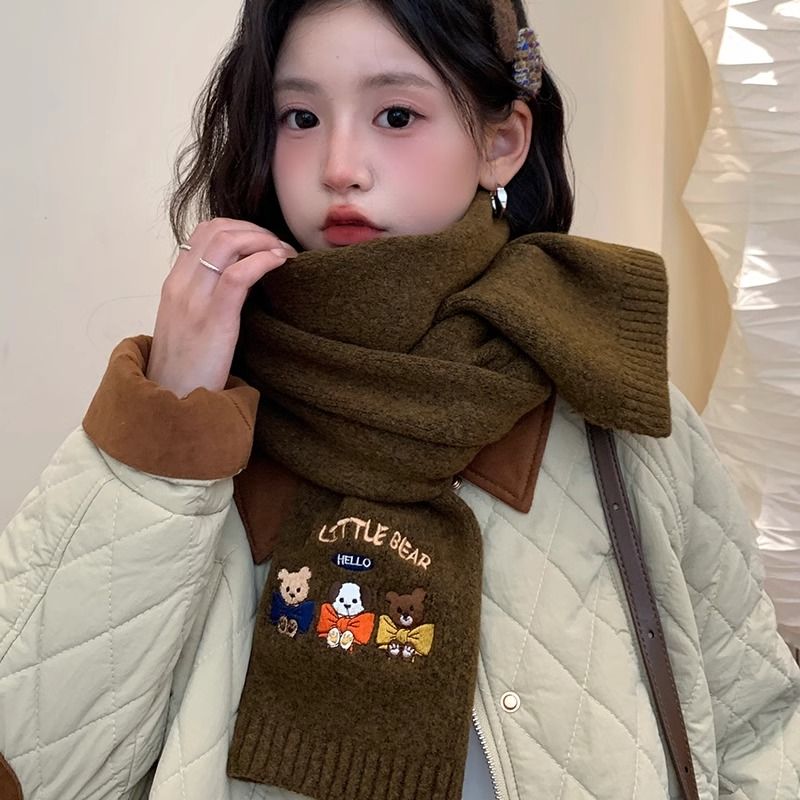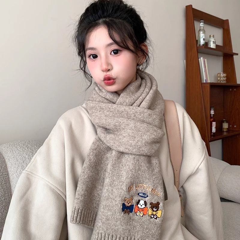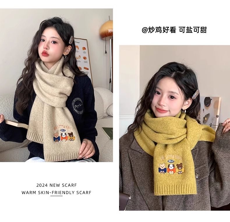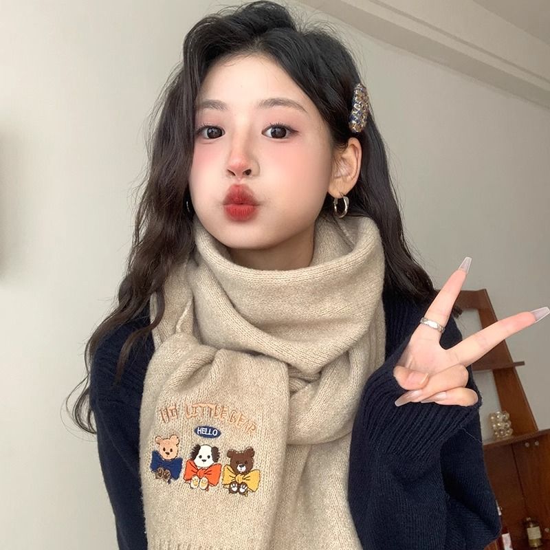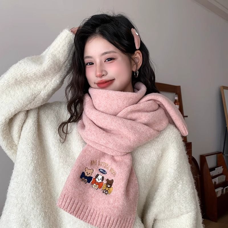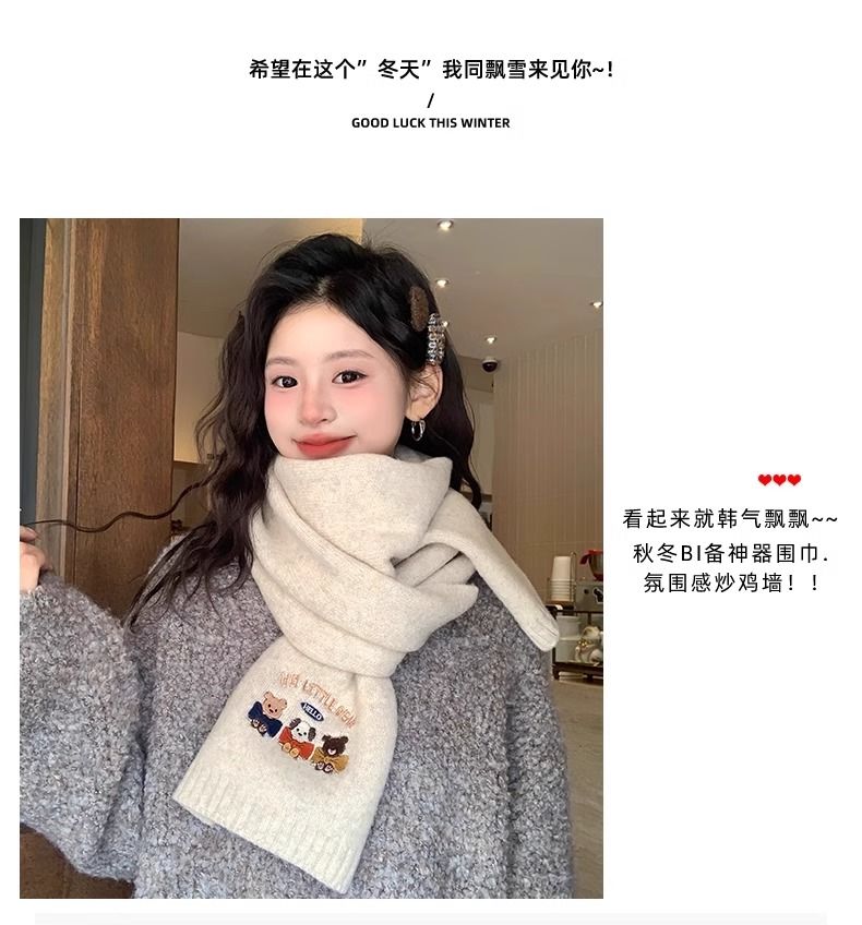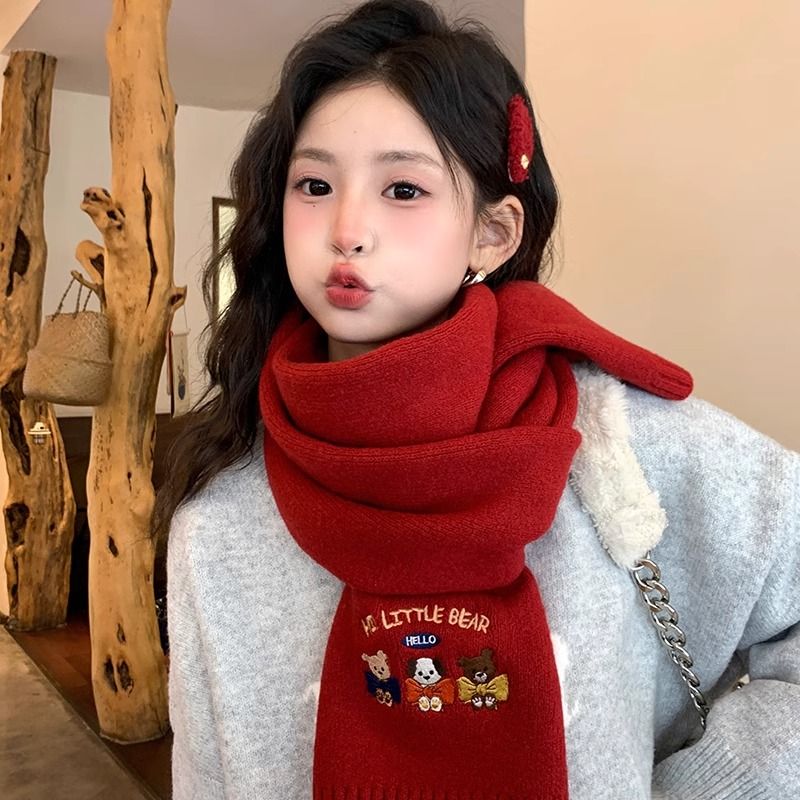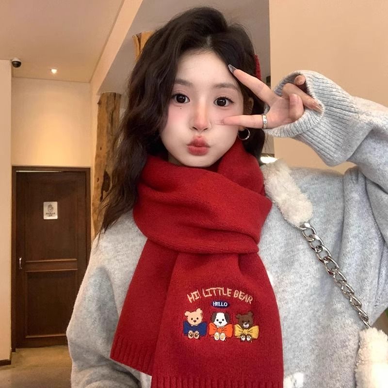 小围巾护颈红色围巾女款冬季针织毛线小熊外搭韩系氛围感保暖围脖