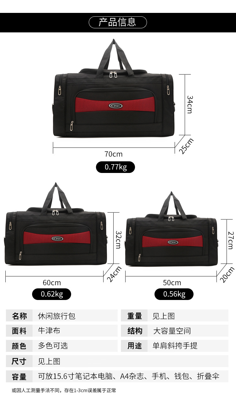 厂家批发大中小号手提单肩斜挎旅行包,牛津布面料,每批次面料由于印染工艺可能会有轻微色差,拍图图片与实物对比也会有轻微色差,请注意温馨提示,介意勿拍,包包规格,大号长70宽25高34,中号长60宽24高32,小号长50宽20高27,拍图尺寸与实际尺寸测量时有1一3厘米误差,开票另加税点,详情咨询客服,谢谢。