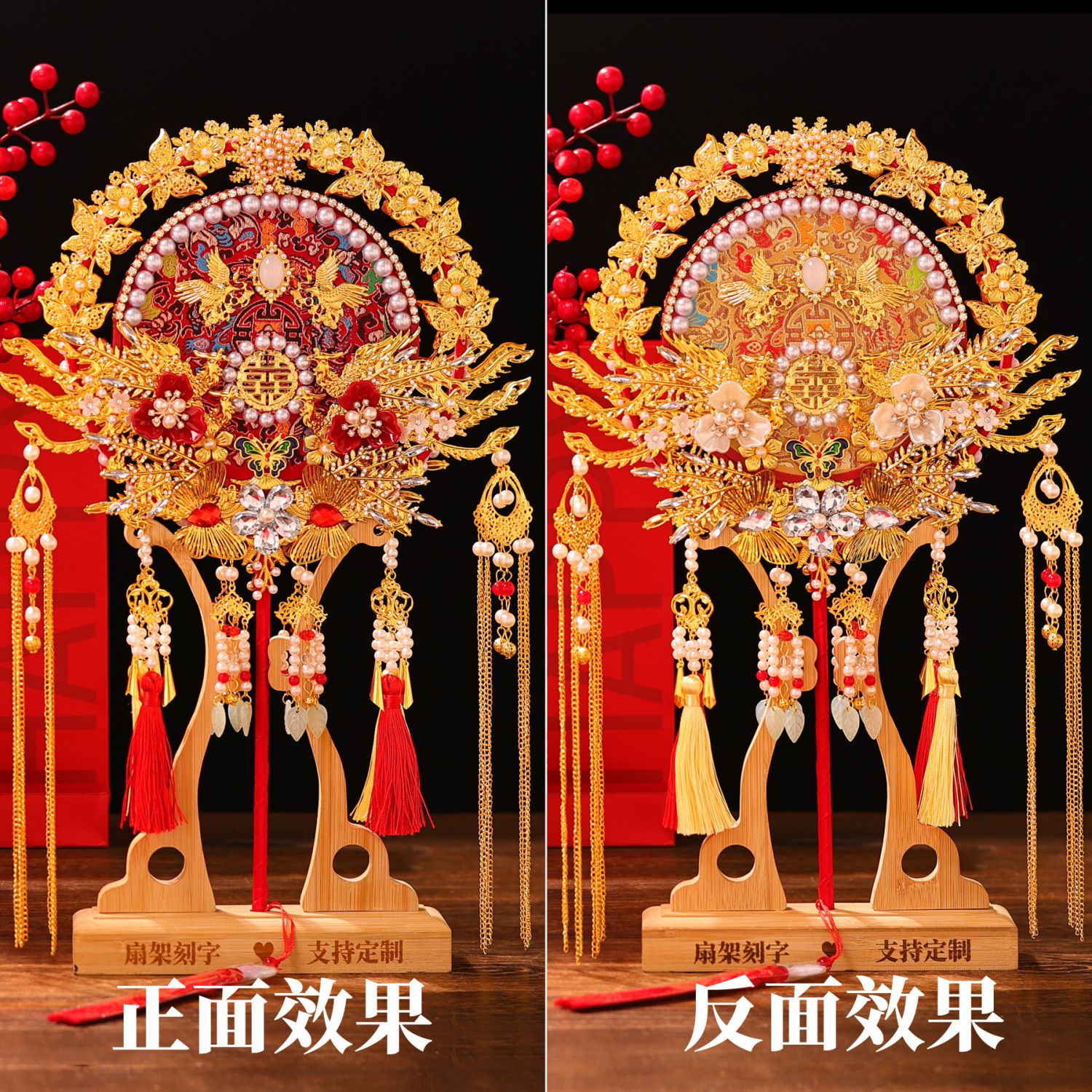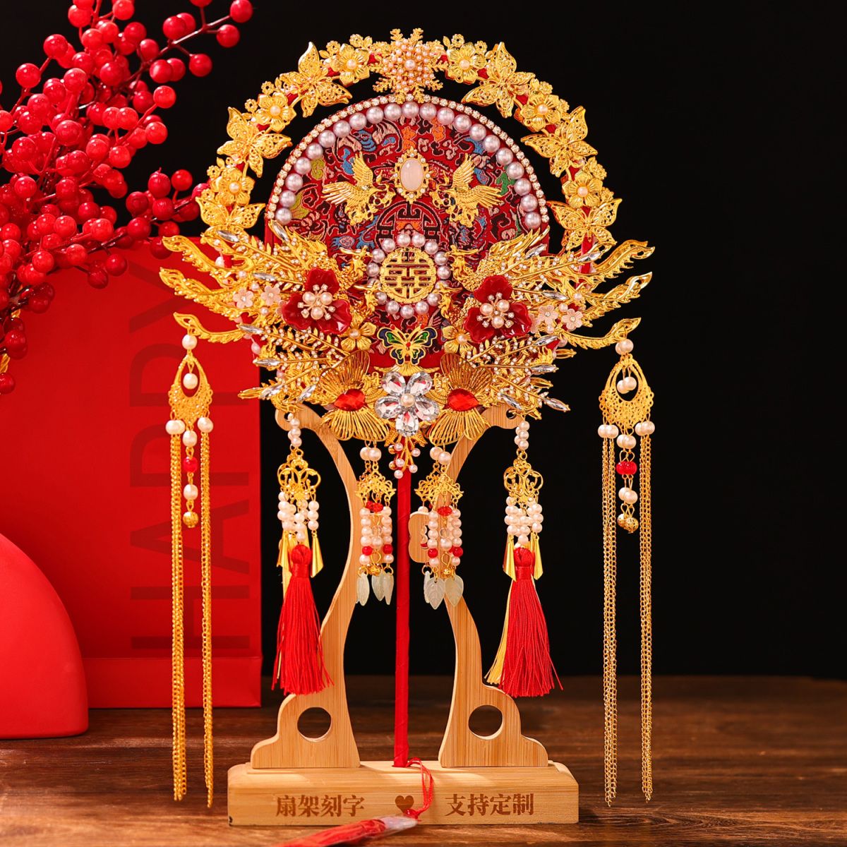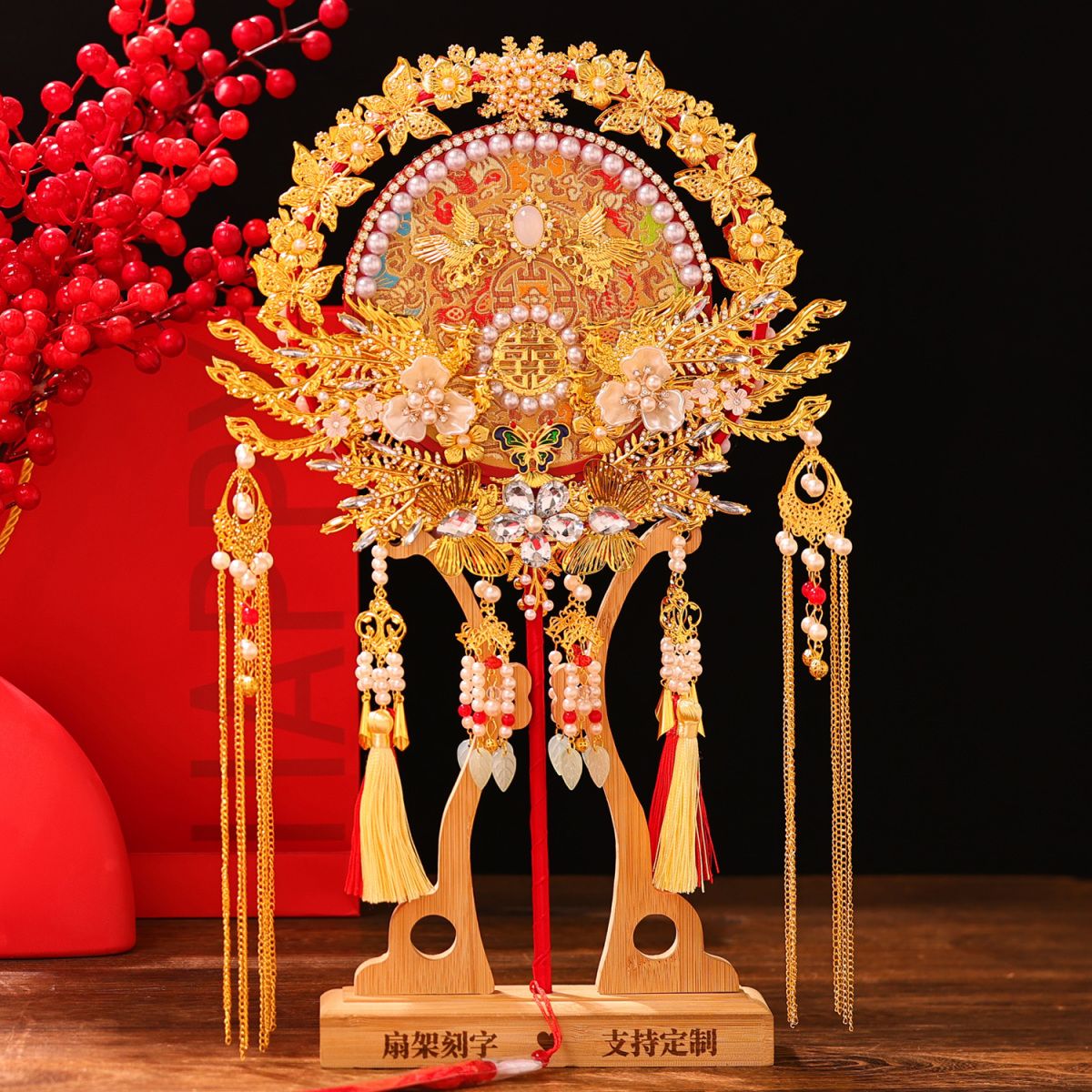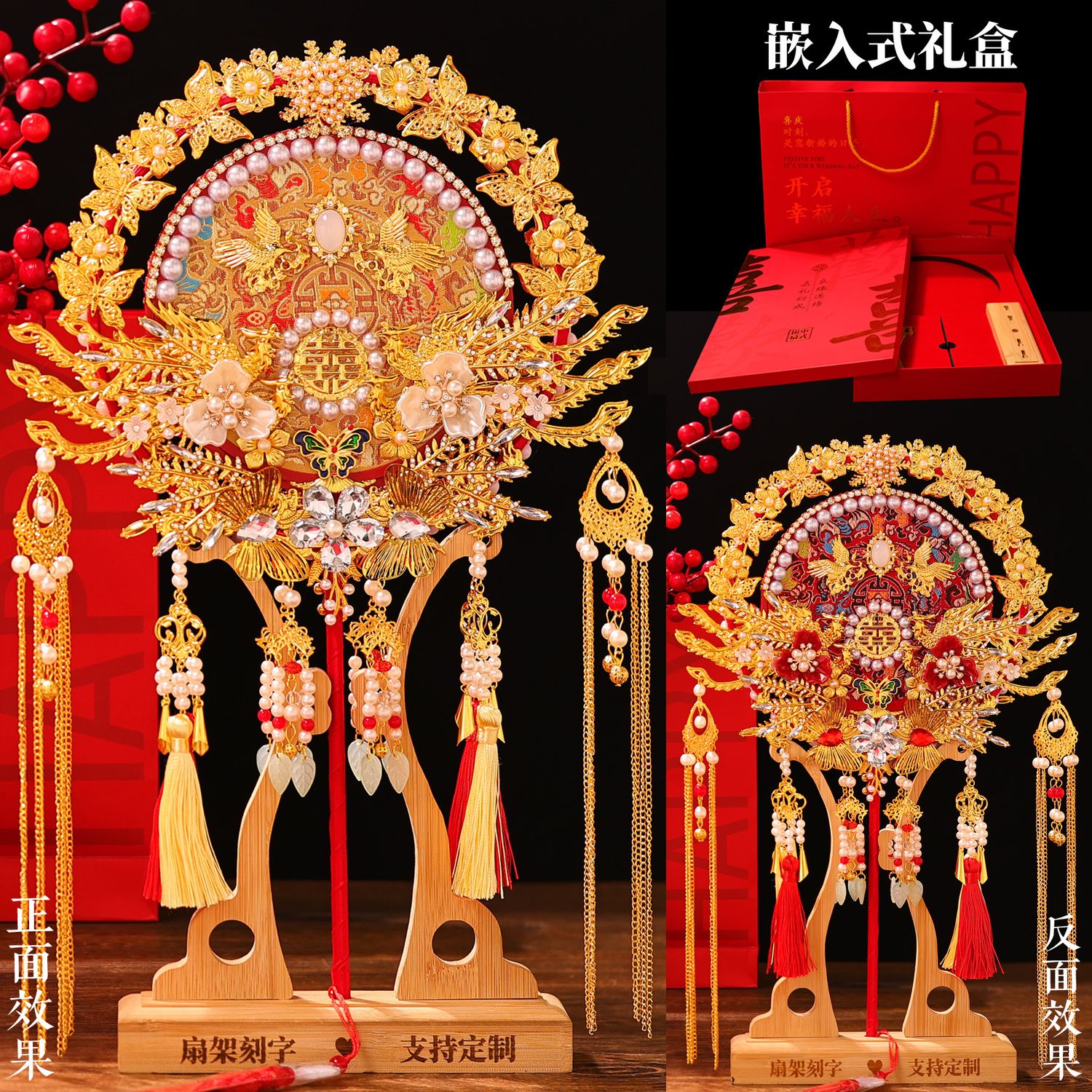 | wedding fan + bamboo stand + gilding inlaid gift box(喜扇+楠竹架+烫金镶嵌礼盒) | USD $29.01 | 999999 piece available |