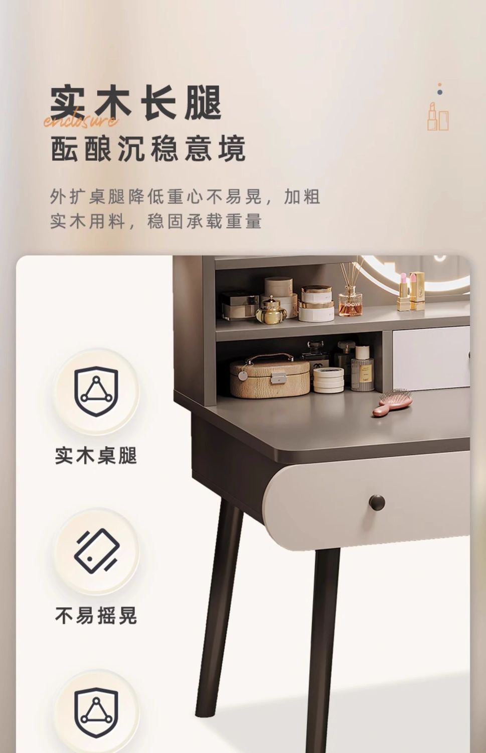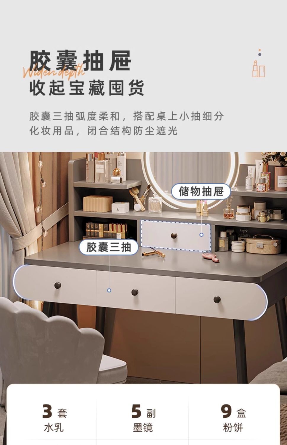 | smart makeup mirror + three layers + stool] 100cm gray(智能妆镜+三层三抽+凳子】100cm灰) | USD $31.51 | 999999 piece available |