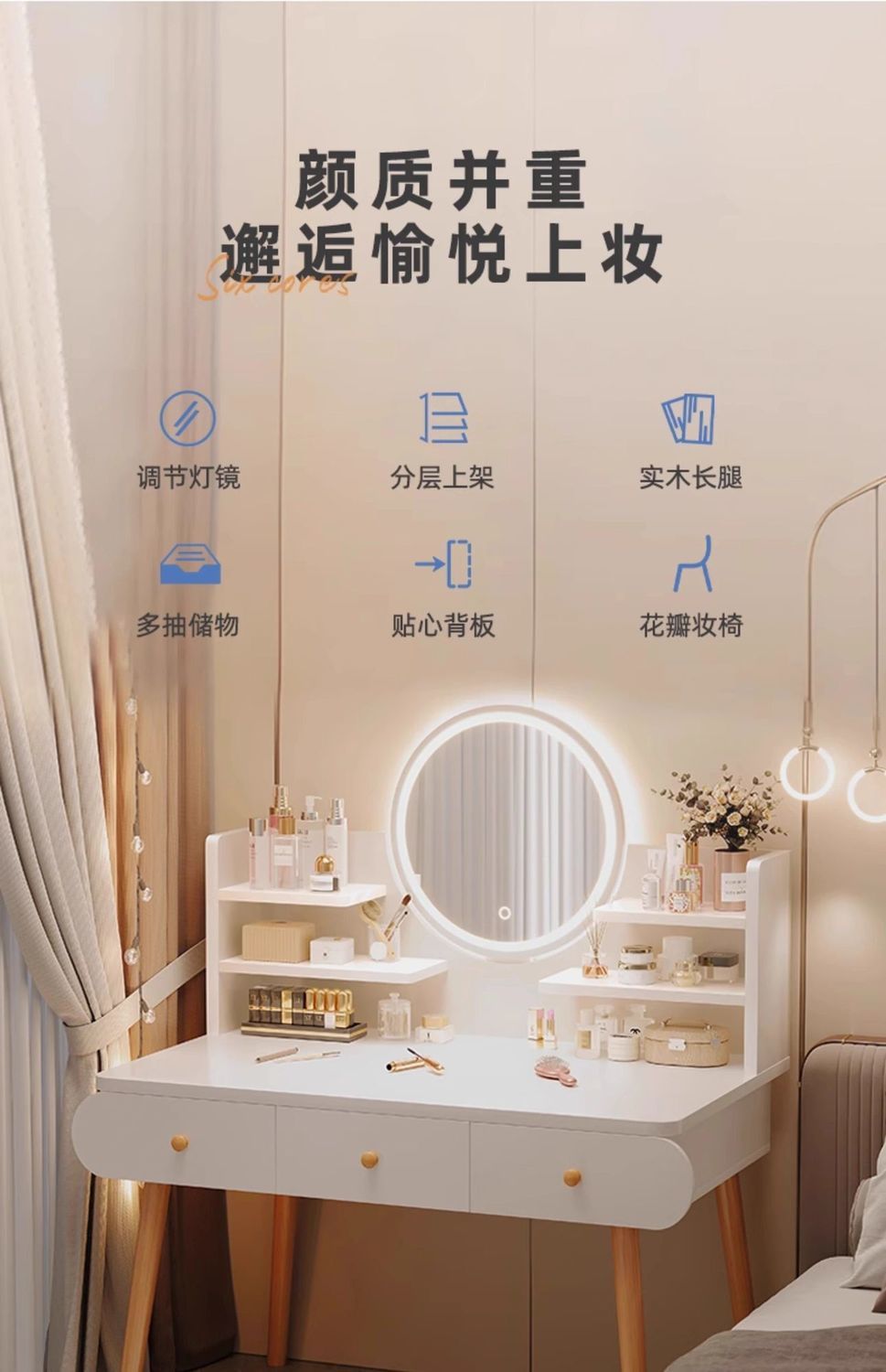 | smart makeup mirror + three layers and four drawers + fairy chair] 100cm white(智能妆镜+三层四抽+仙女椅】100cm白) | USD $45.3 | 999999 piece available |