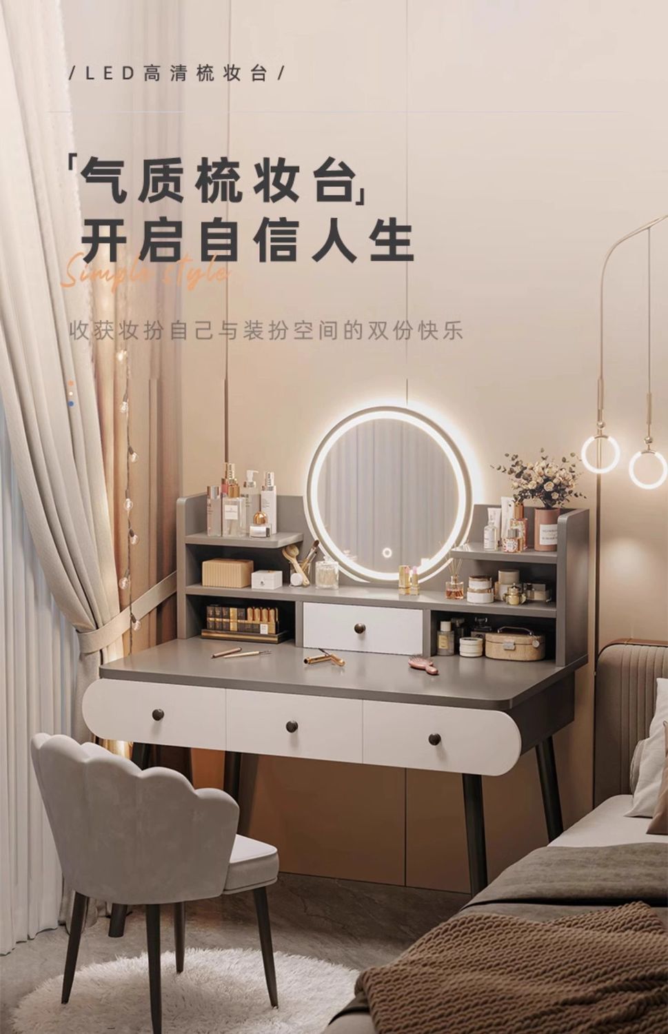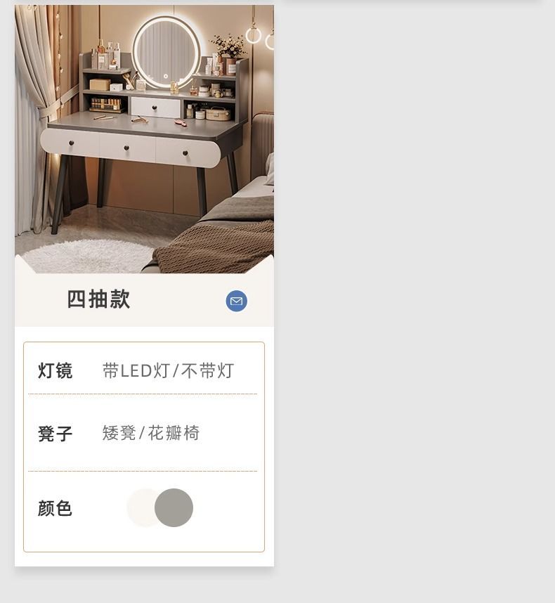 | smart makeup mirror + three layers and four drawers + fairy chair] 100cm gray(智能妆镜+三层四抽+仙女椅】100cm灰色) | USD $43.33 | 999999 piece available |