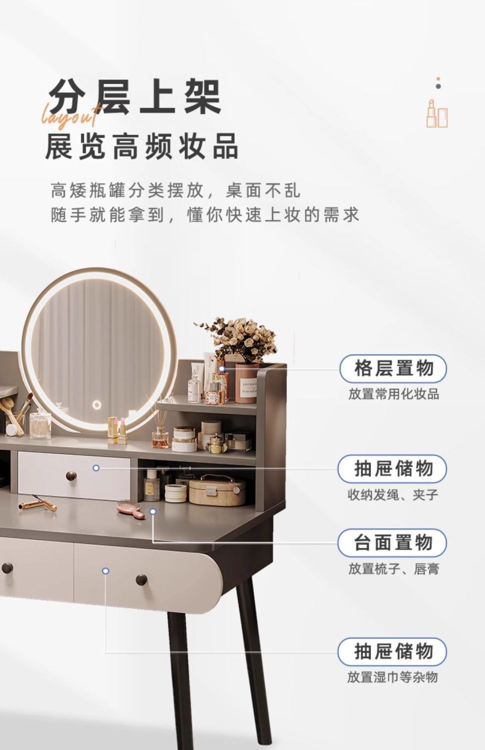 | smart makeup mirror + three-layer double pumping] 80cm gray(智能妆镜+三层双抽】80cm灰) | USD $23.64 | 999999 piece available |