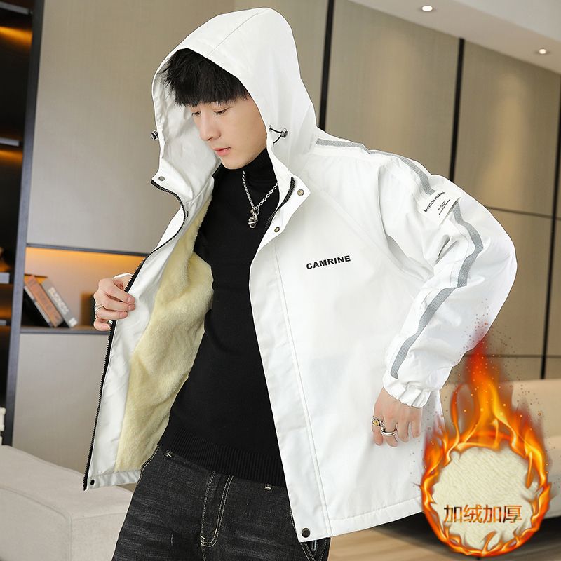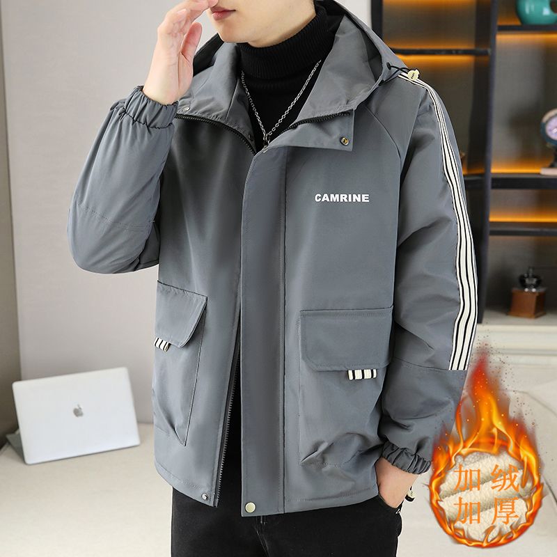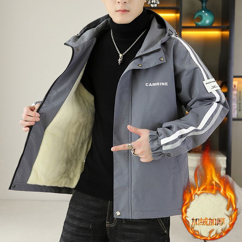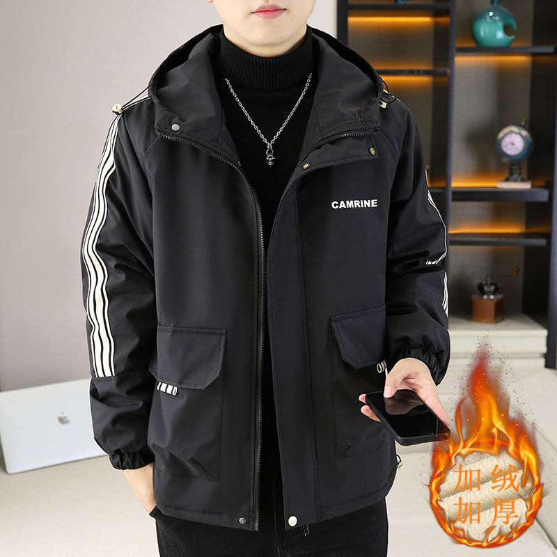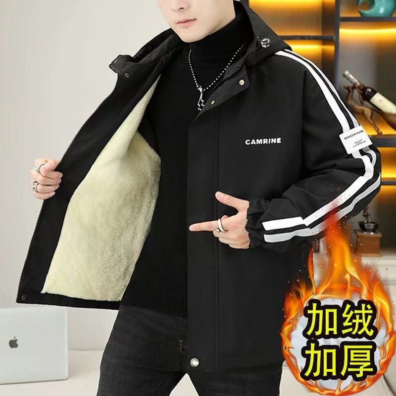 加绒加厚新款男士外套休闲上衣青年修身韩版潮流连帽夹克薄厚1/2