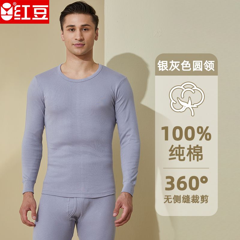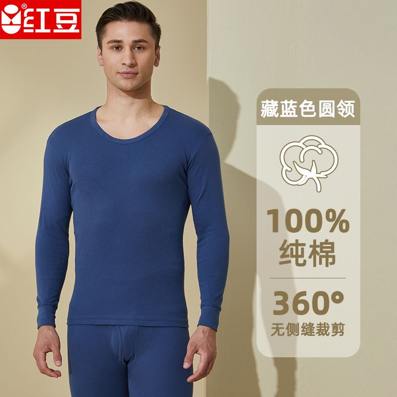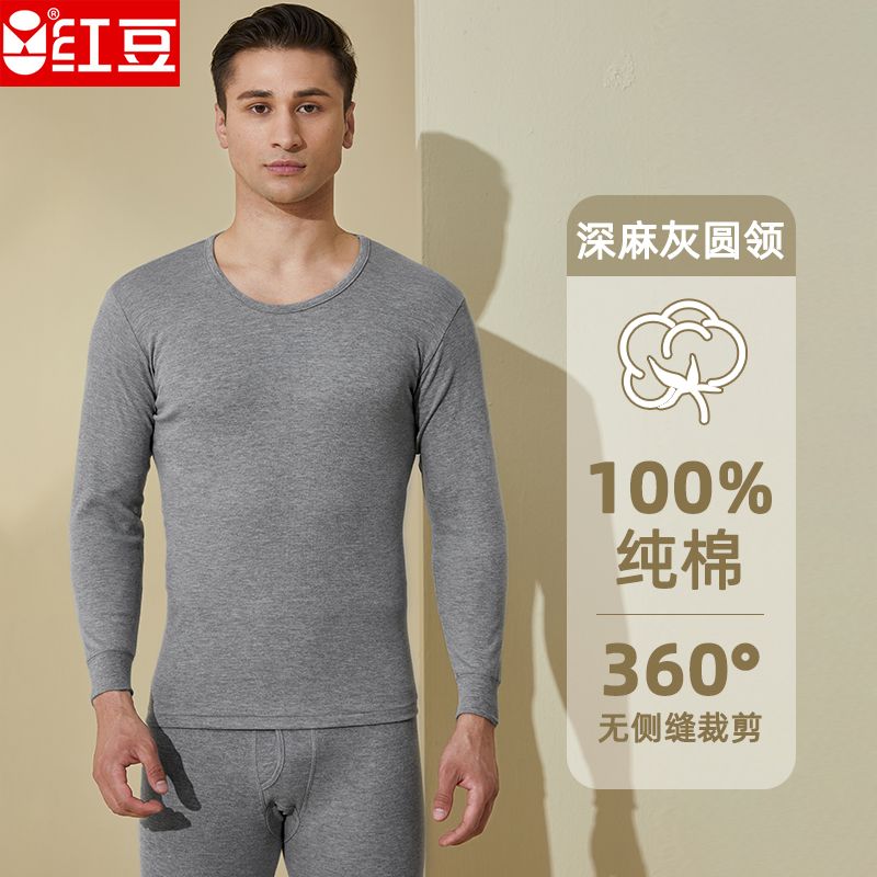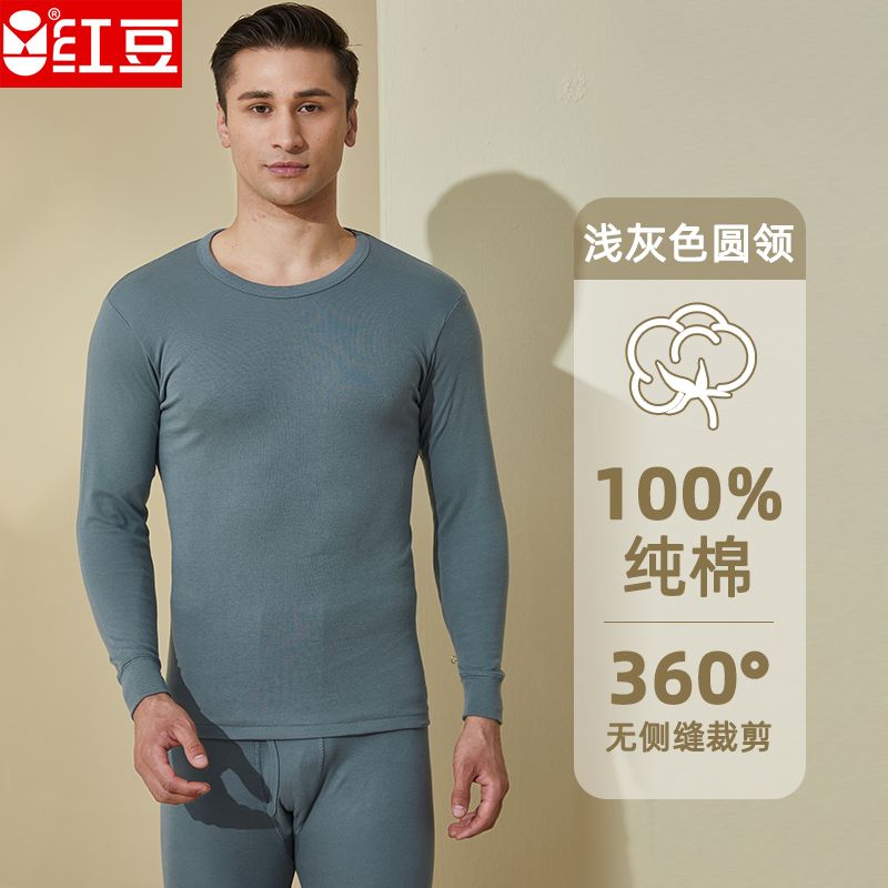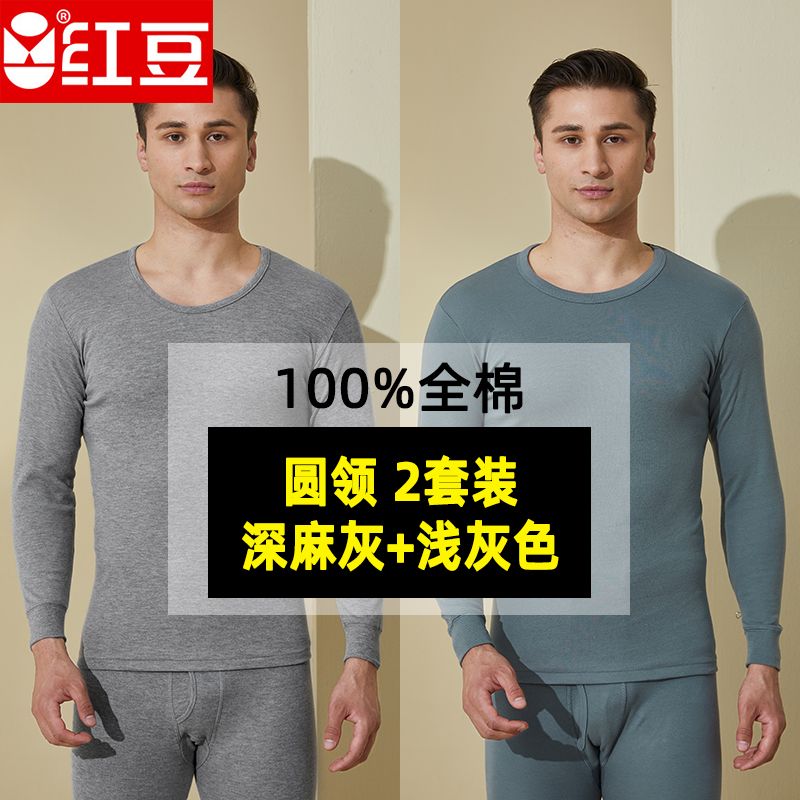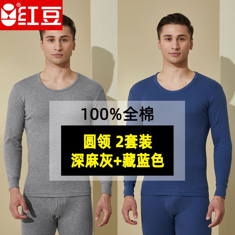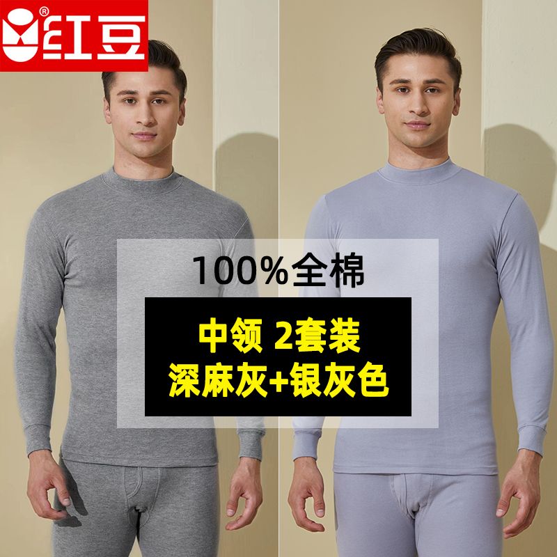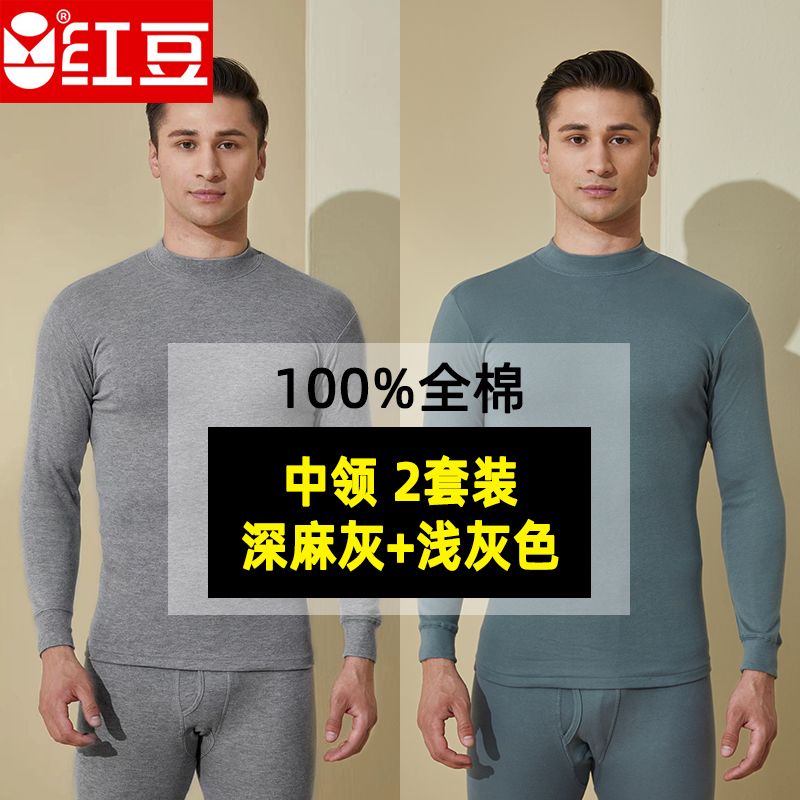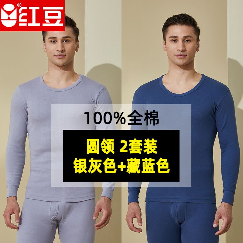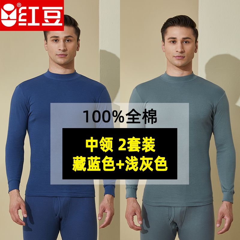 红豆【100%纯棉套装】男士秋衣秋裤圆领棉毛衫半高领秋冬保暖套装