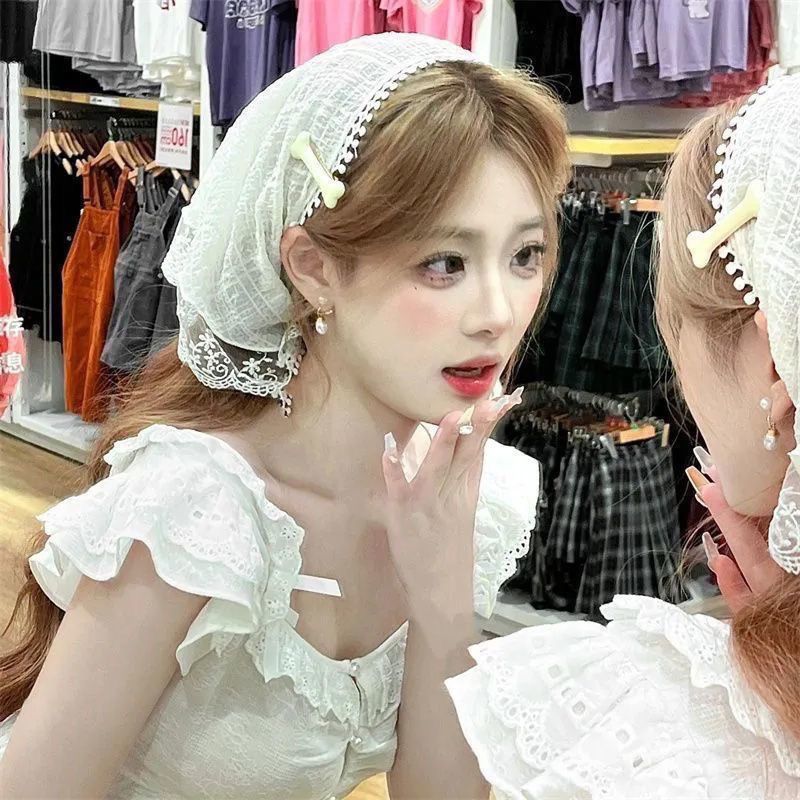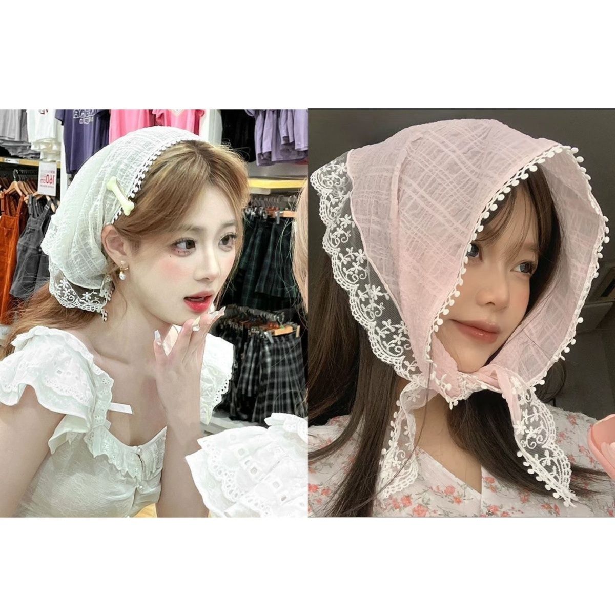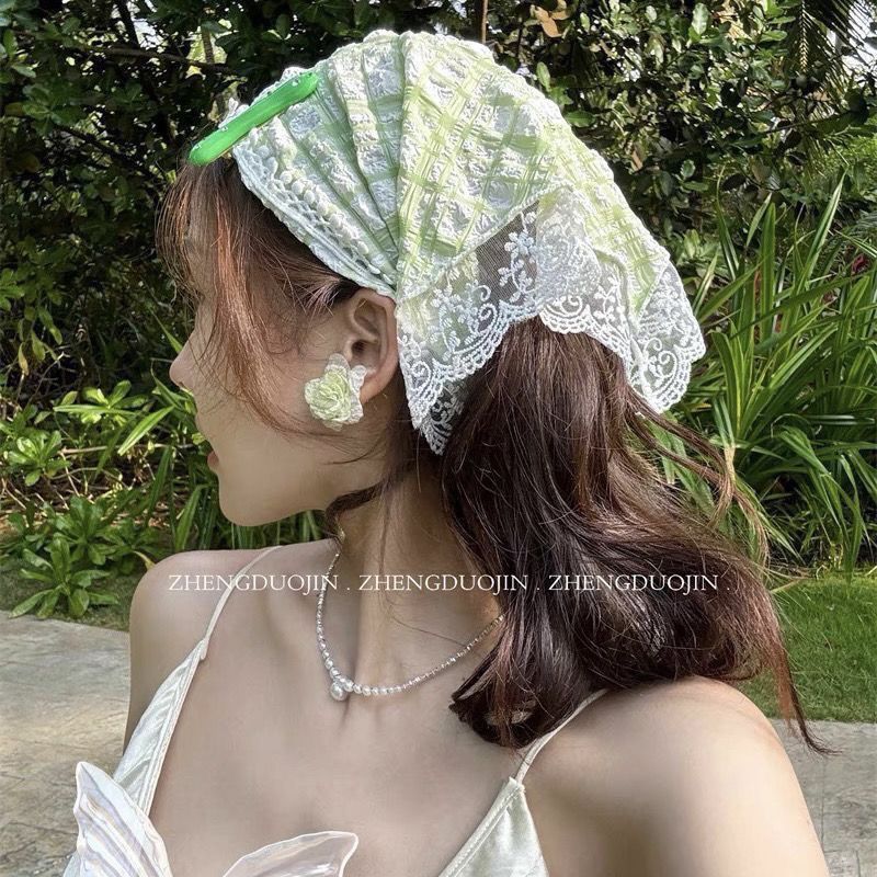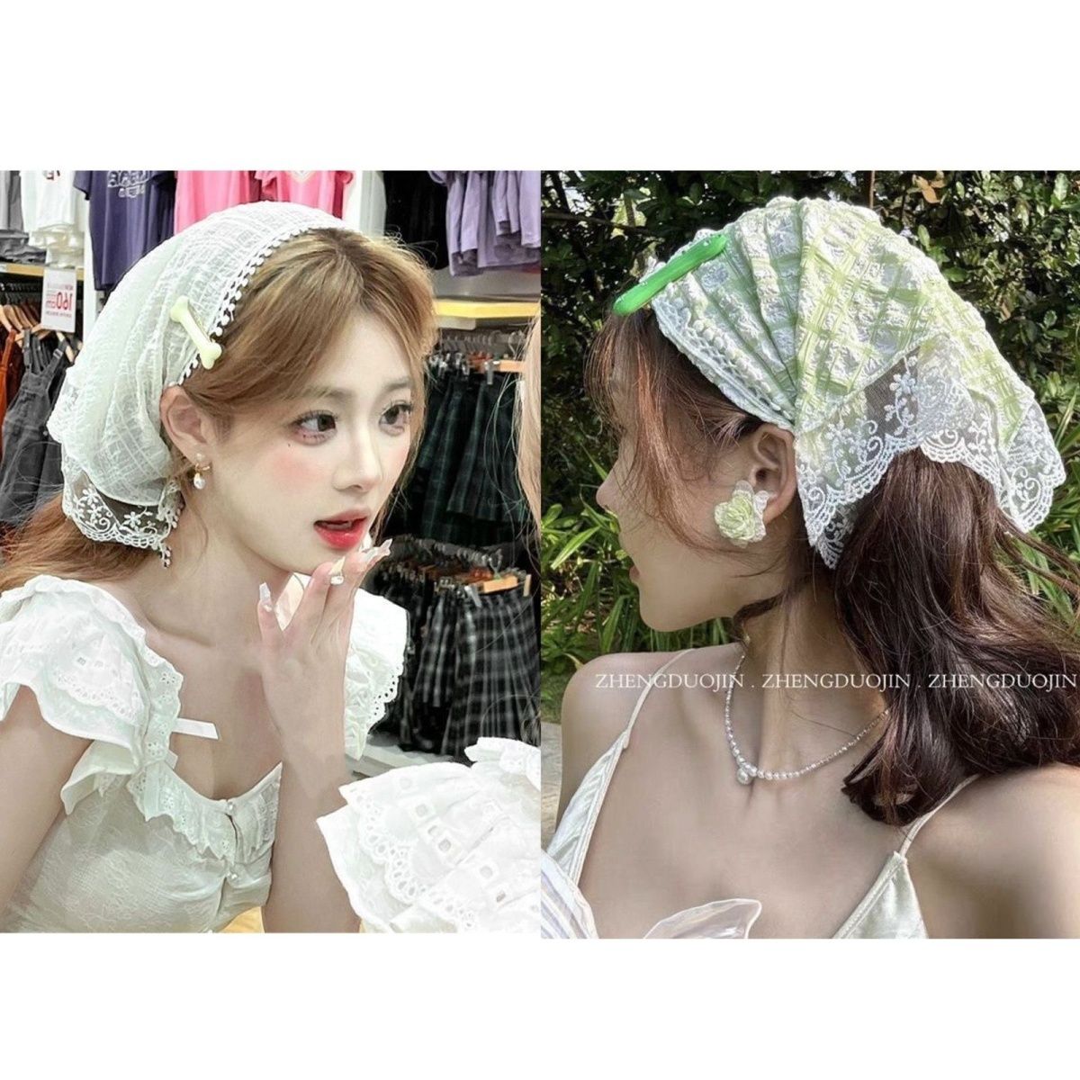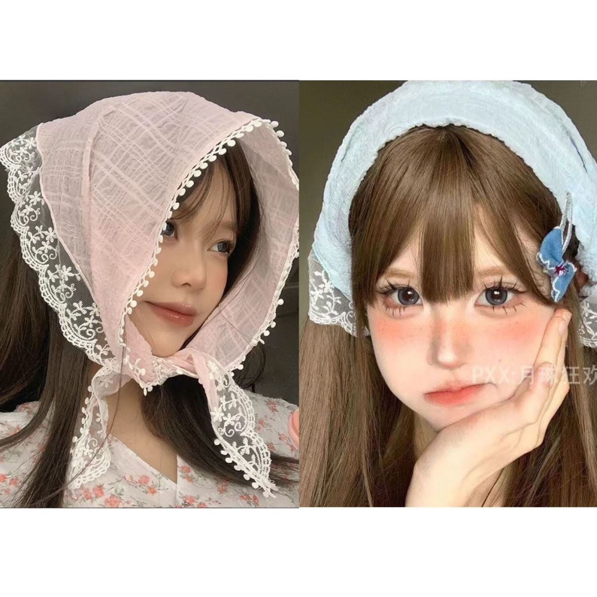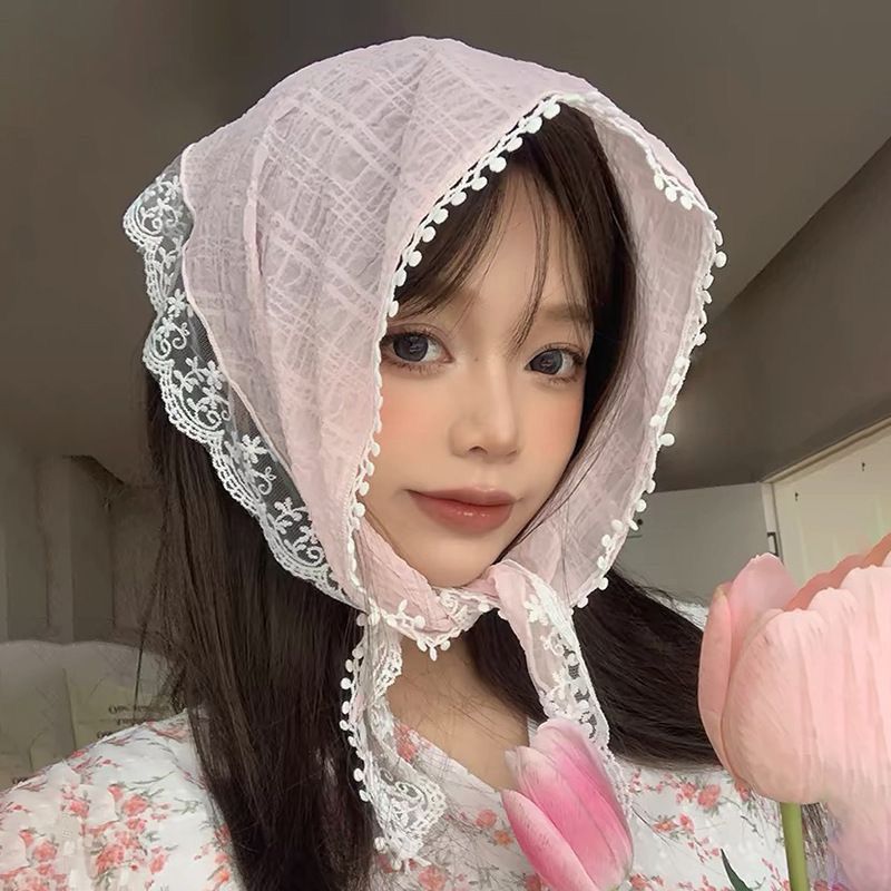法式蕾丝三角巾女花朵米色复古日系头巾发带百搭小围巾拍照发饰品