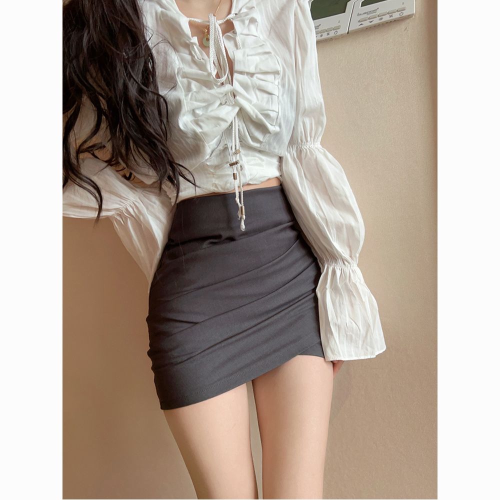 灰色西装料包臀短裙女半身裙子2024韩版高腰紧身褶皱不规则一步裙