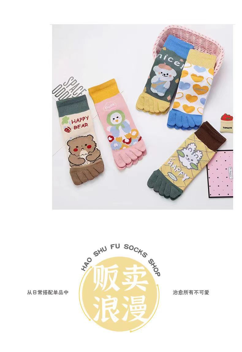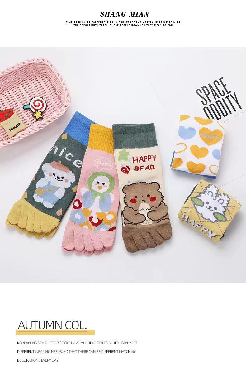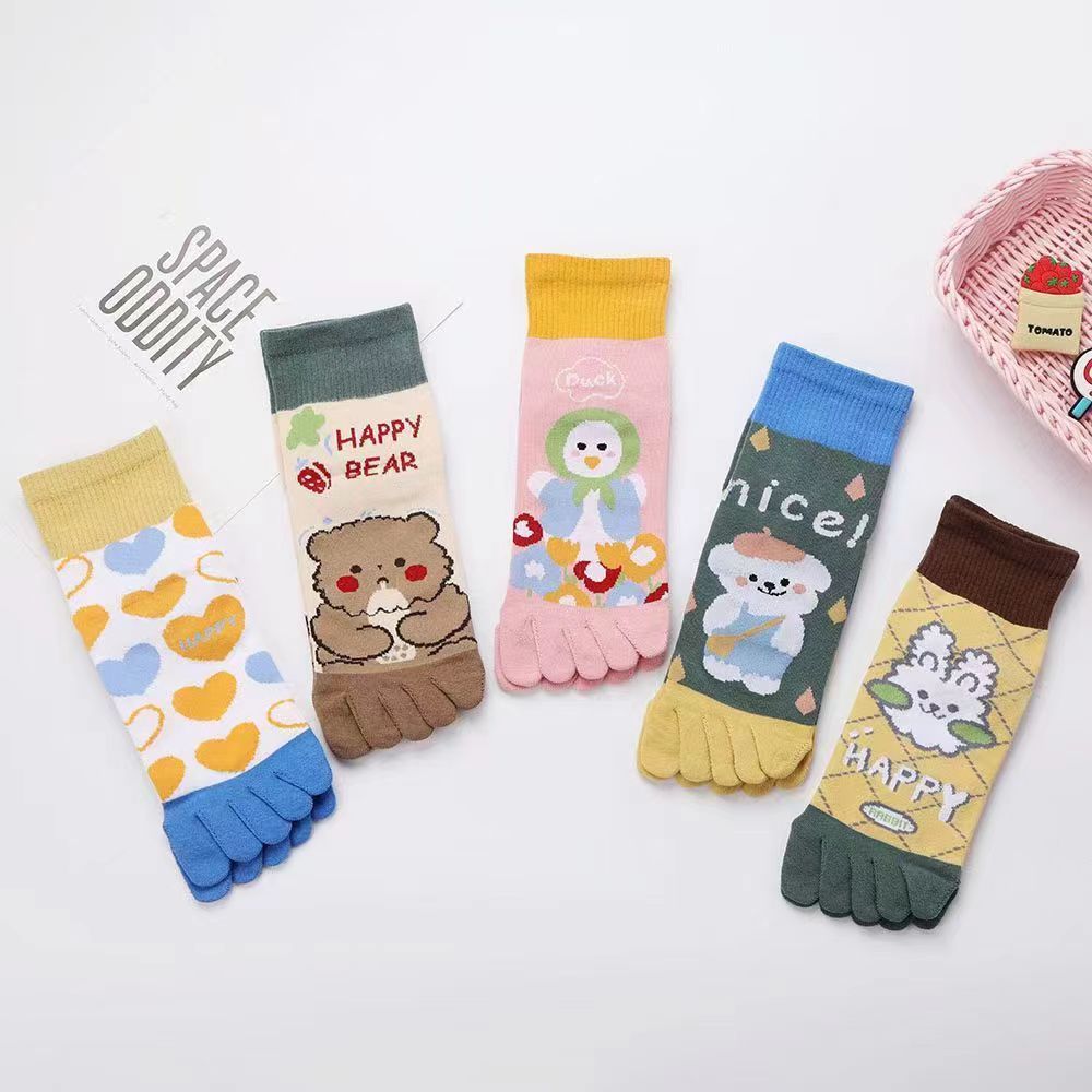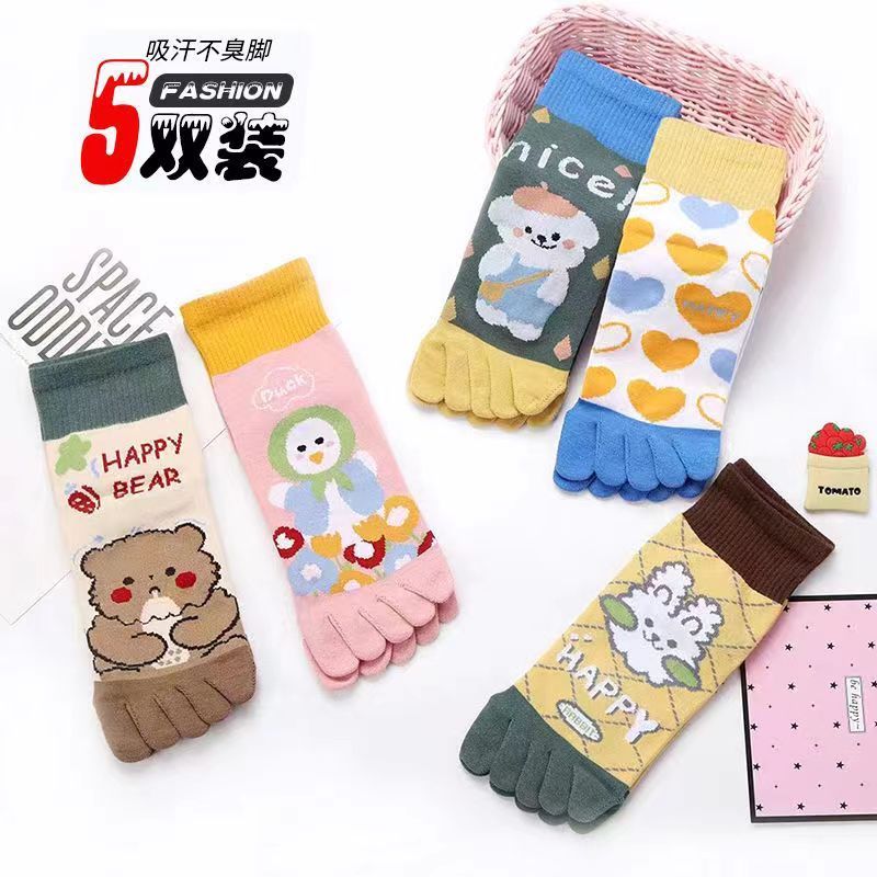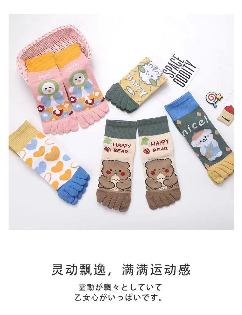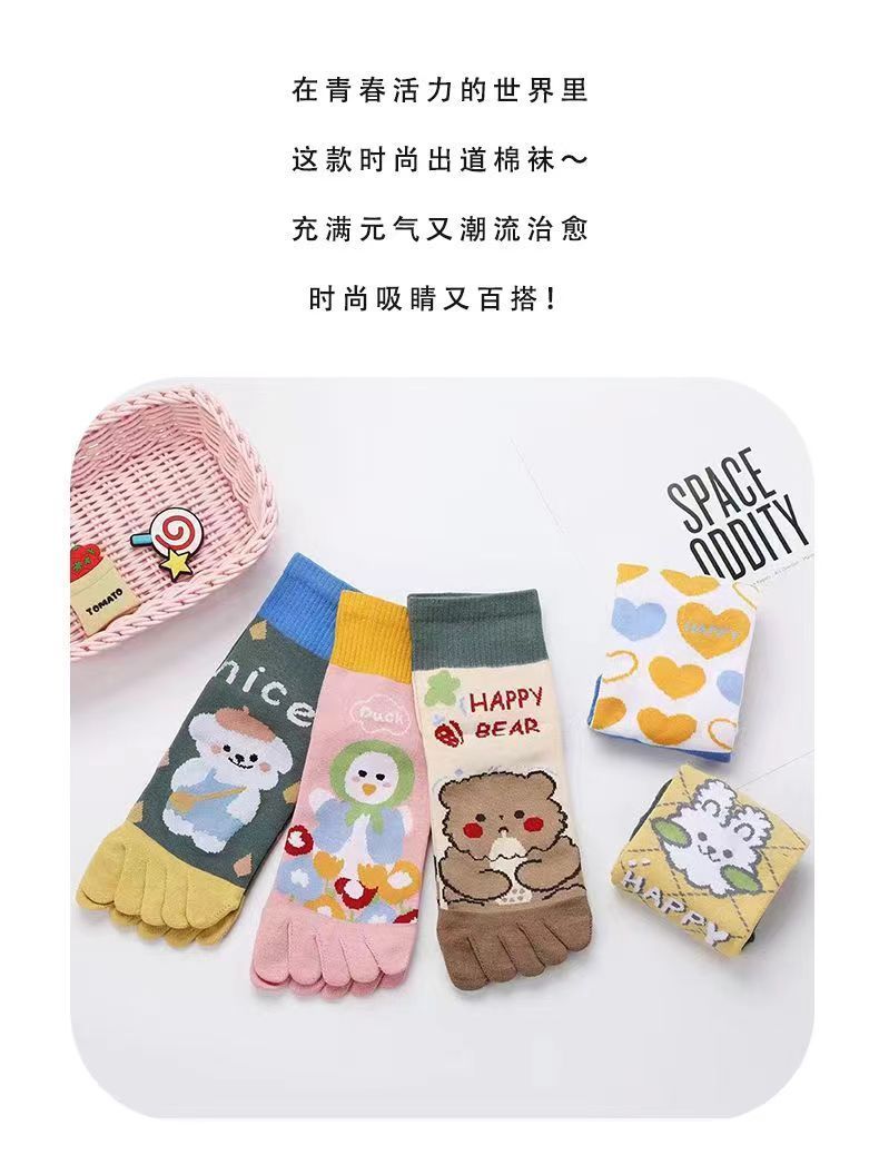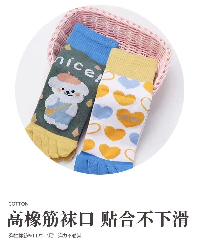 五指袜女秋冬款100%纯棉中筒袜子网红卡通可爱透气吸汗分趾袜子