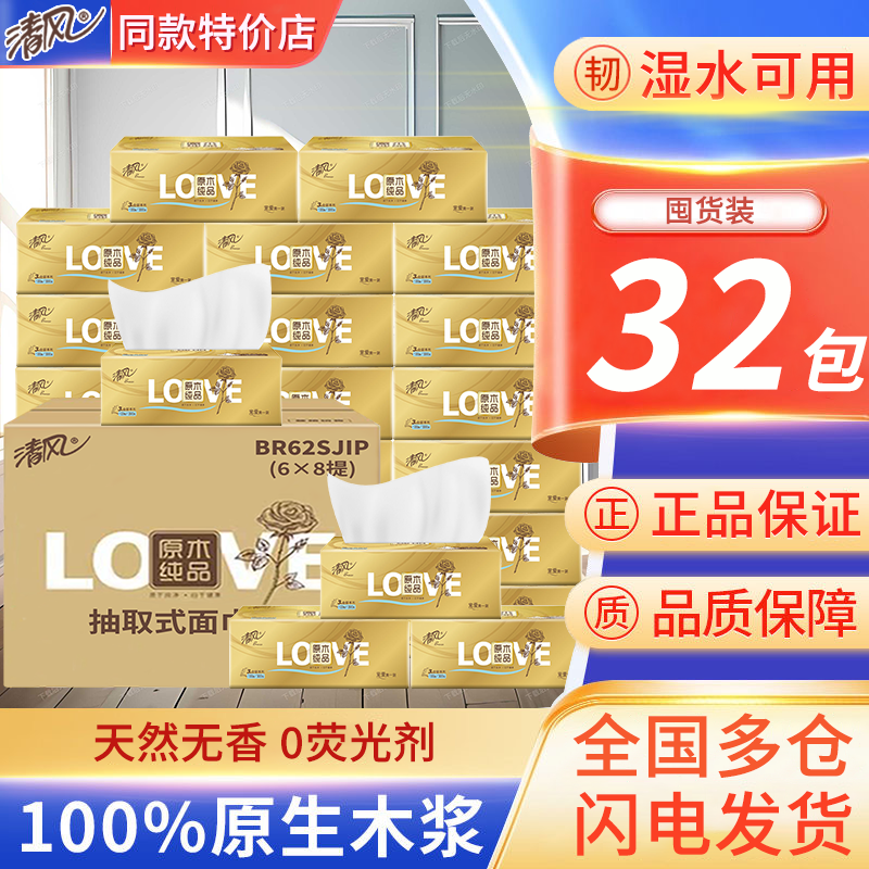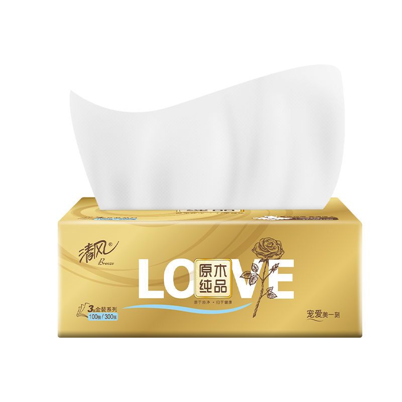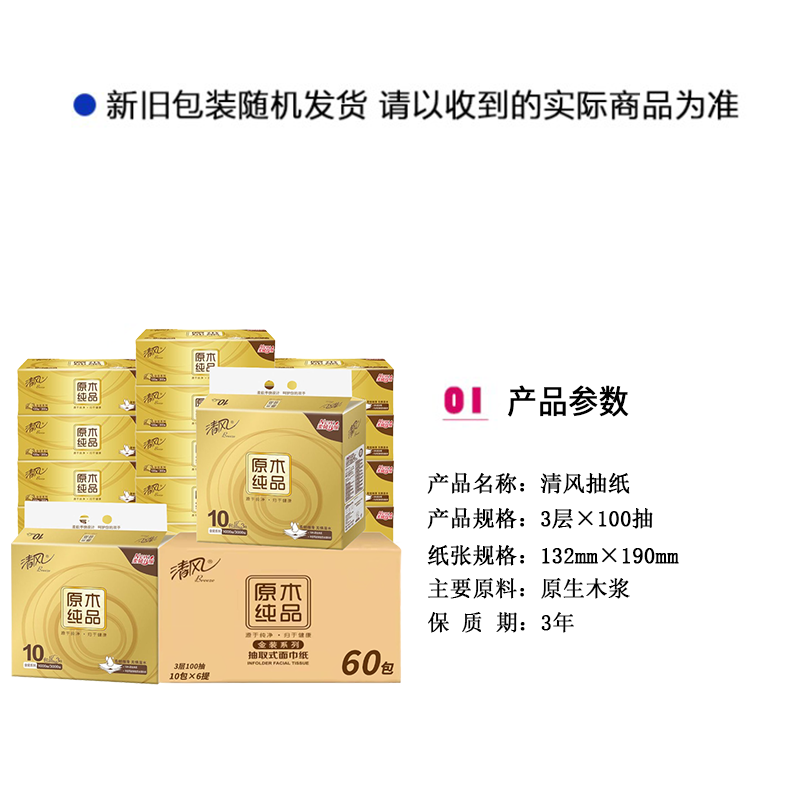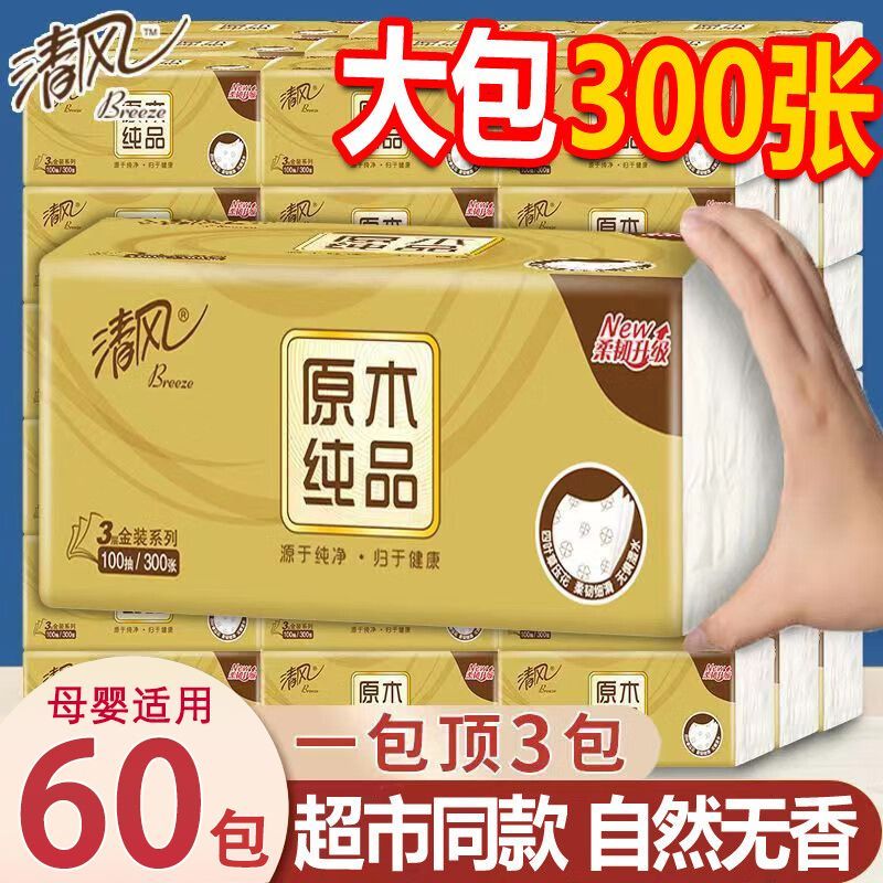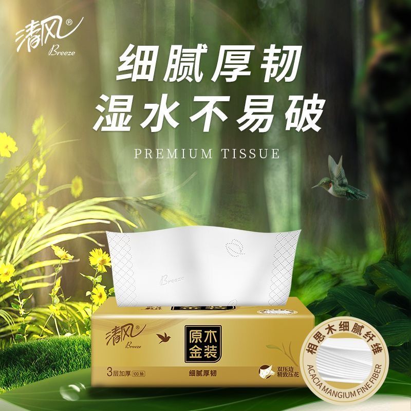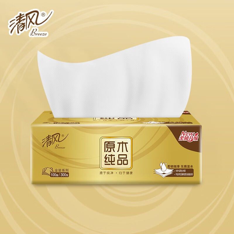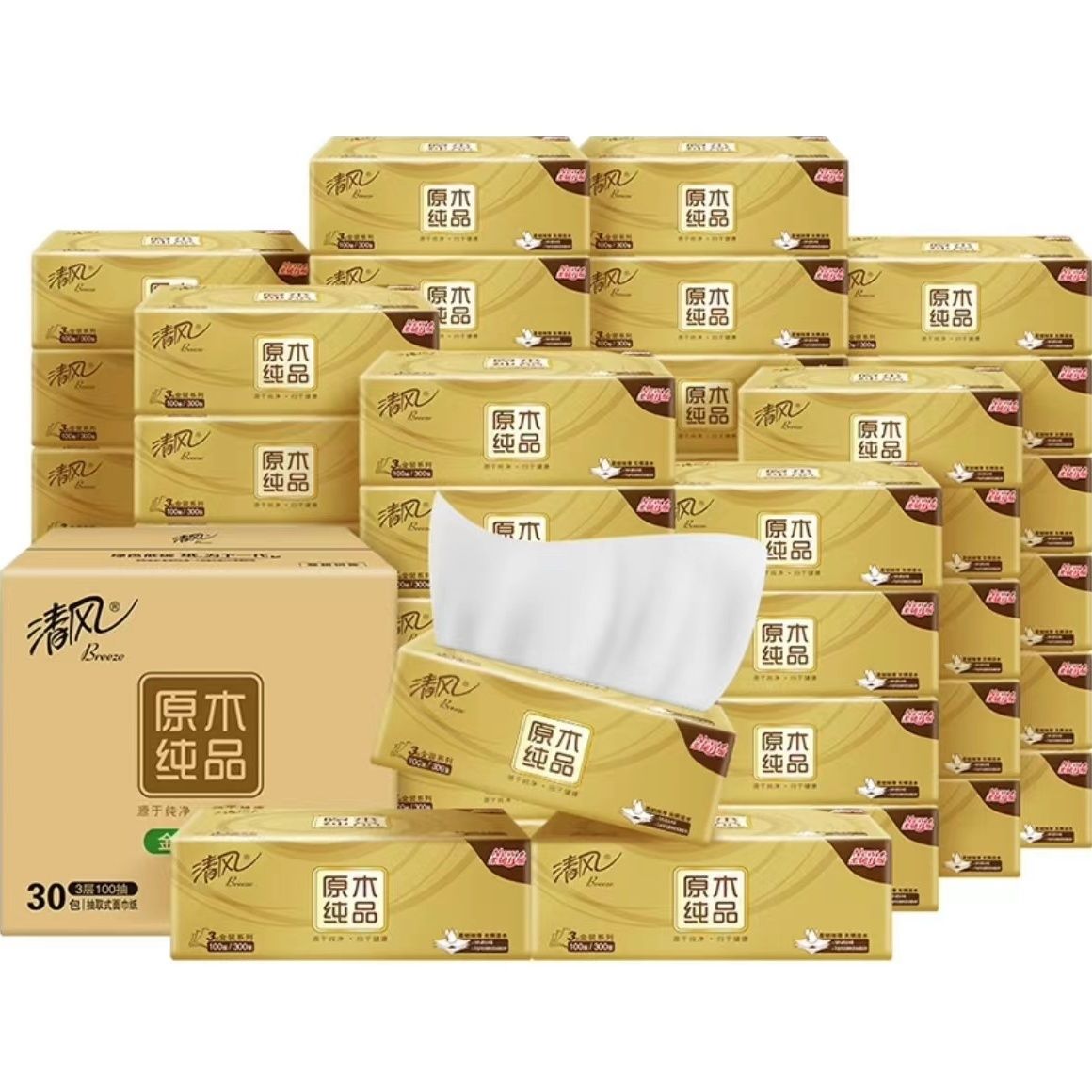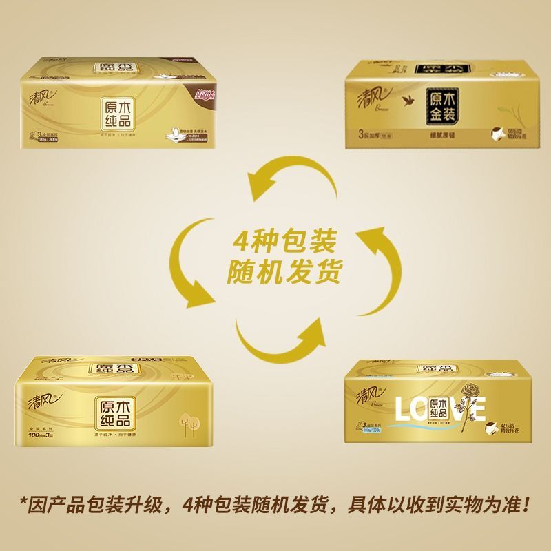 清风抽纸金装原木纸巾3层100抽S码大包餐巾纸卫生整箱面巾纸批发