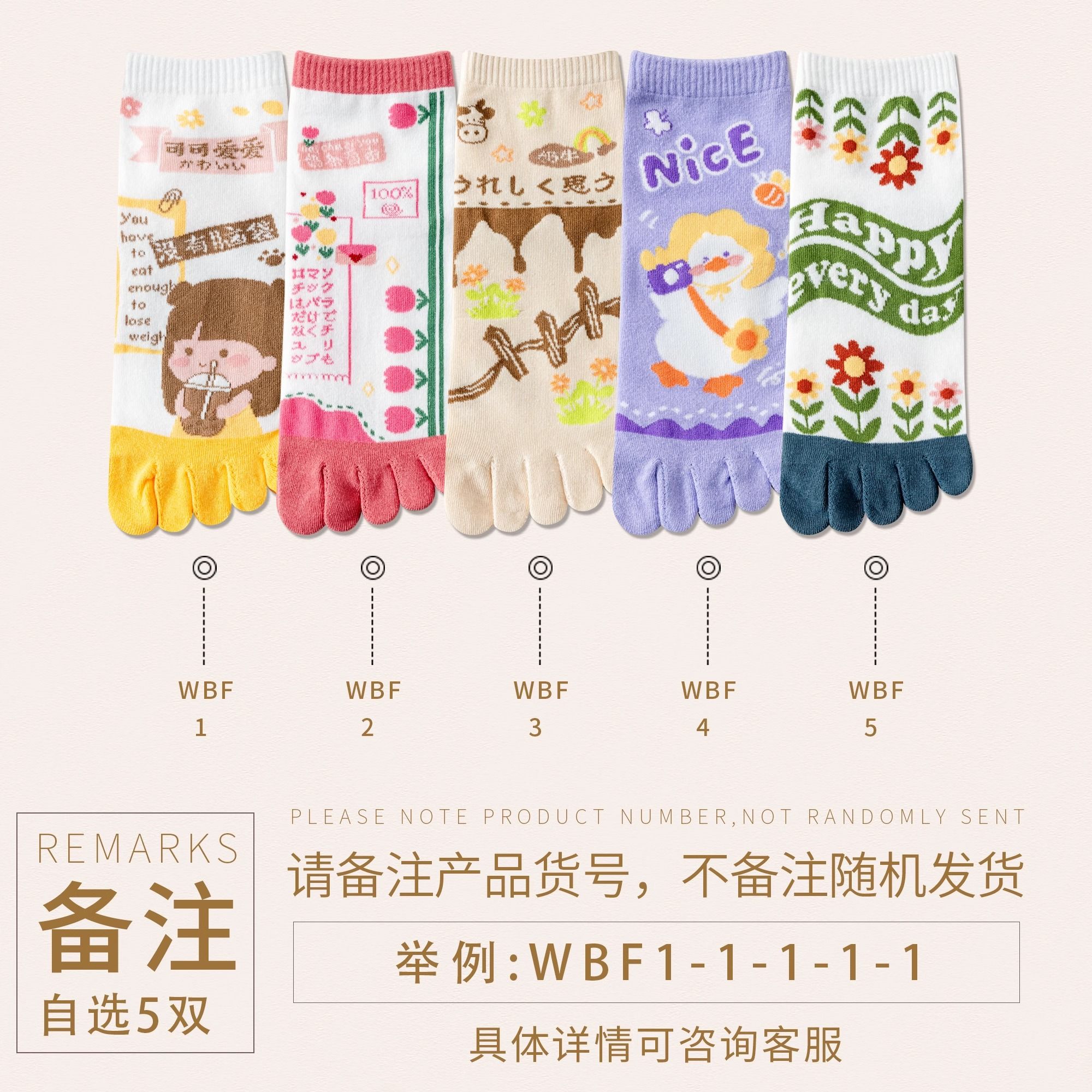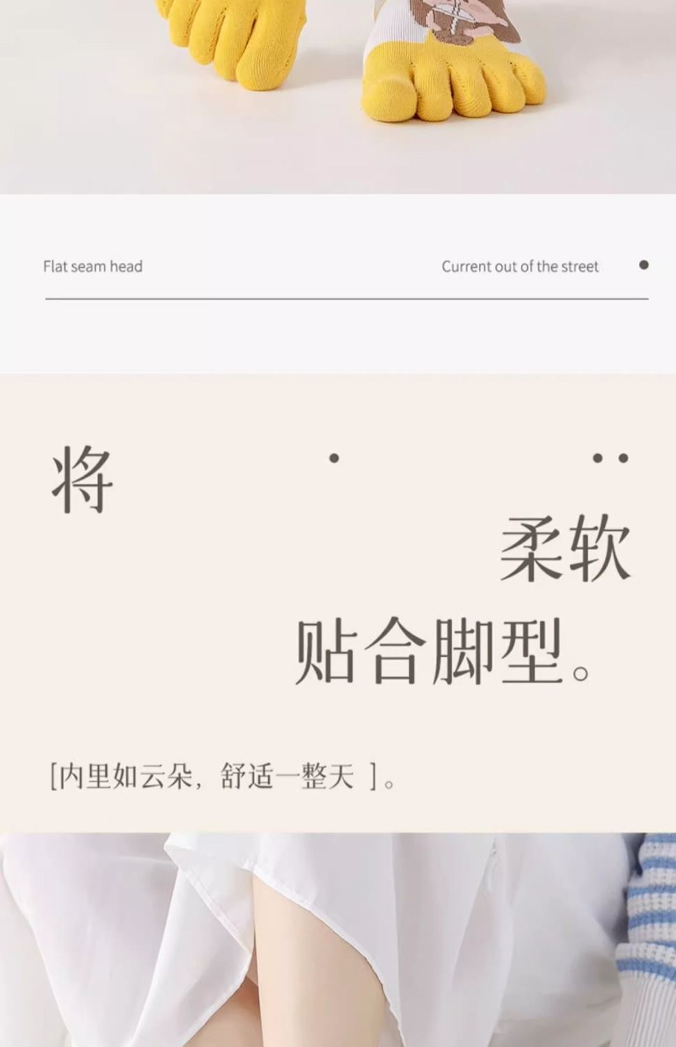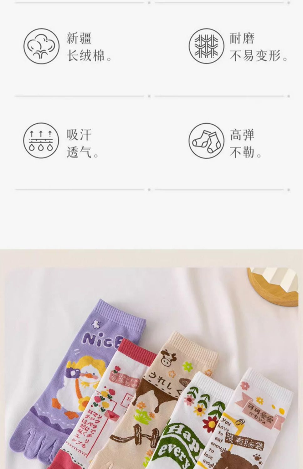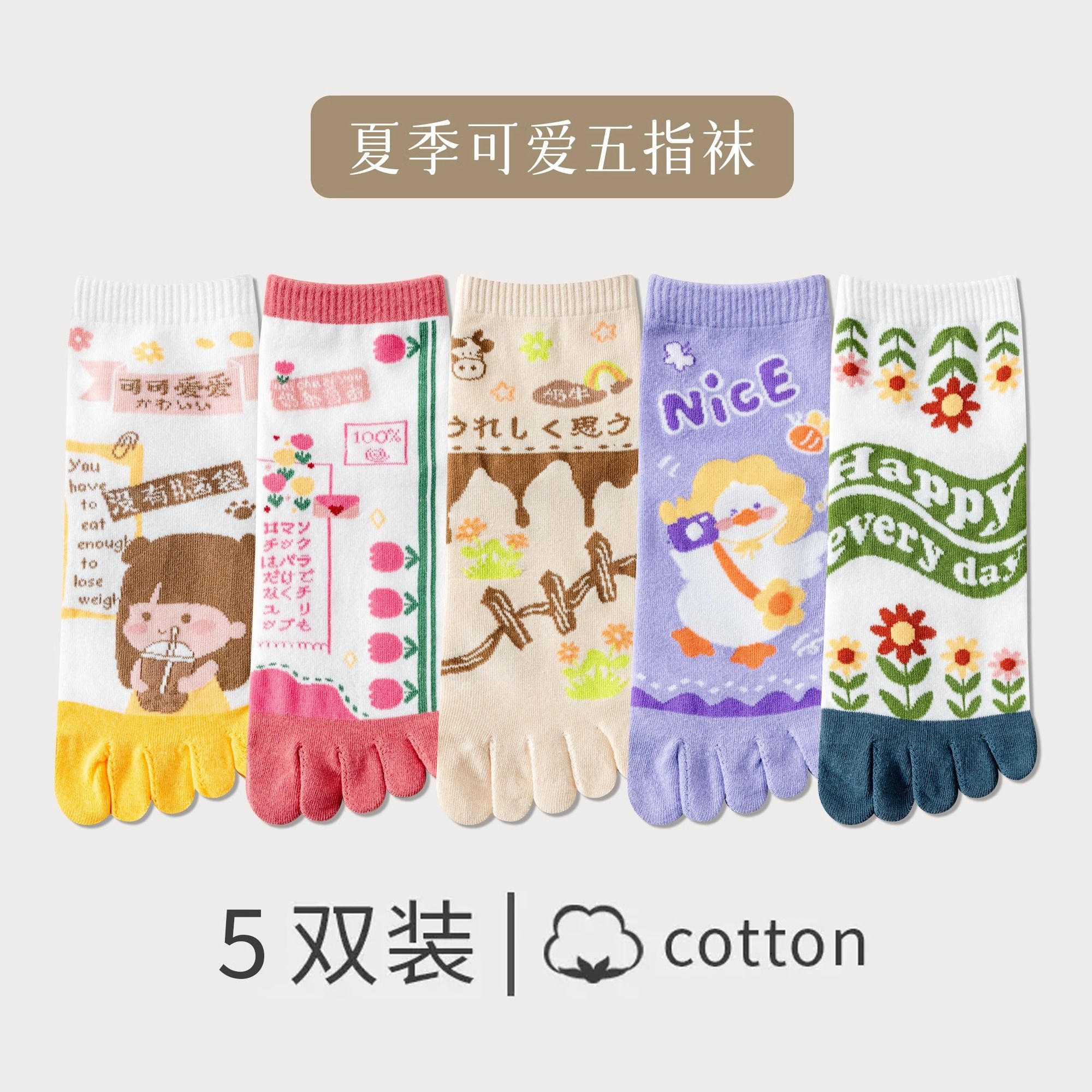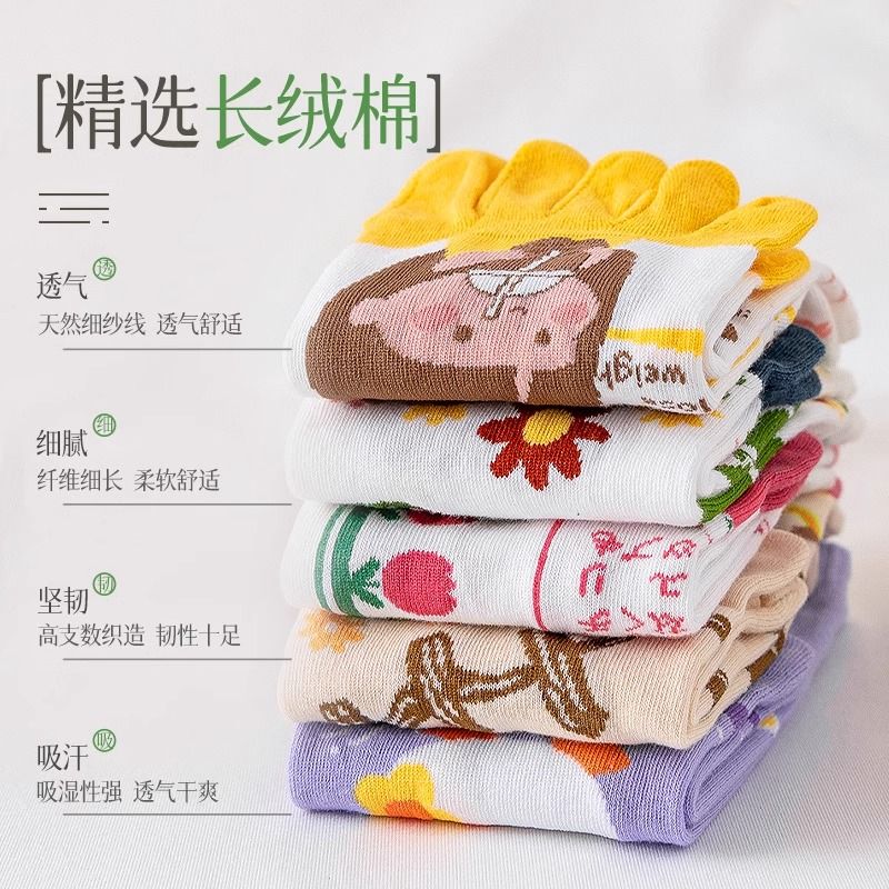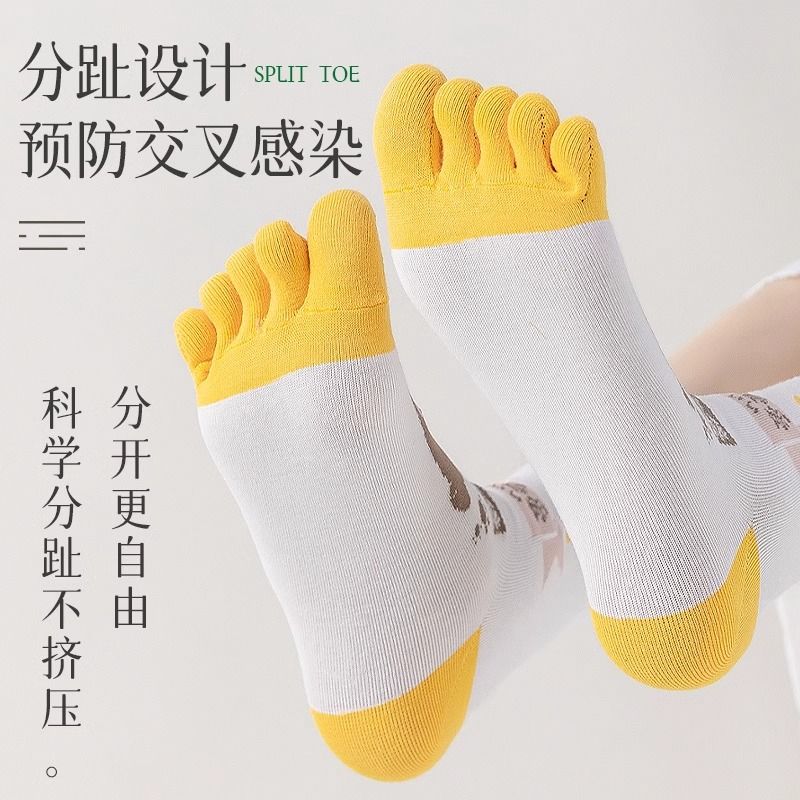 五指袜子女士夏季中筒袜纯棉防臭卡通吸汗透气脚趾袜夏天分趾