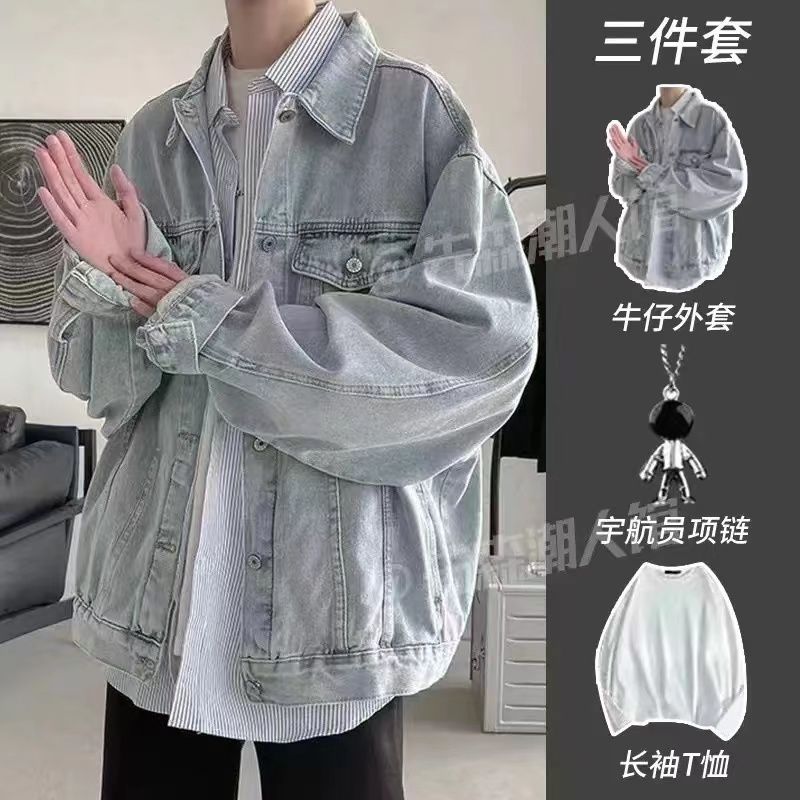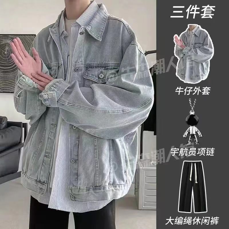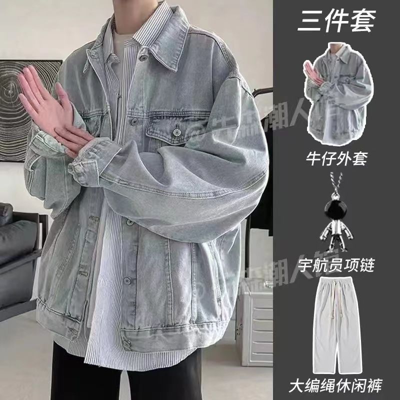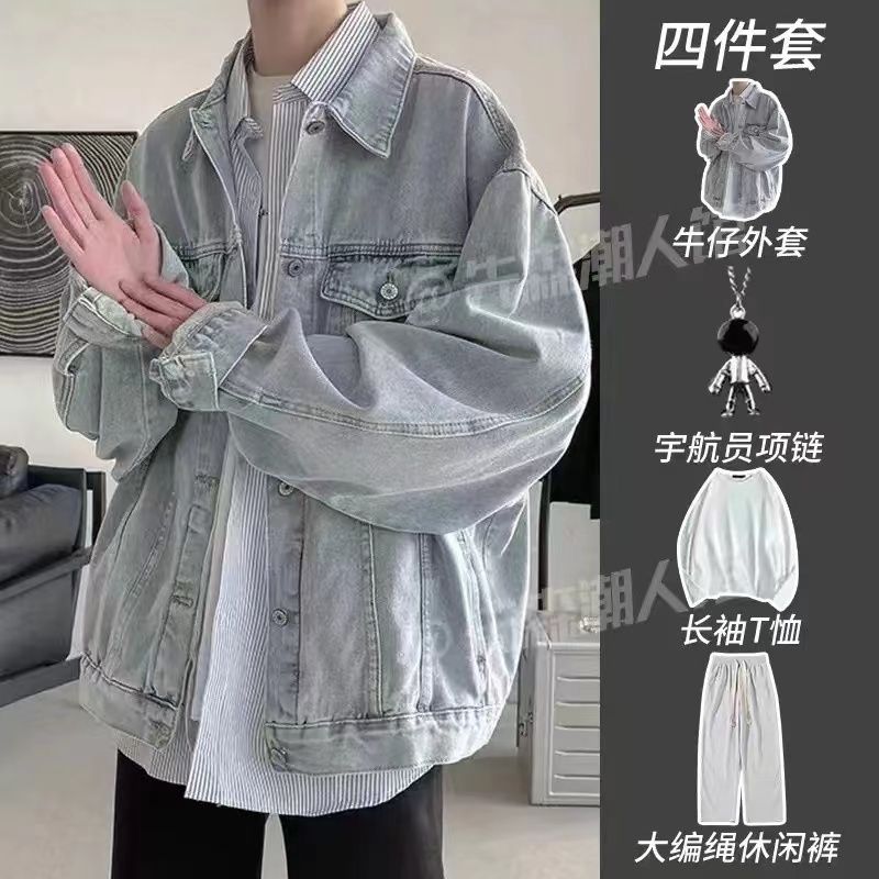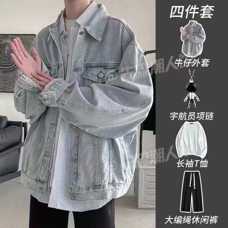 【四件套】秋季高级感轻奢浅蓝复古牛仔外套男搭配高街直筒休闲裤