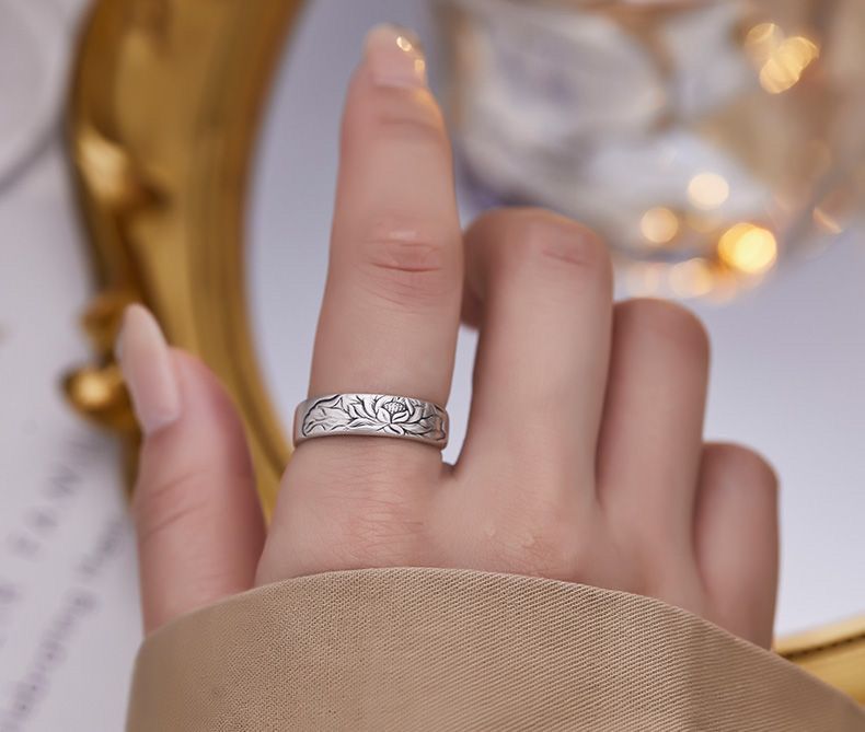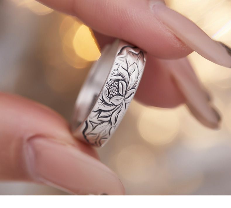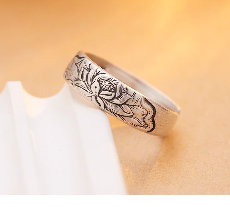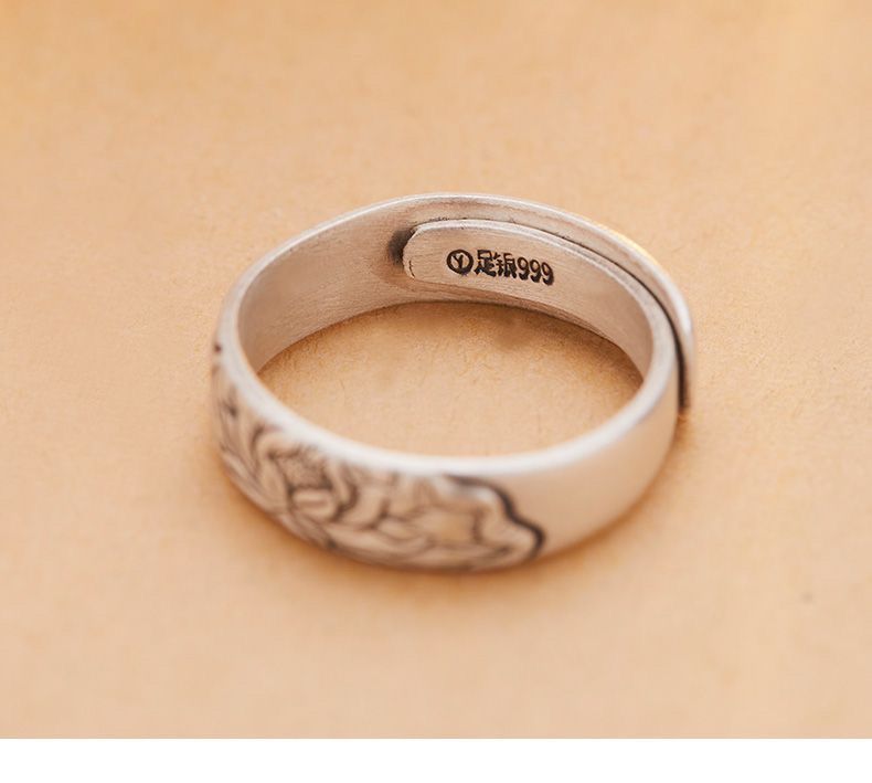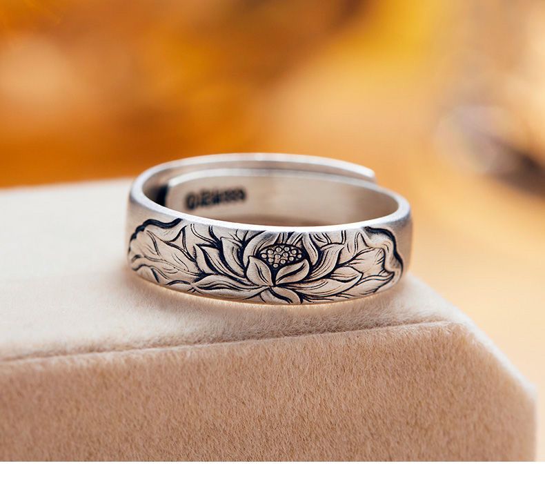 999纯银复古莲花手工开口纯银指环个性时尚花戒古法银戒指