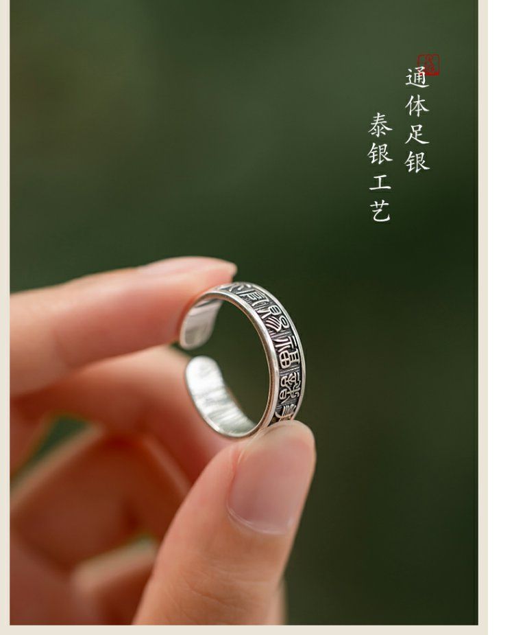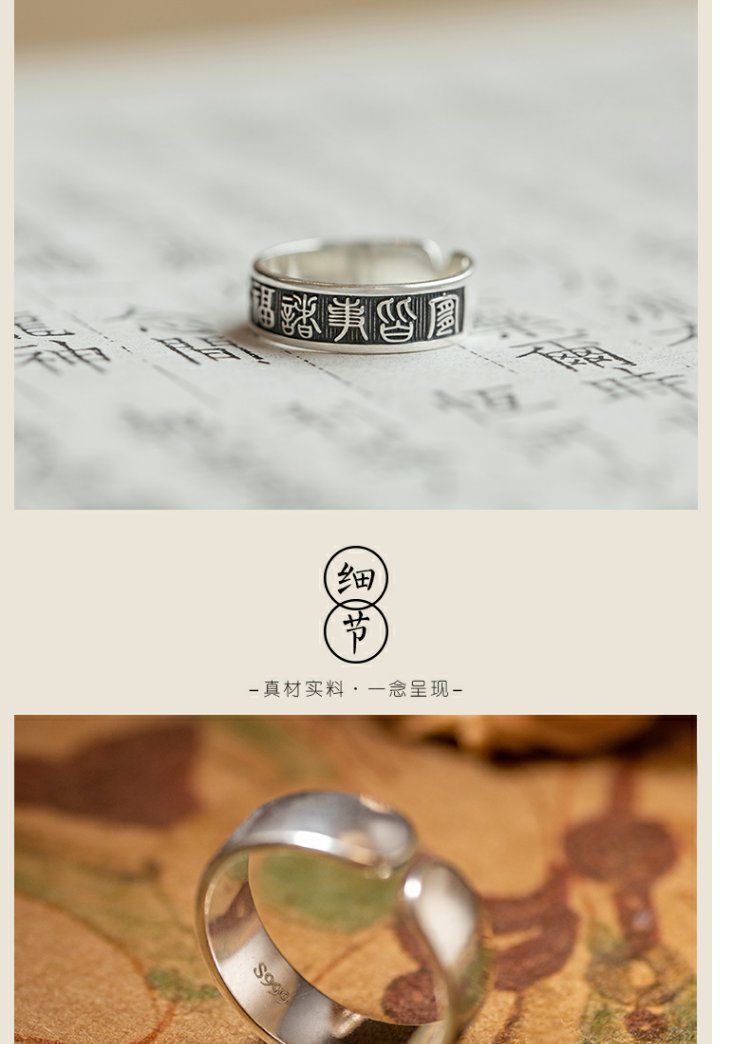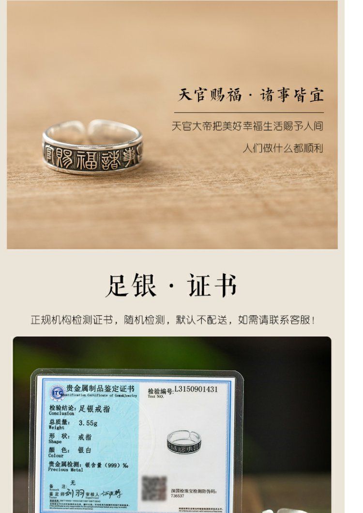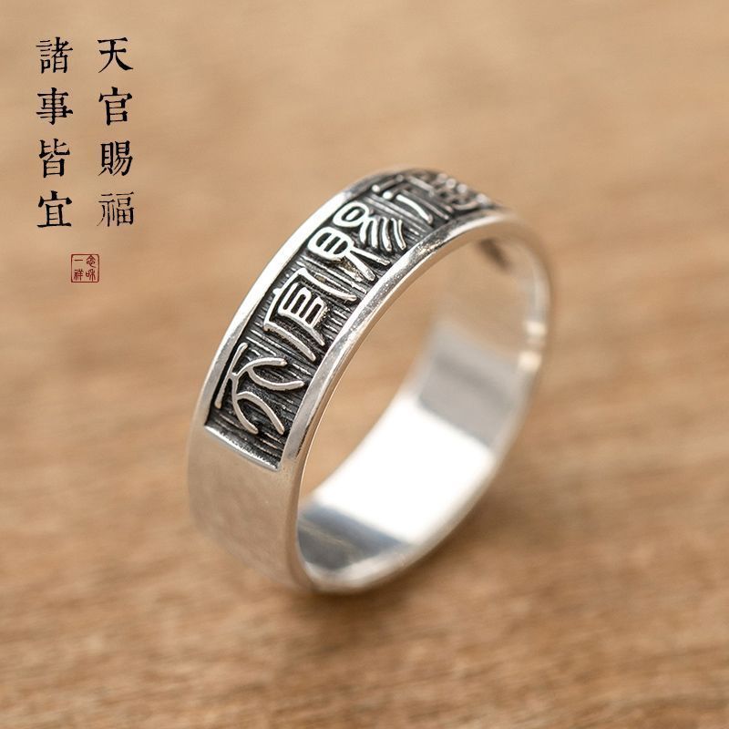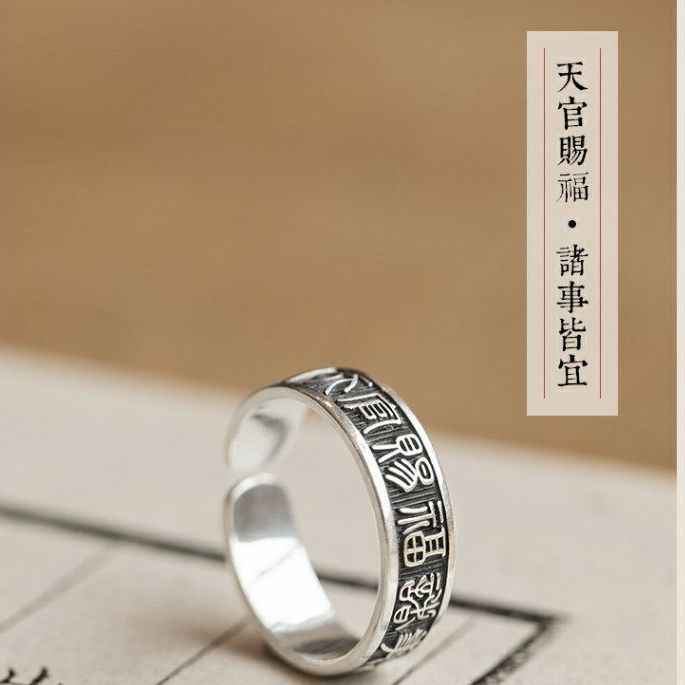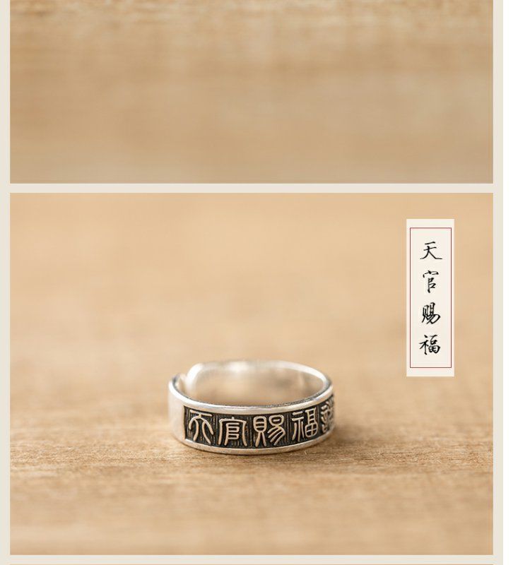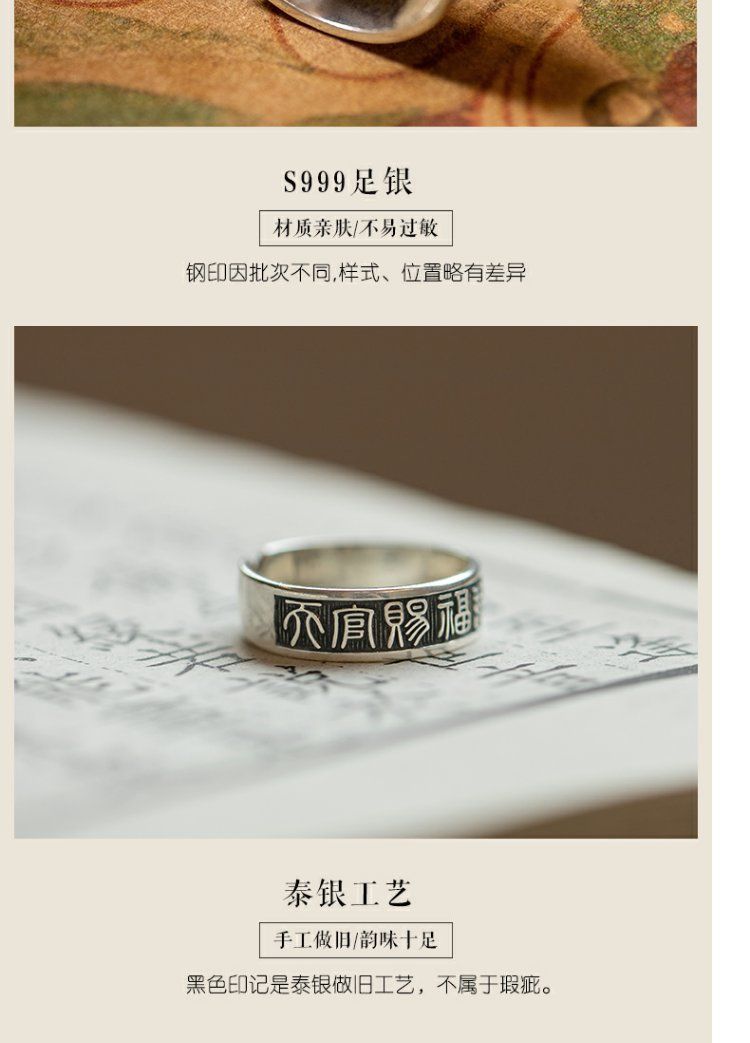 《天官赐福诸事皆宜》999纯银文艺复古戒指男女开口指环正版ins