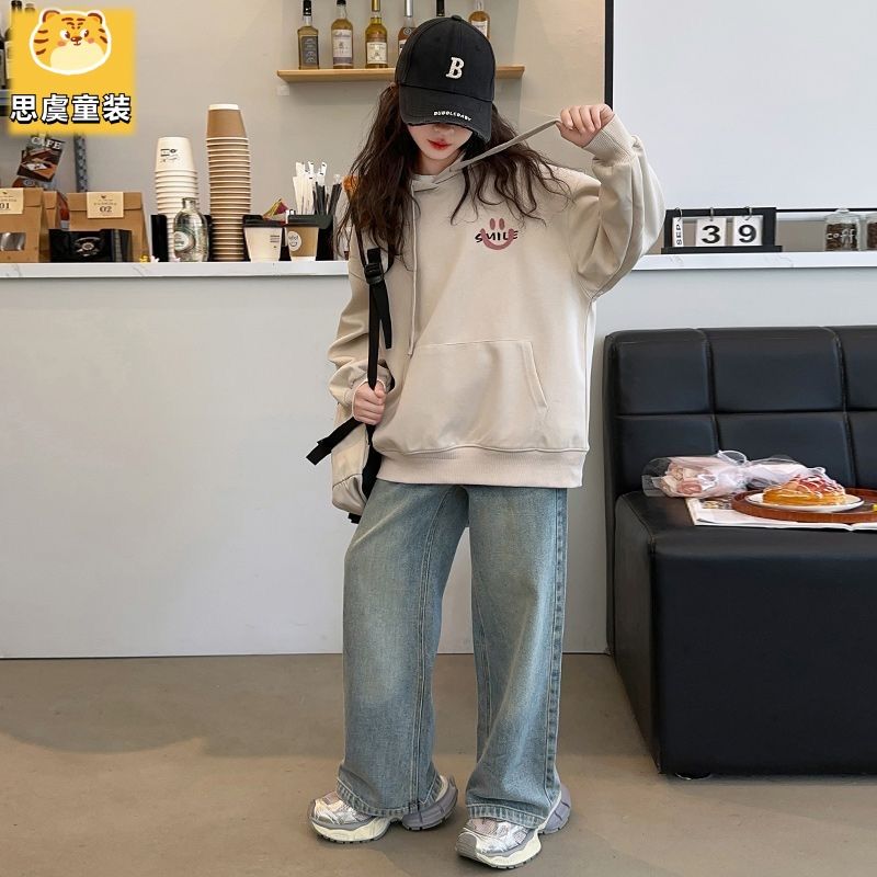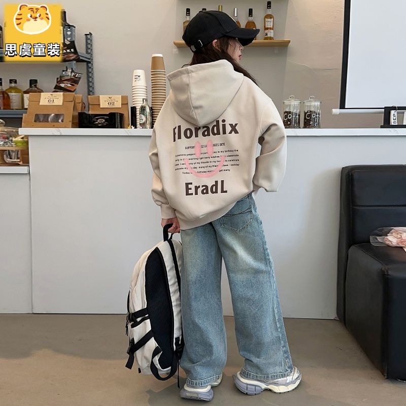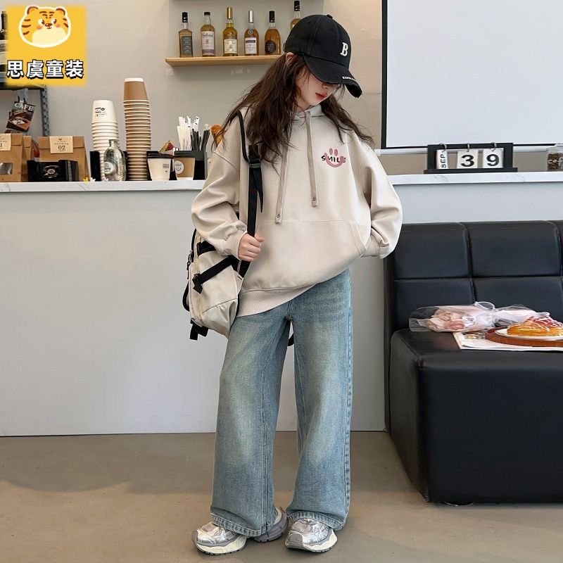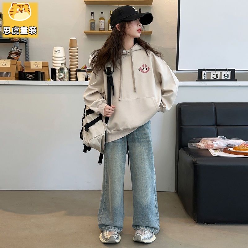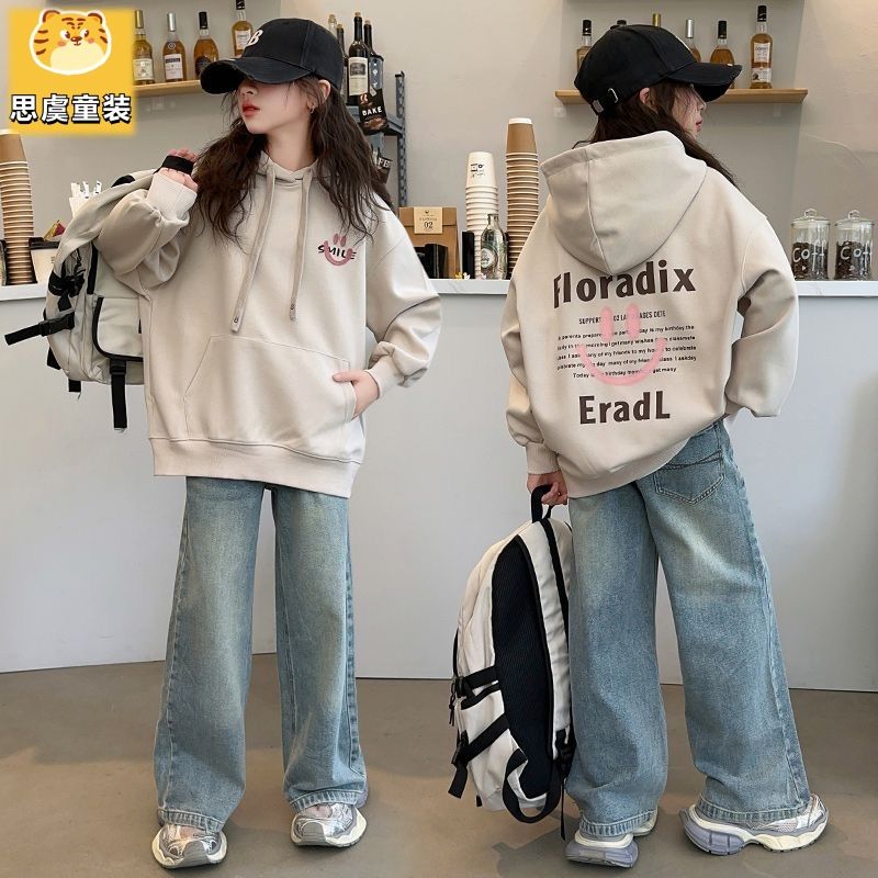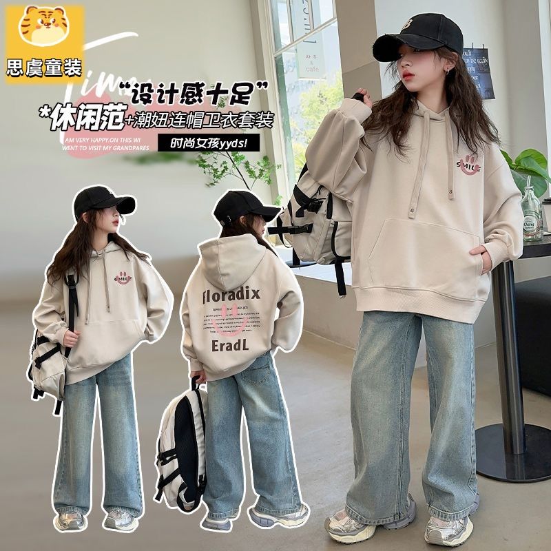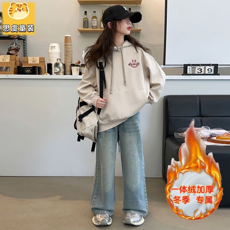 女童春秋卫衣套装秋冬洋气加绒2025中大童儿童牛仔阔腿裤两件套