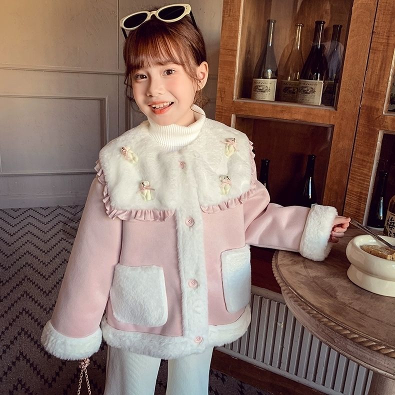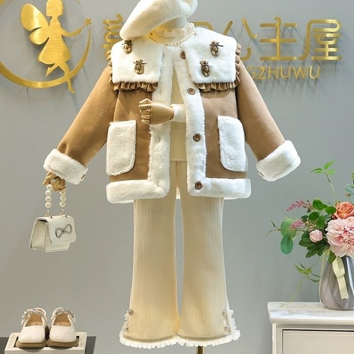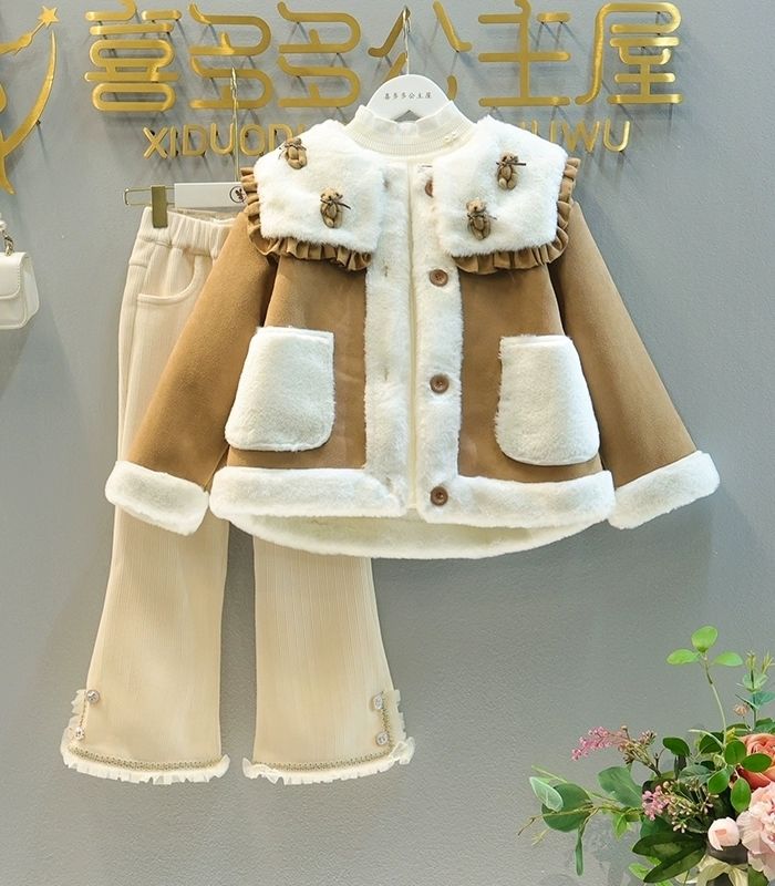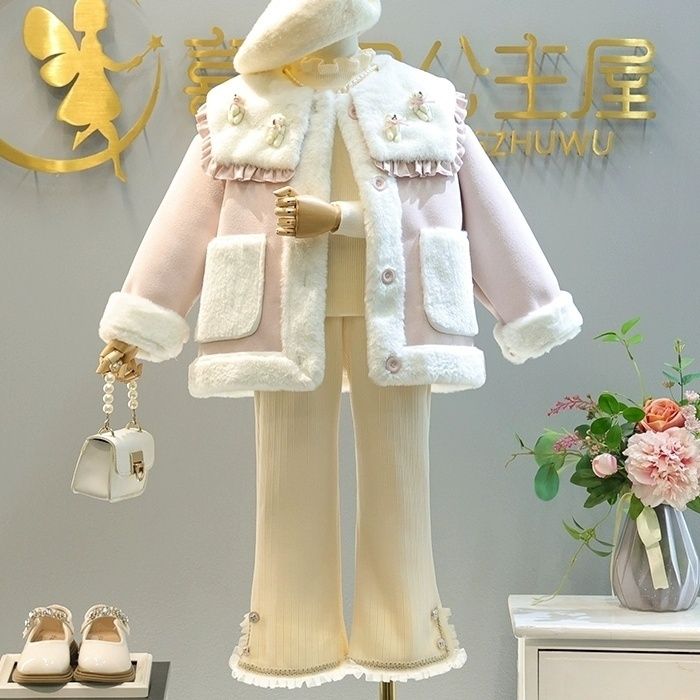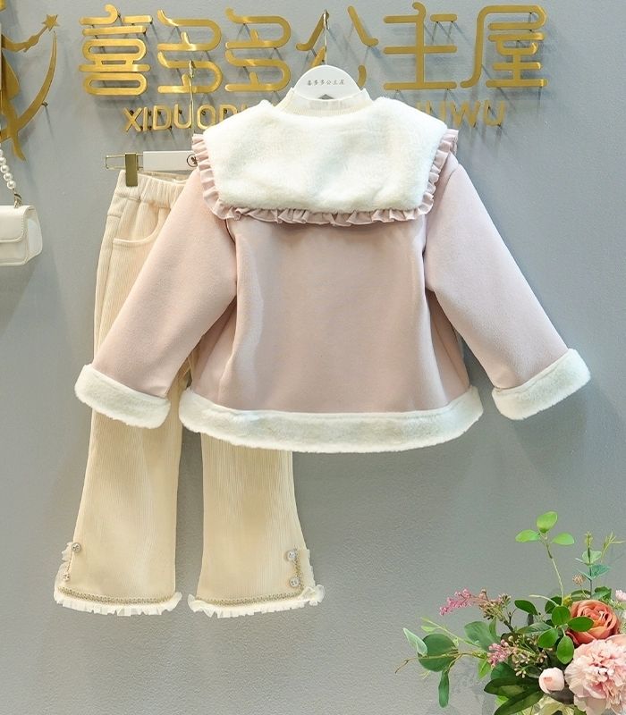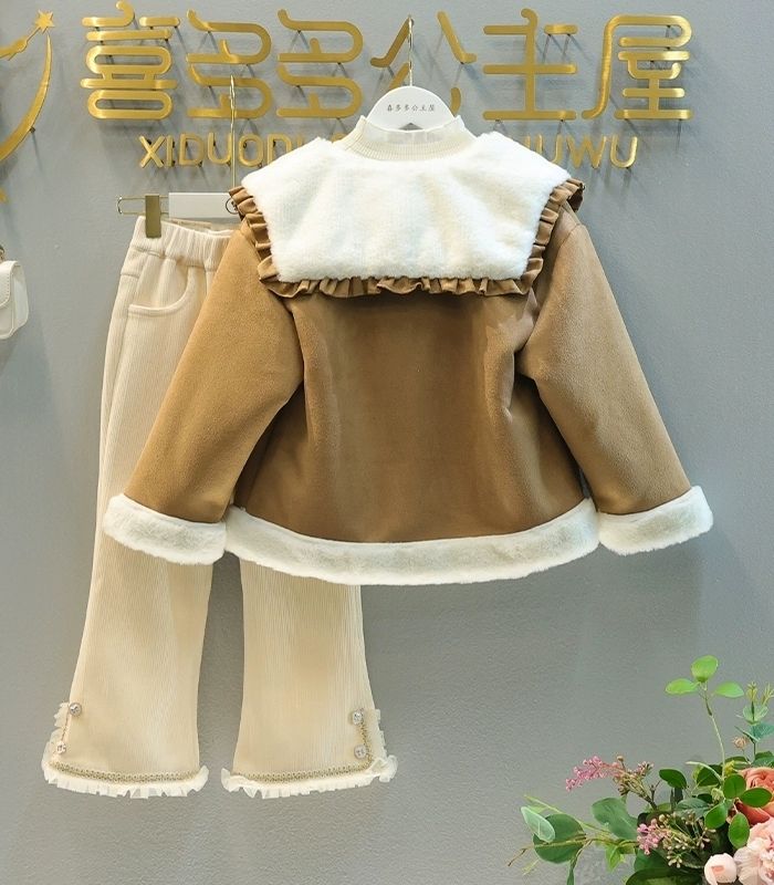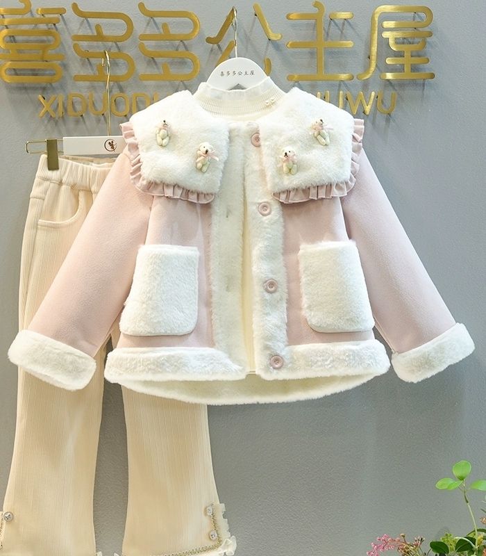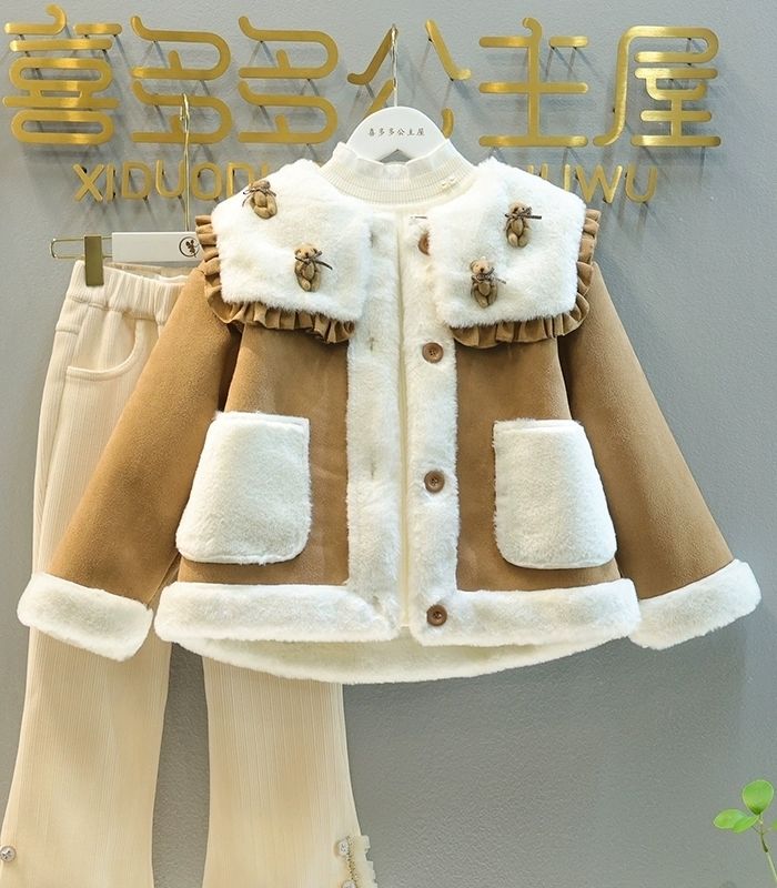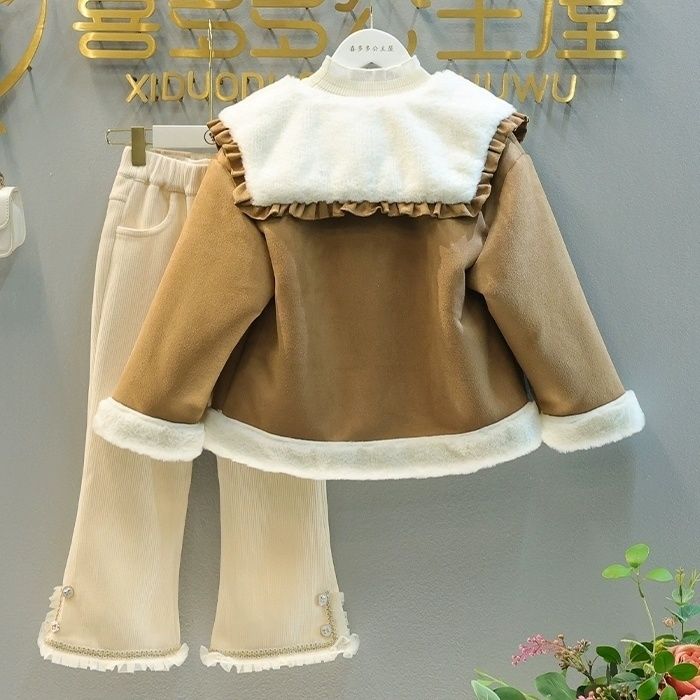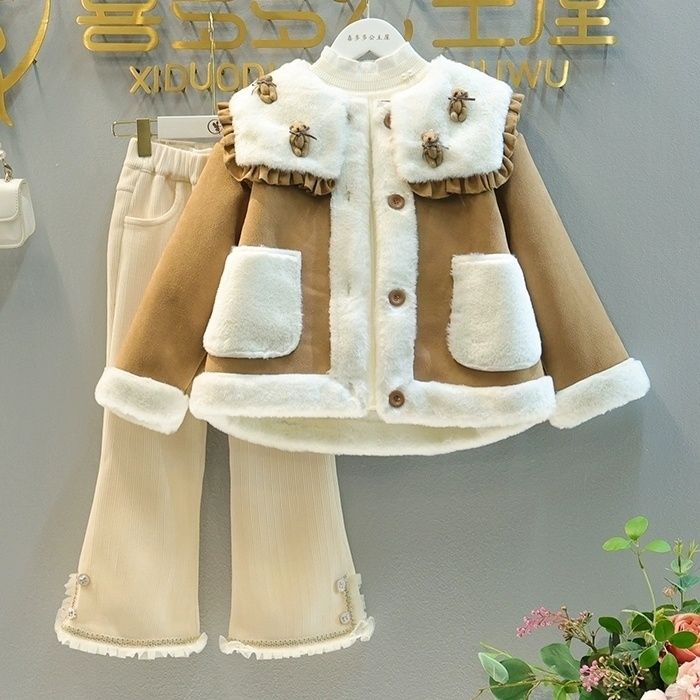 女童冬季套装2023新款韩版女宝宝皮毛一体加绒加厚外套裤子两件套