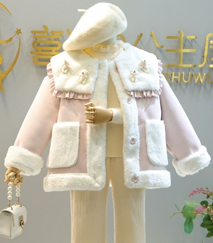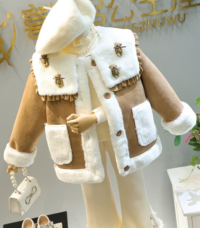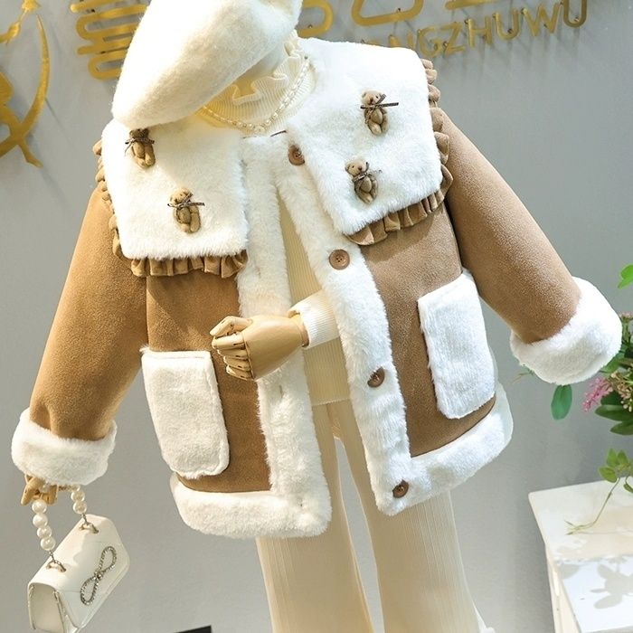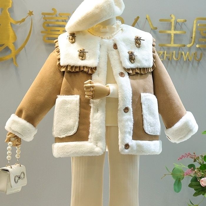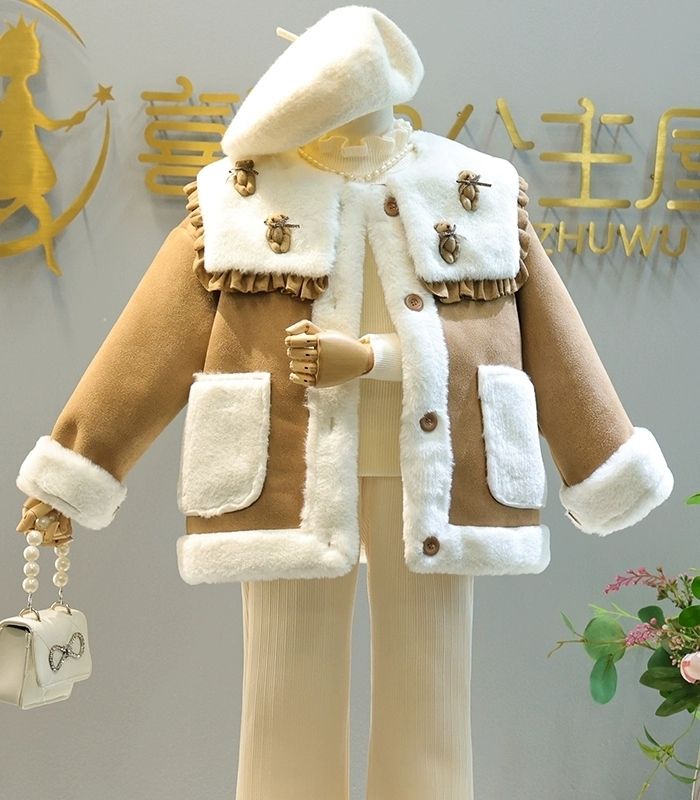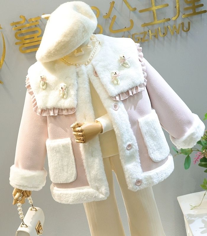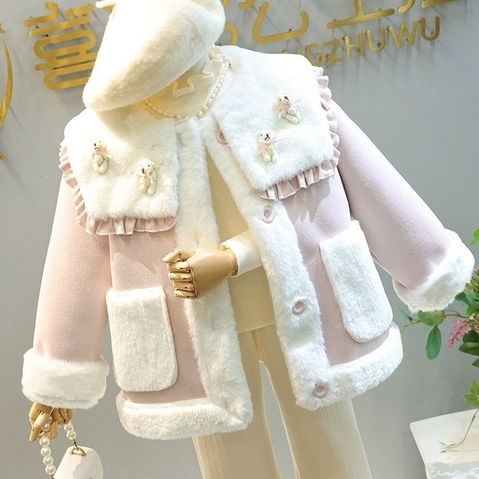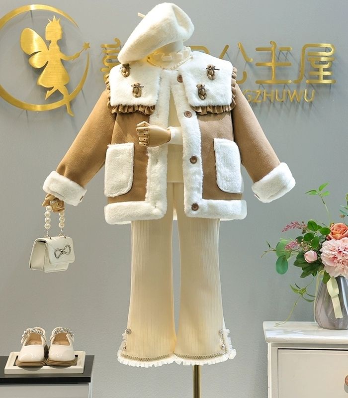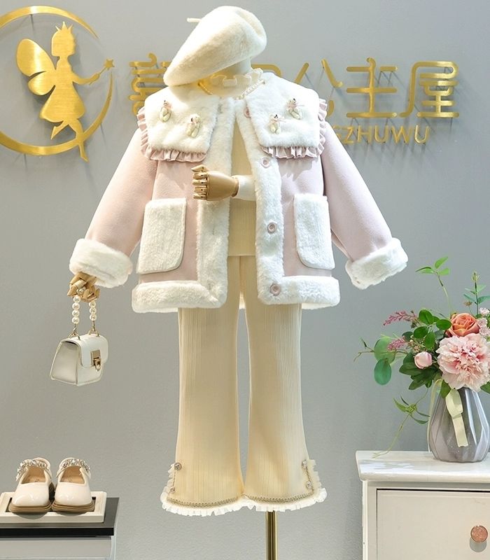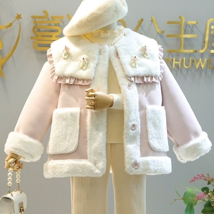女童冬季套装2023新款韩版女宝宝皮毛一体加绒加厚外套裤子两件套