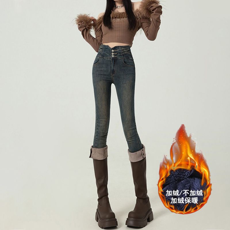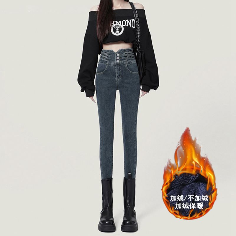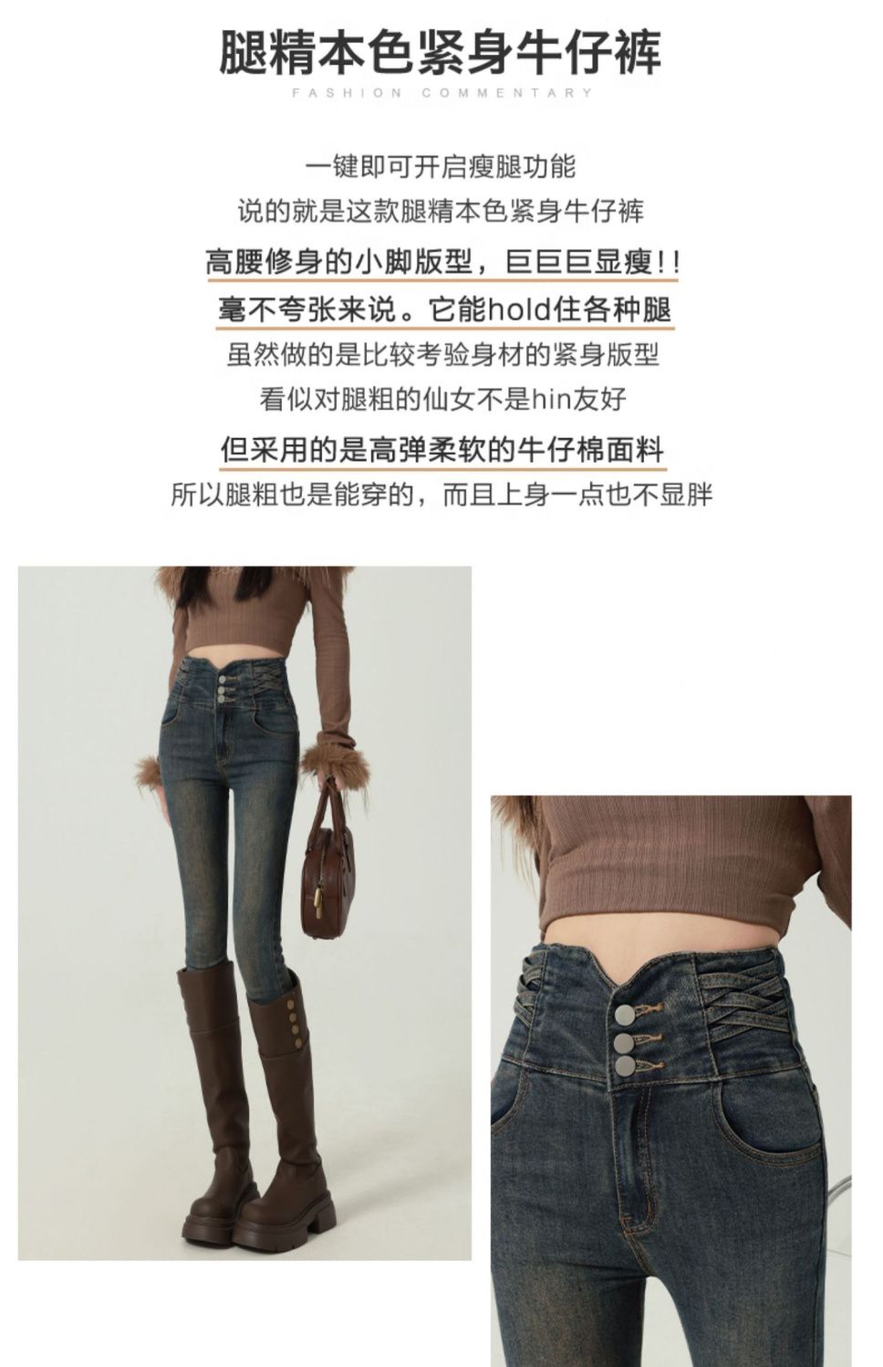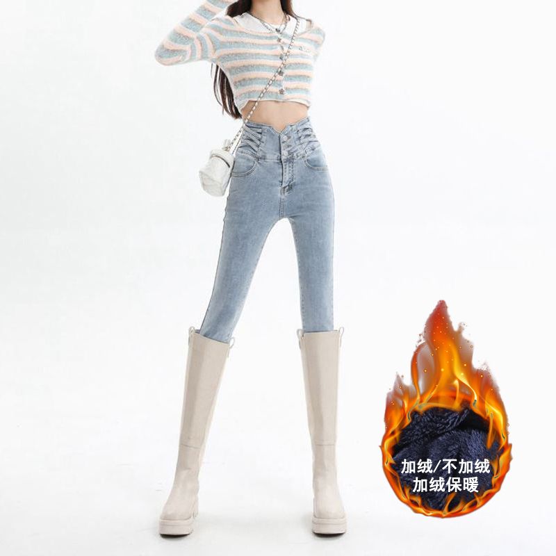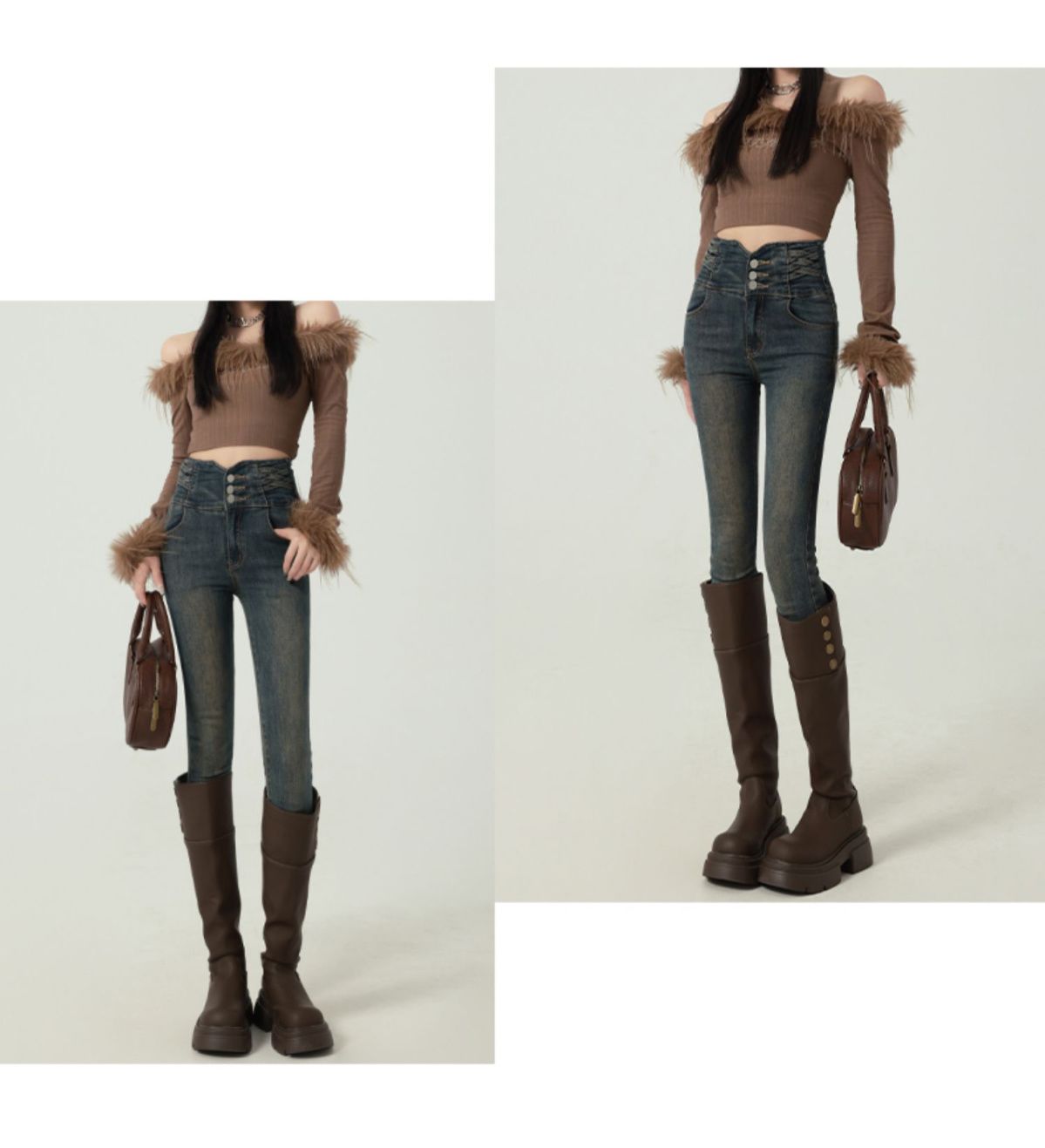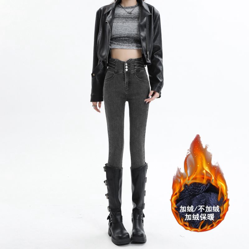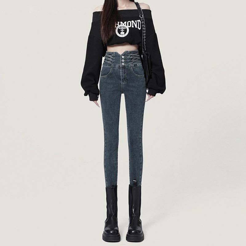 水泥灰牛仔裤女小脚裤秋冬季2024新款高腰修身紧身弹力显瘦铅笔裤