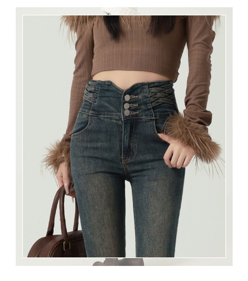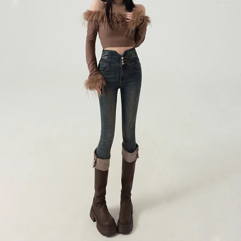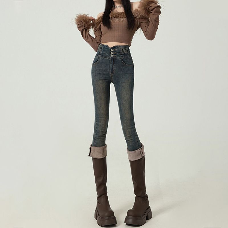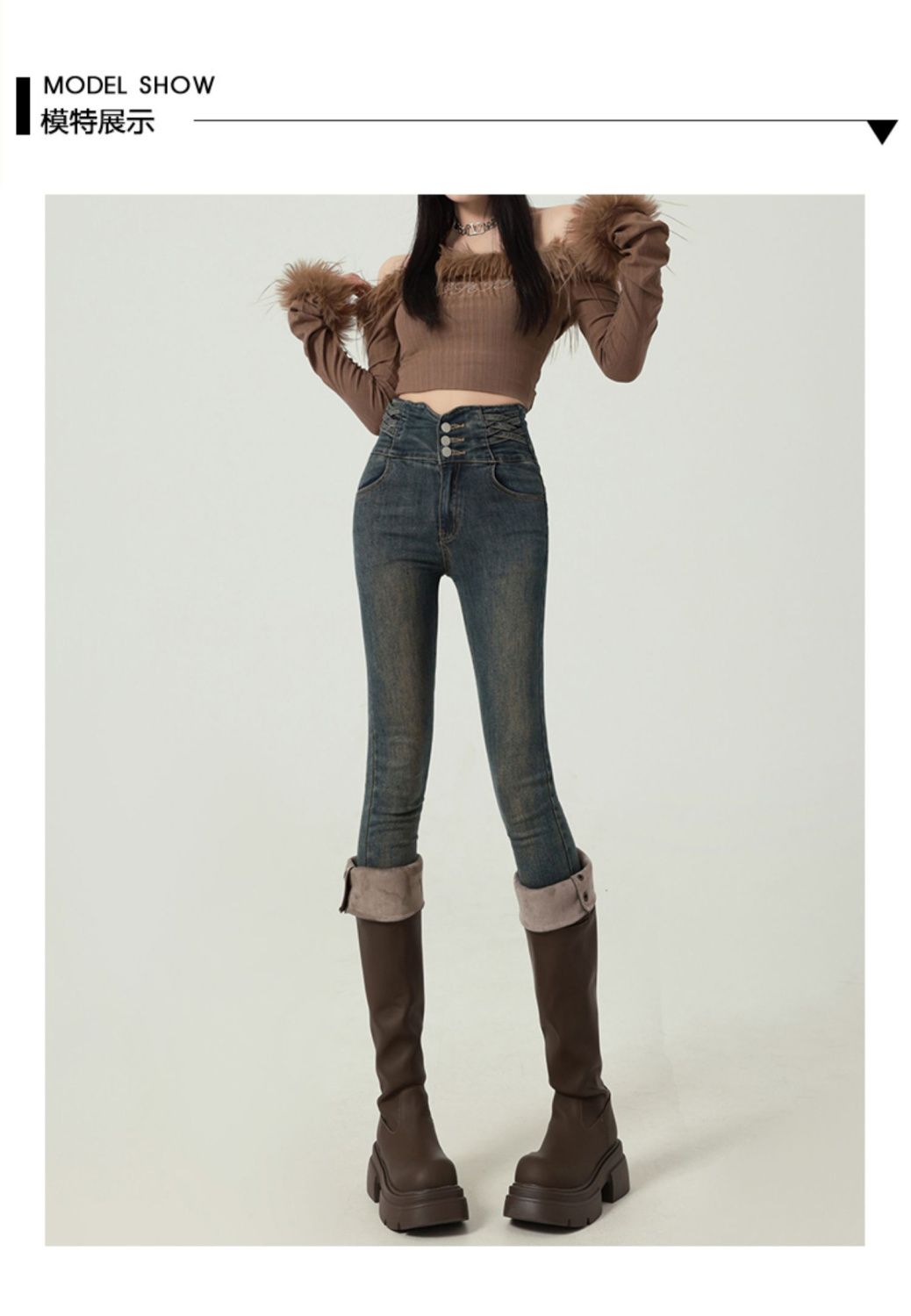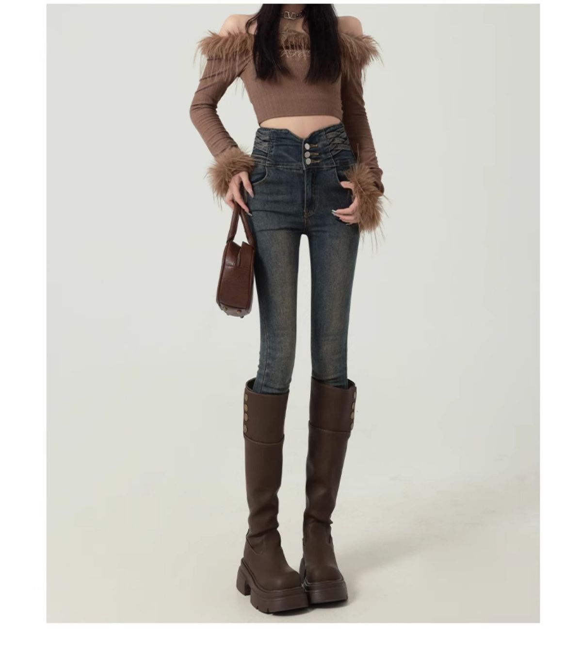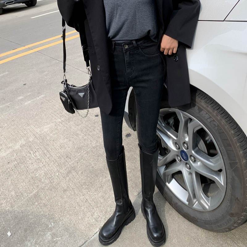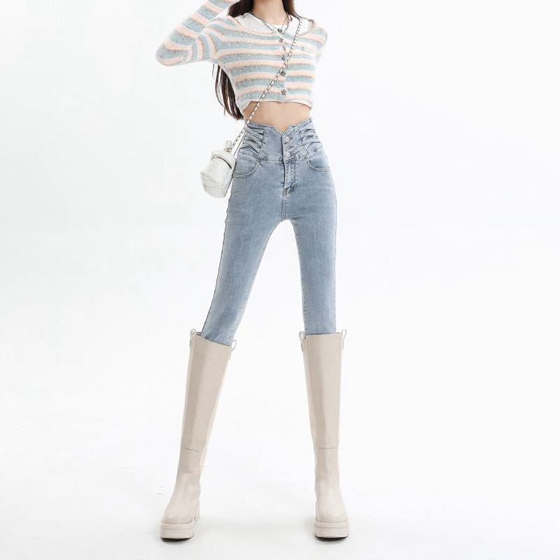 水泥灰牛仔裤女小脚裤秋冬季2024新款高腰修身紧身弹力显瘦铅笔裤