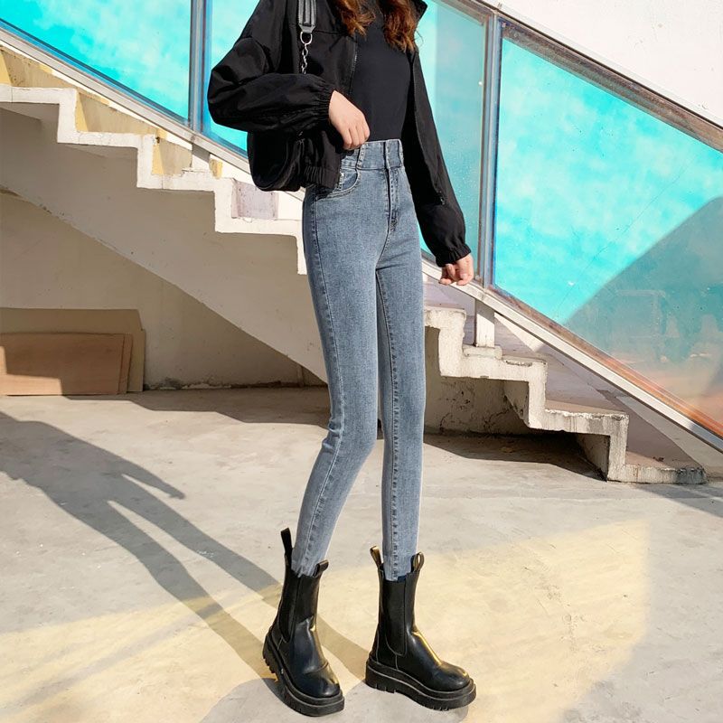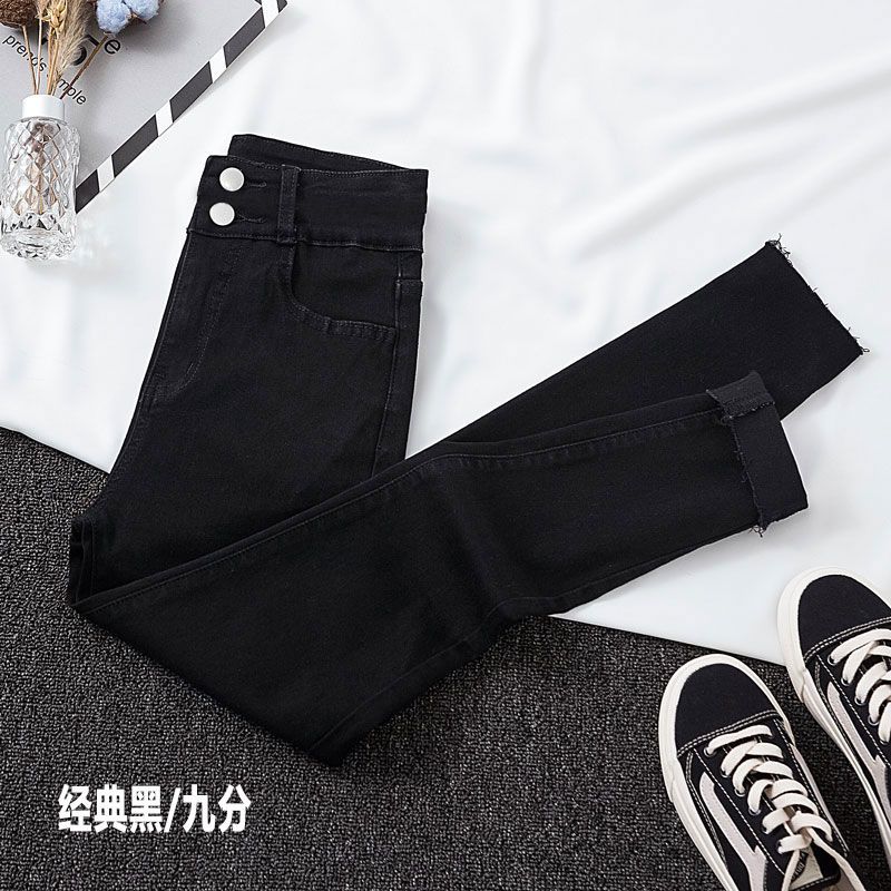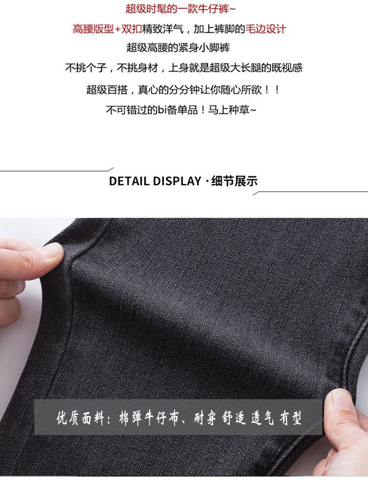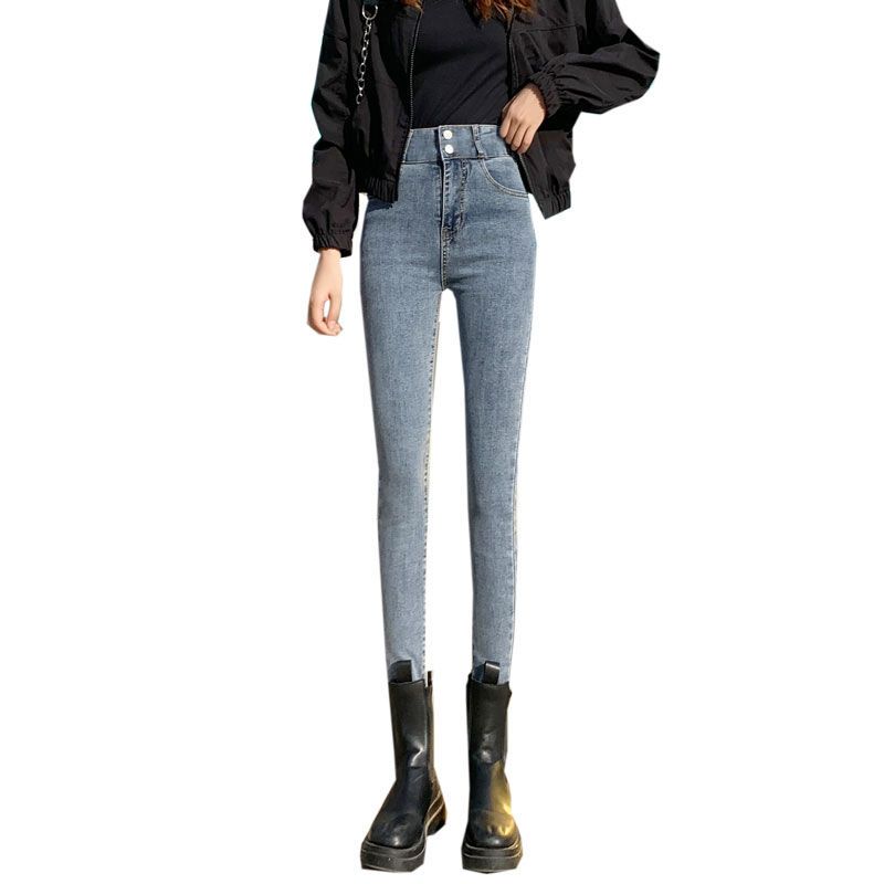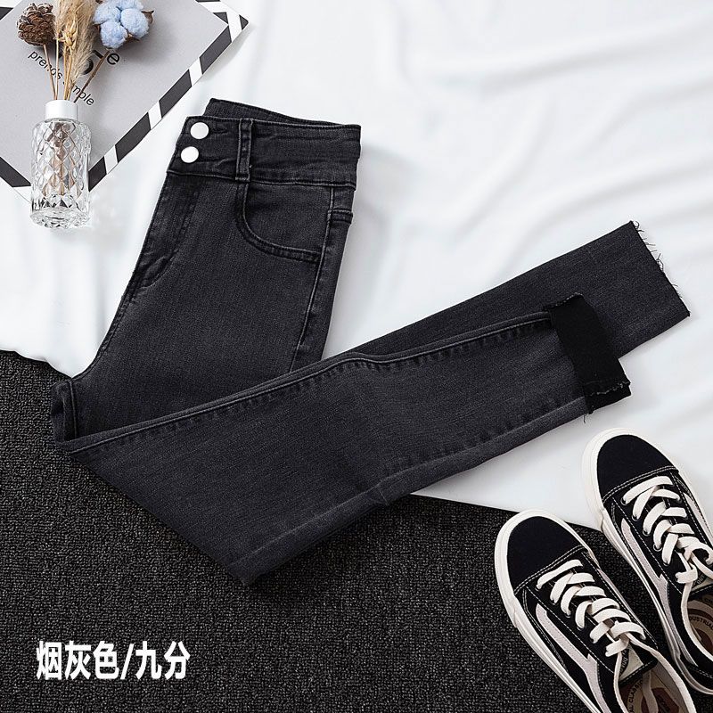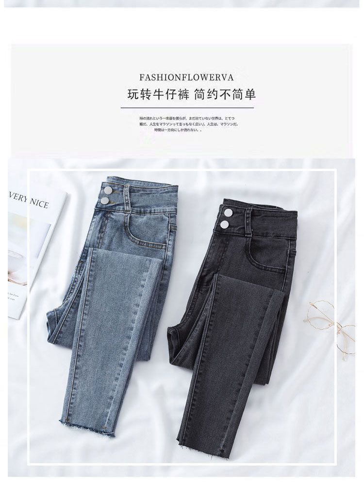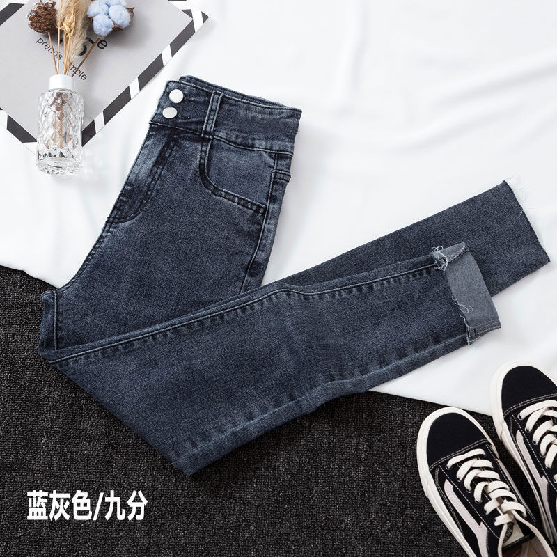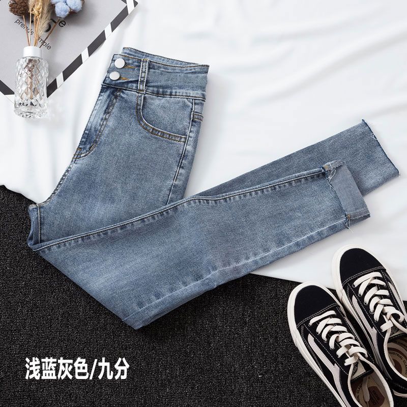 高腰双扣牛仔裤女显瘦显高2023年新款修身九分浅色紧身小脚裤子潮