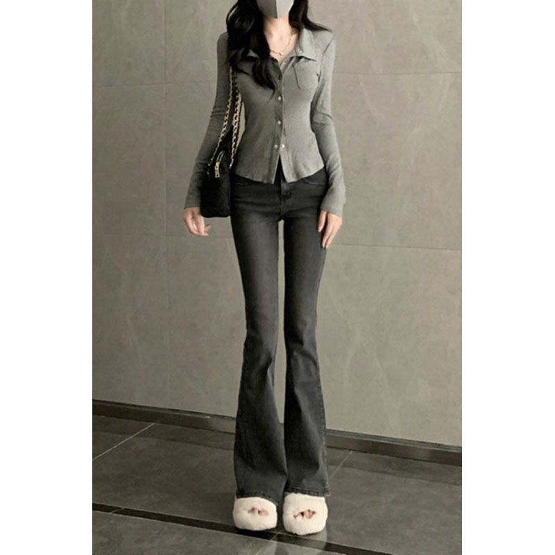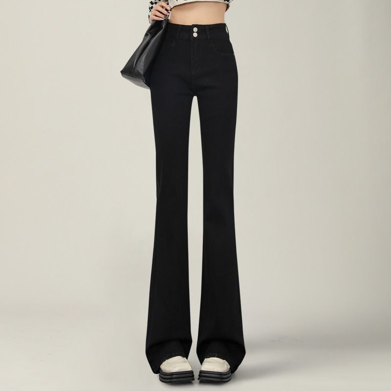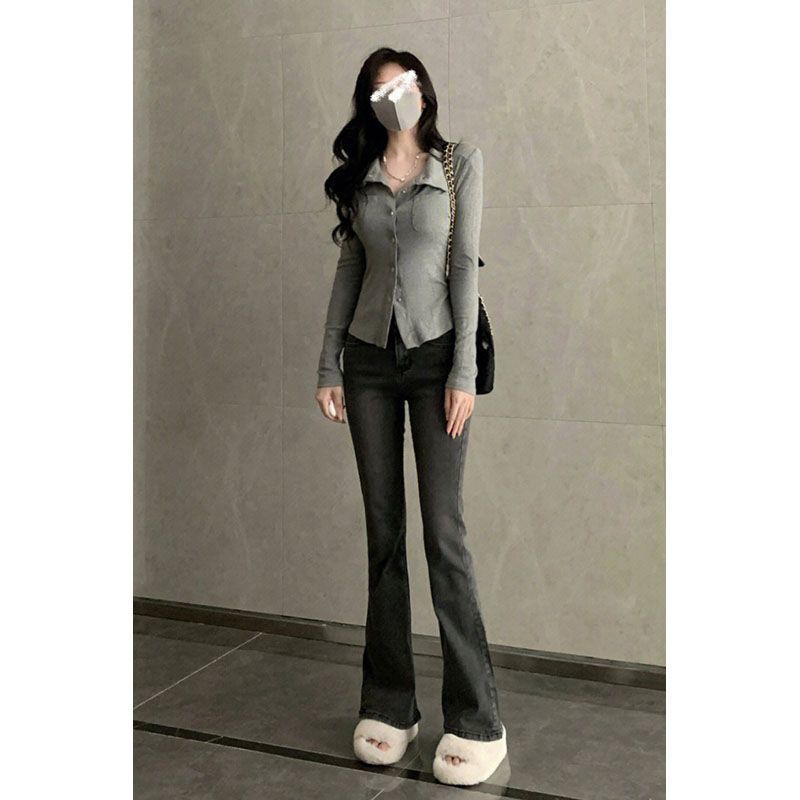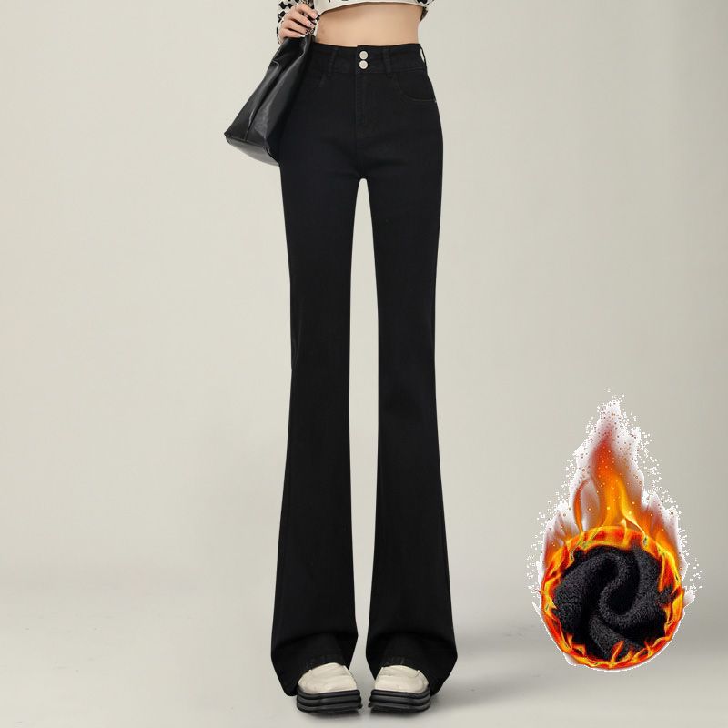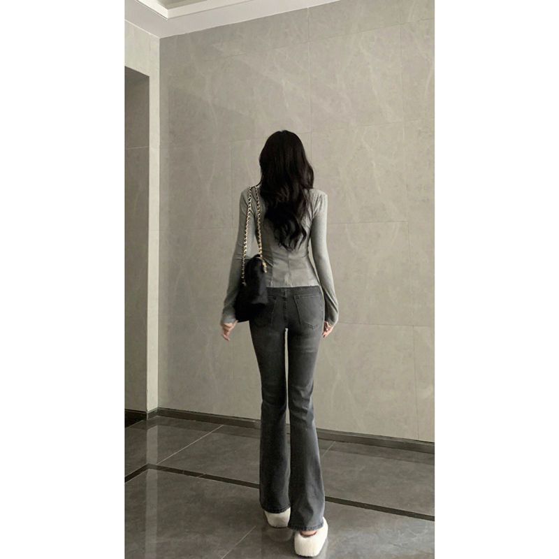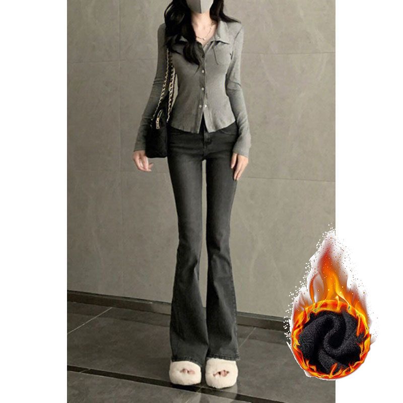 加绒加厚烟灰色高腰修身显瘦微喇叭牛仔裤女秋冬高个子加长拖地裤