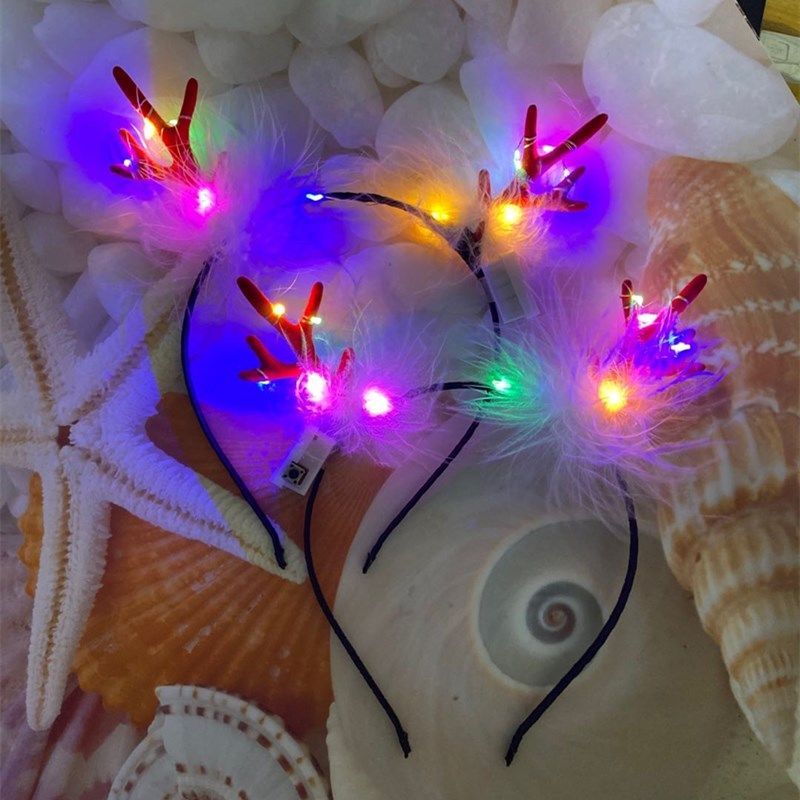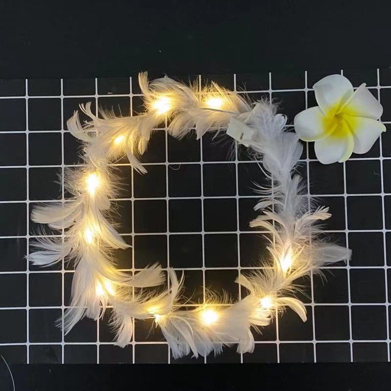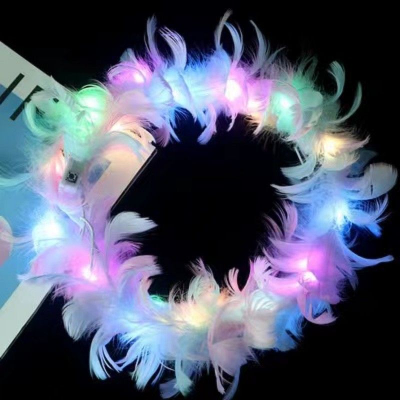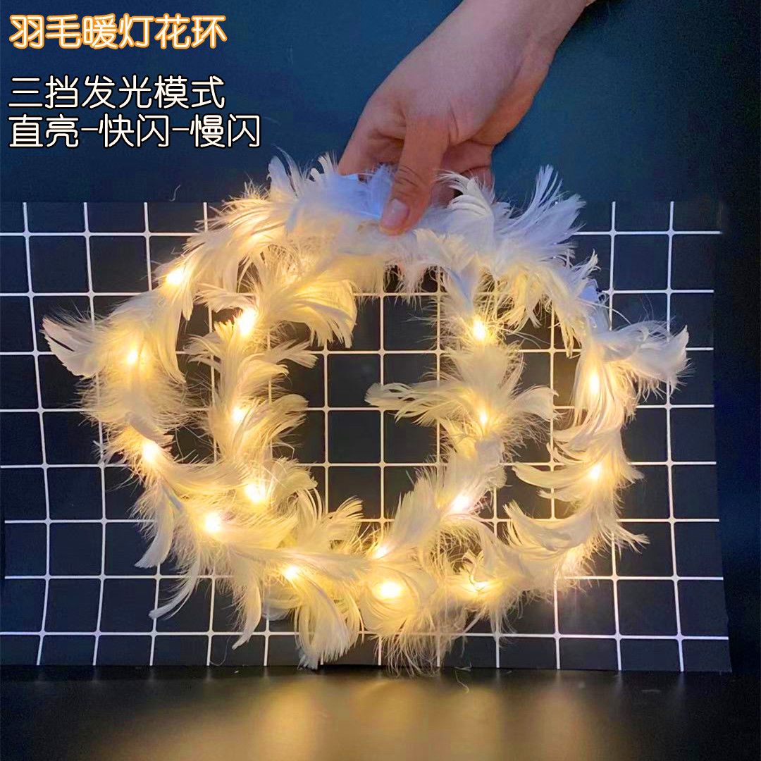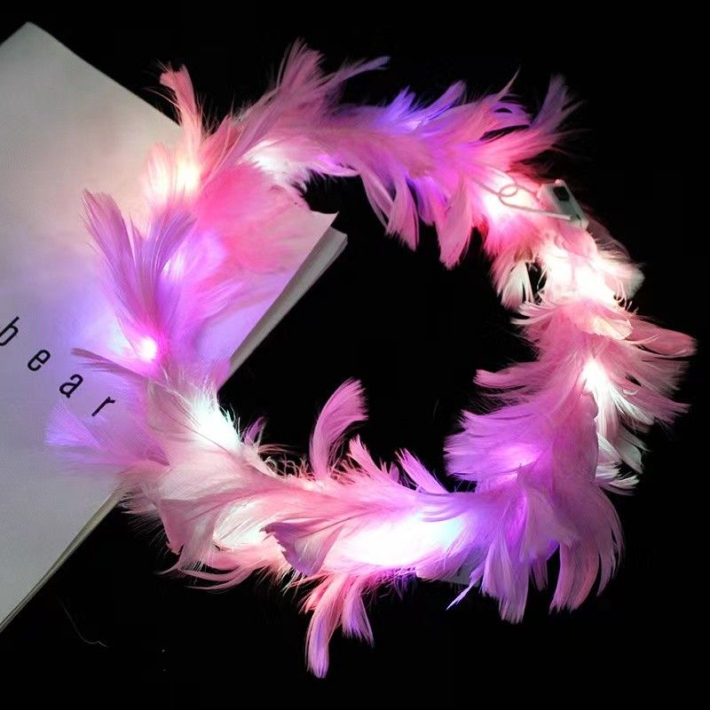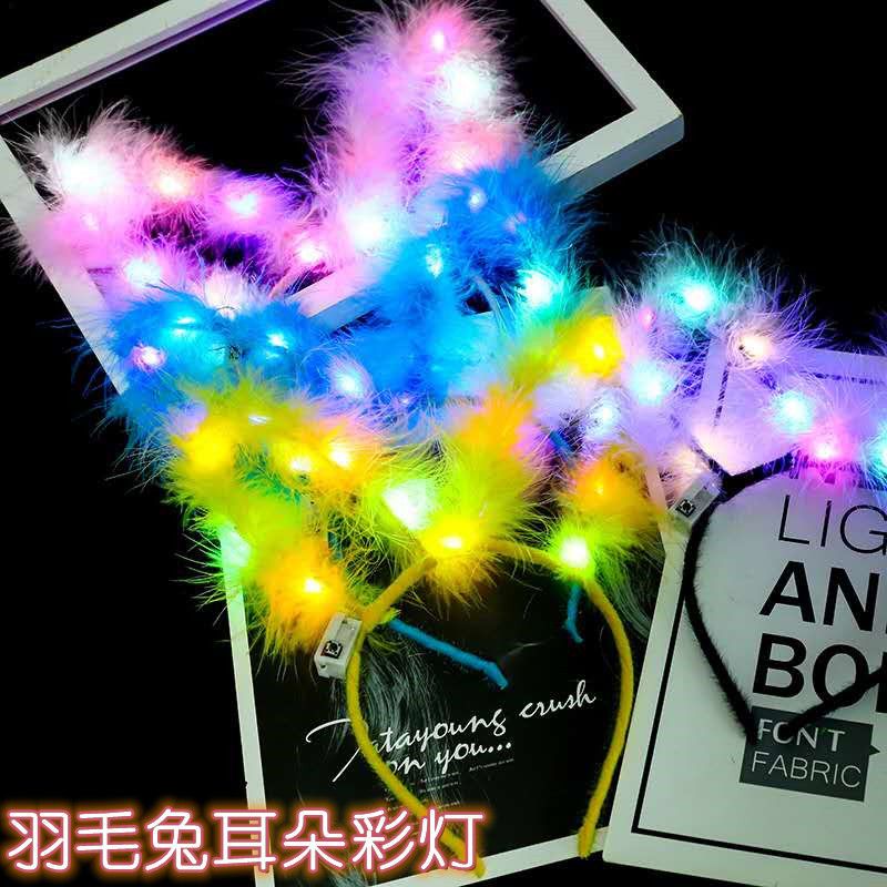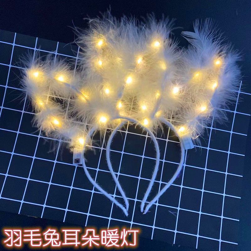 新款羽毛暖灯花环发光兔耳朵发箍节日晚会演出女学生头饰地摊批发