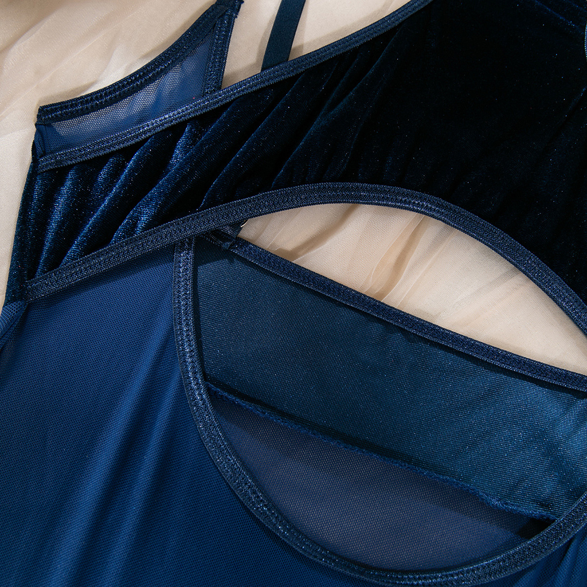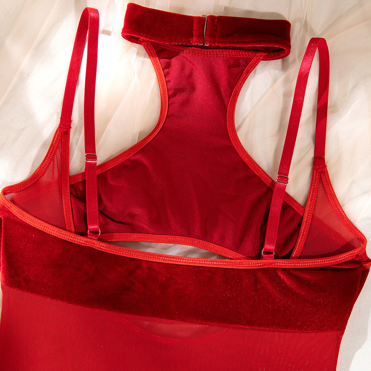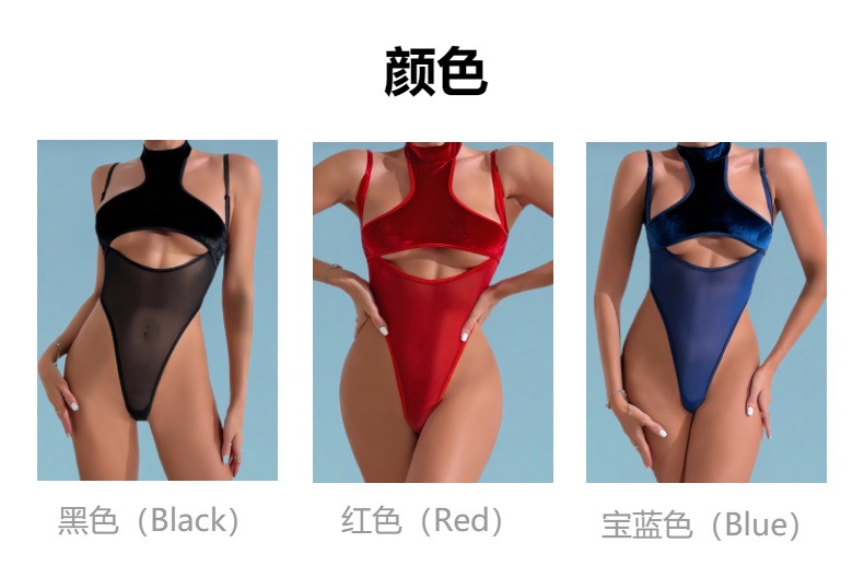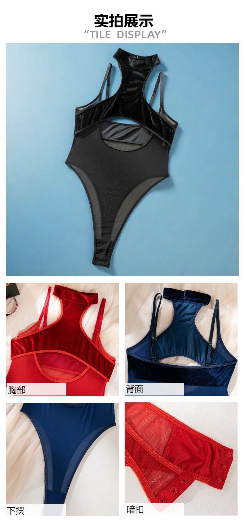 欧美亚马逊爆款女士性感挂脖网纱拼接性感镂空漏乳百搭连体衣现货