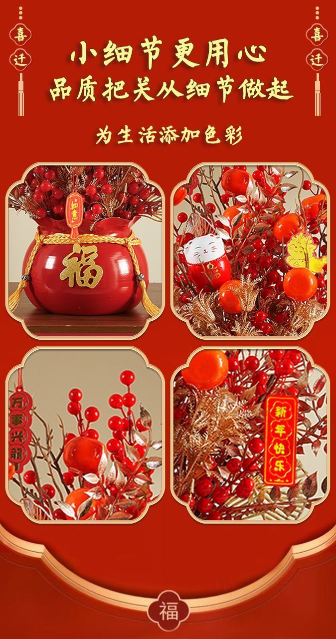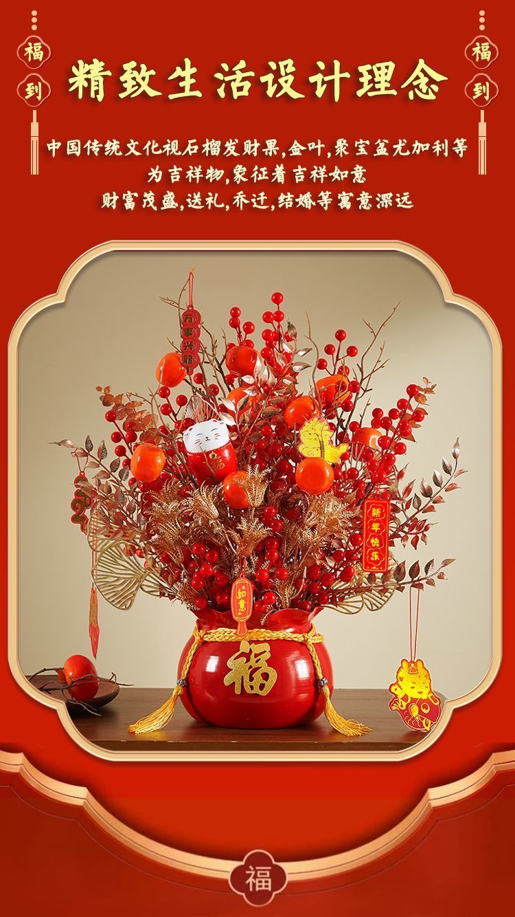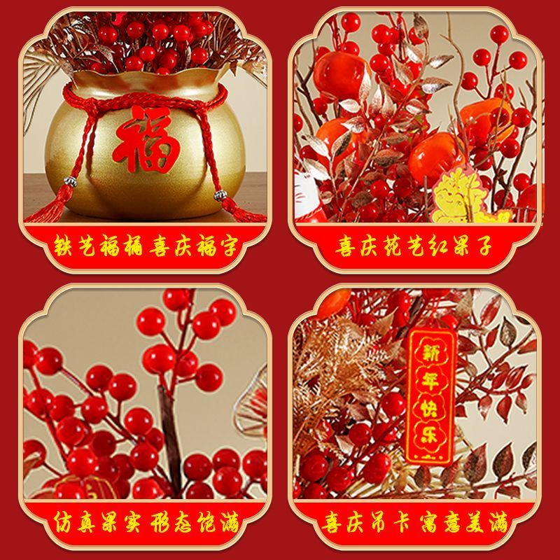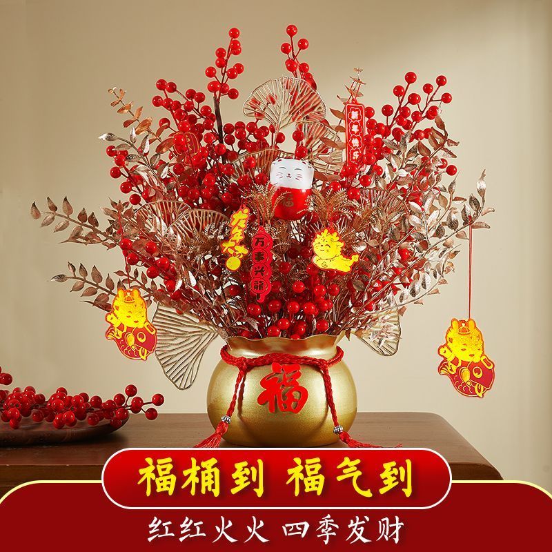年宵花福桶发财果摆件过年乔迁之喜装饰用品新居布置红果仿真花