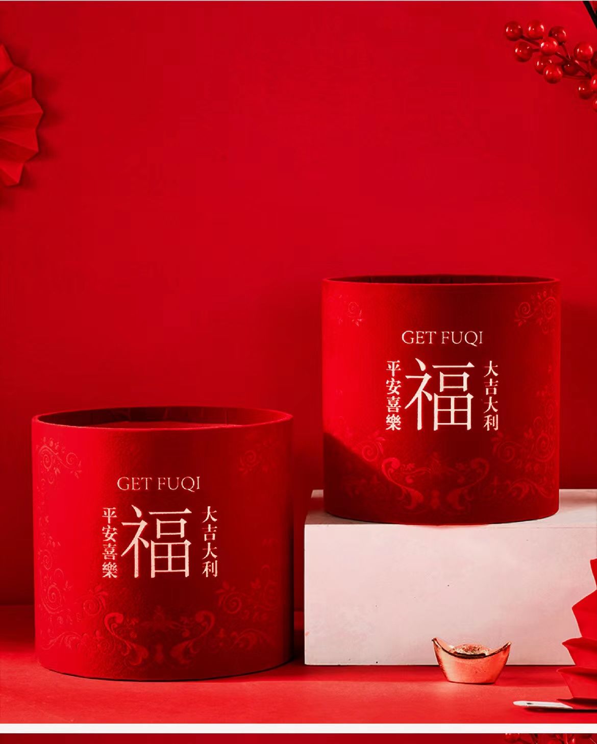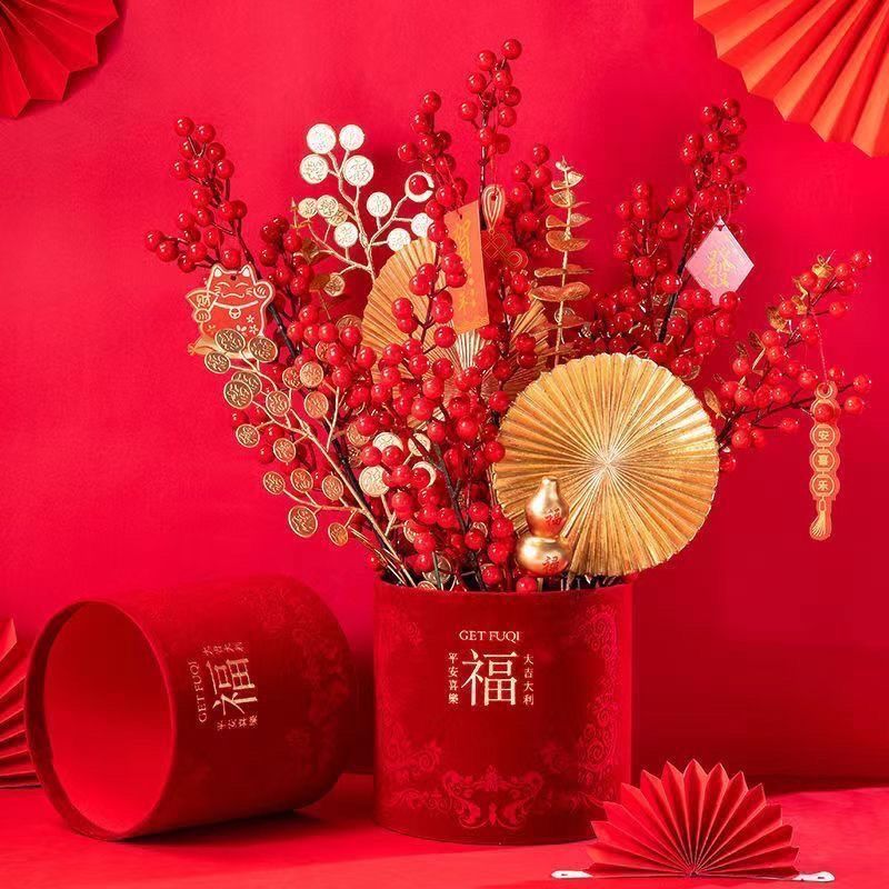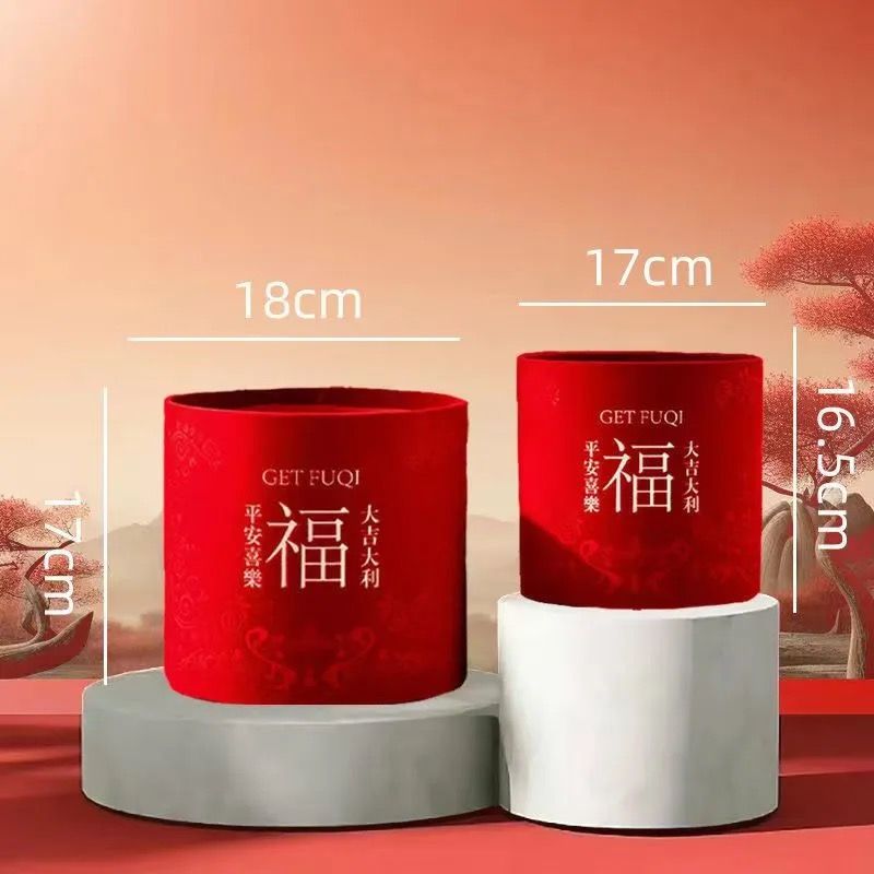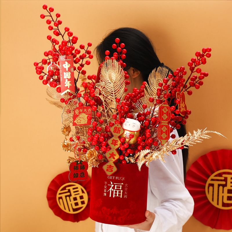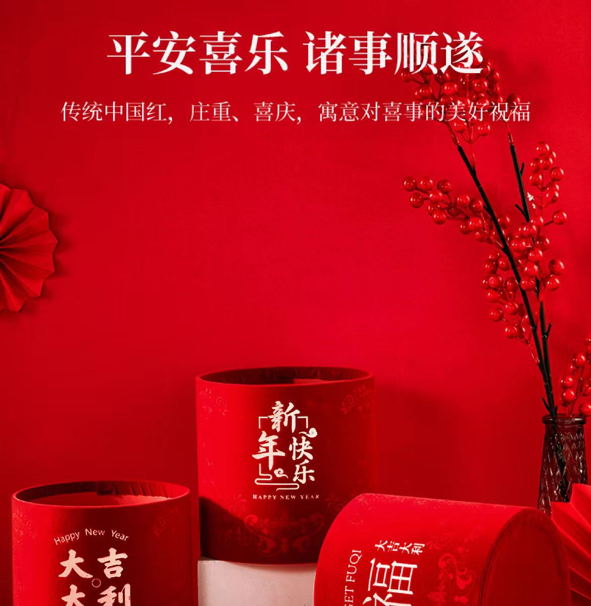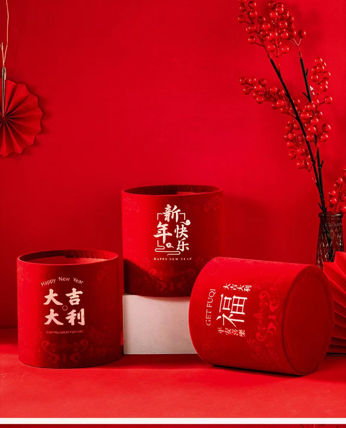 新年福桶抱抱桶虎年恭贺新春冬青银柳插花桶绒布年宵花盒花艺折扇