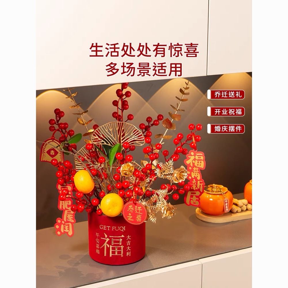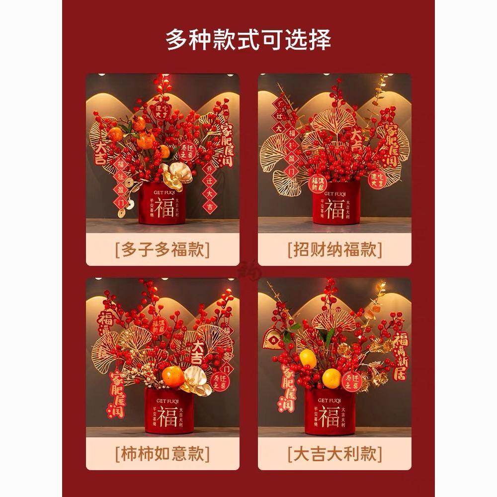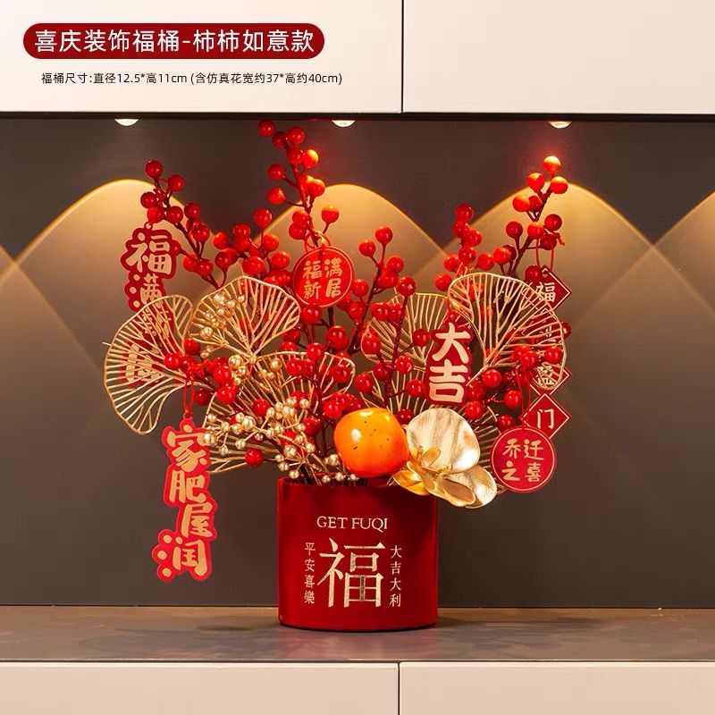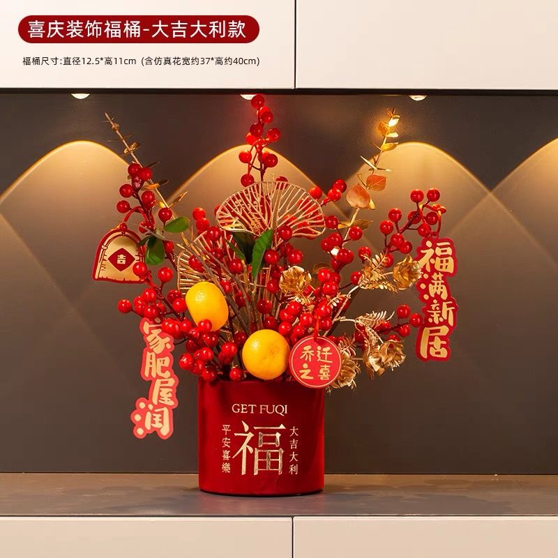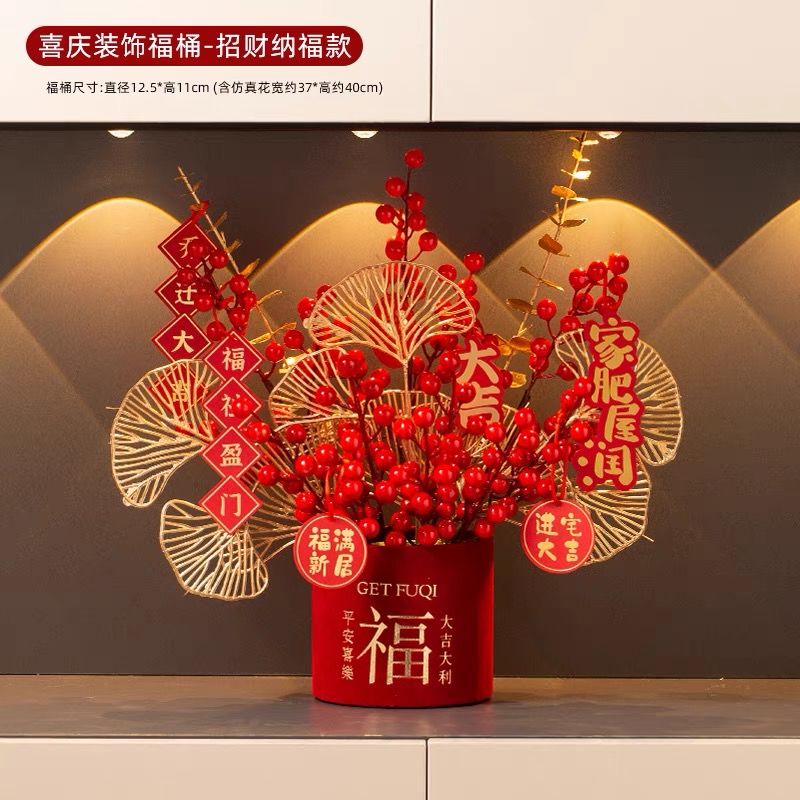 摆件新年抱抱红色福桶乔迁冬青银柳装饰插花发财花艺礼盒年宵花盒
