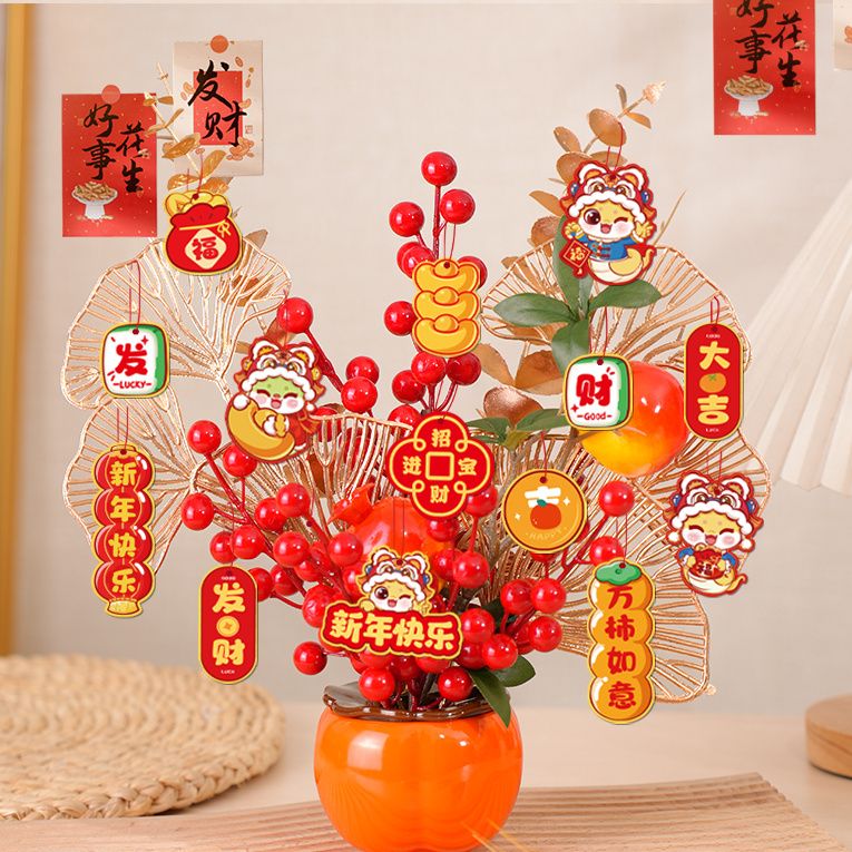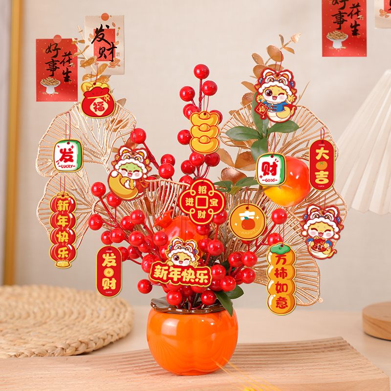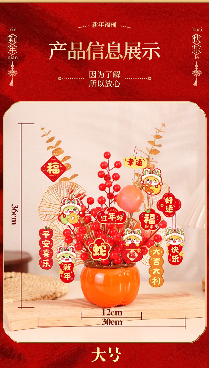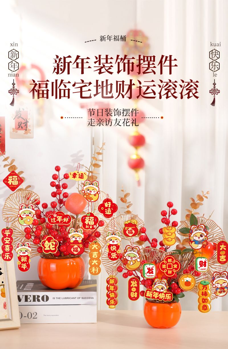 过年发财果仿真花柿子摆件新年氛围装饰品客厅春节蛇年假花福桶