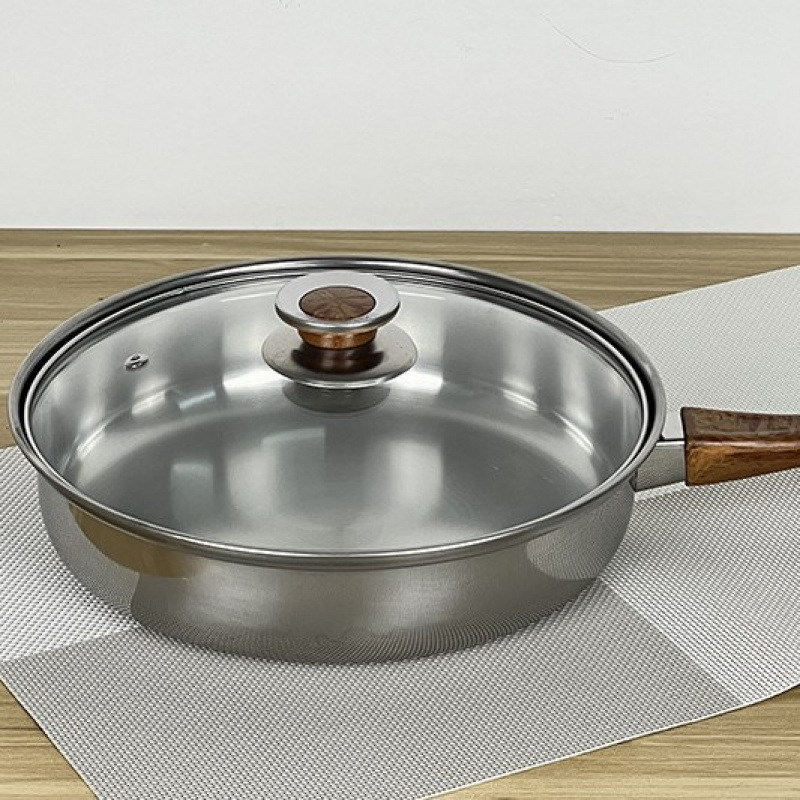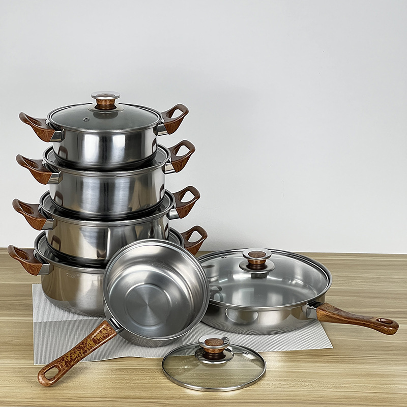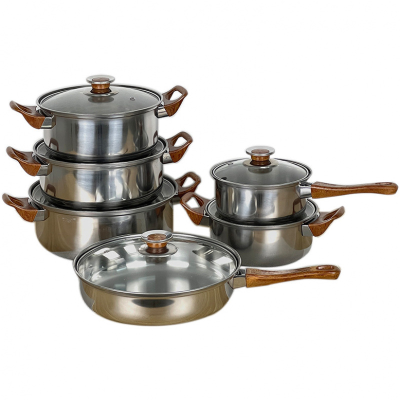 工厂 套装不锈钢锅具汤锅奶锅煎锅 木纹手柄可拆卸12pcs cookware