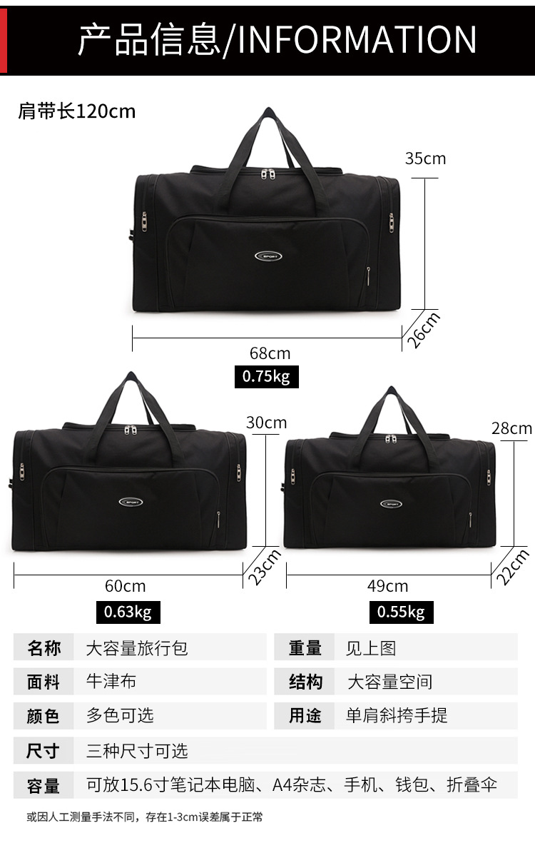 批发大中小款旅行包,牛津布面料,多色可选,包包尺寸,小号长50宽22高28,中号,长60宽23高30,大号长70宽26高35厘米,拍图测量尺寸有1—3厘米误差,以包包实际尺寸为准,介意勿拍
